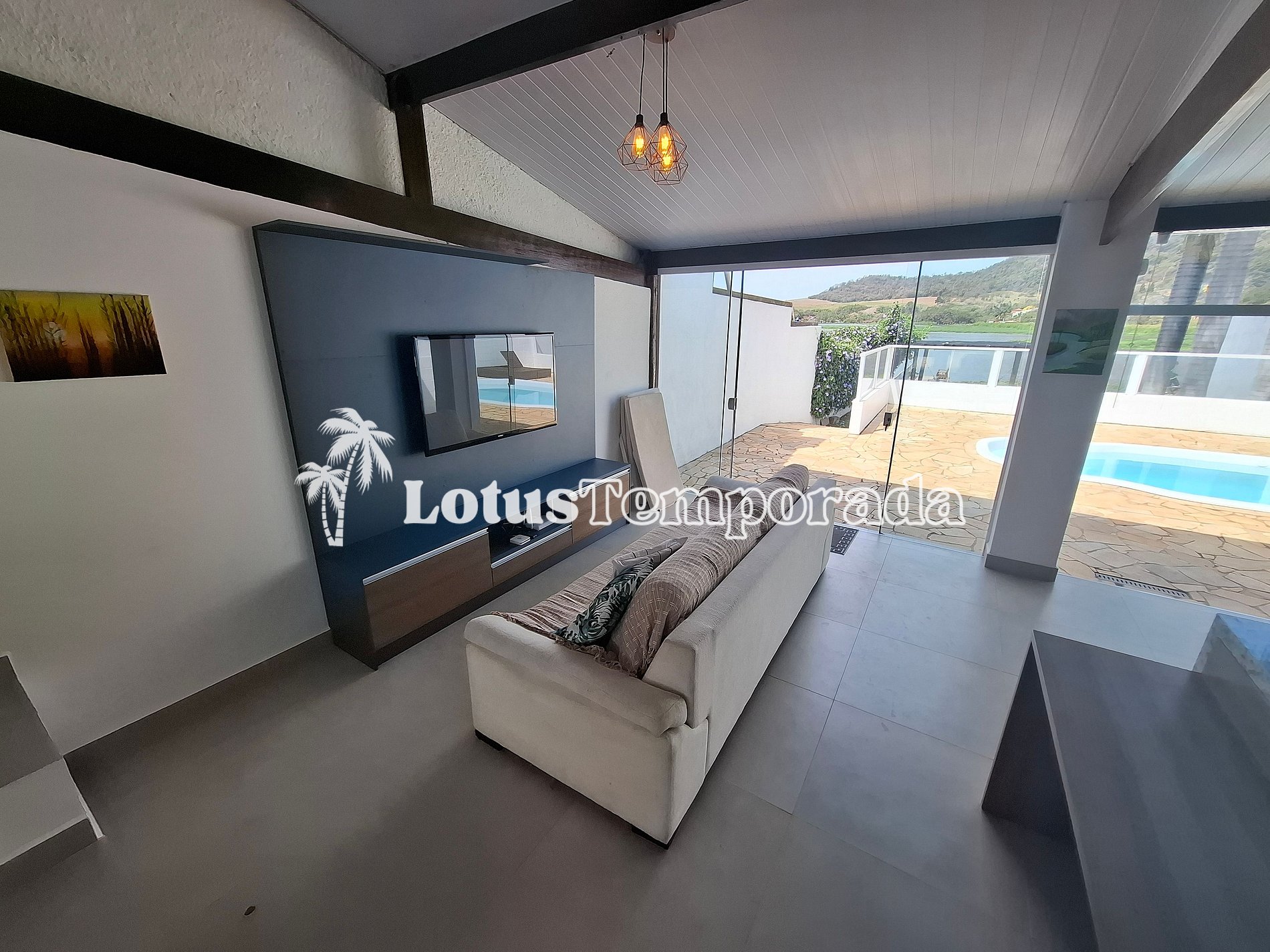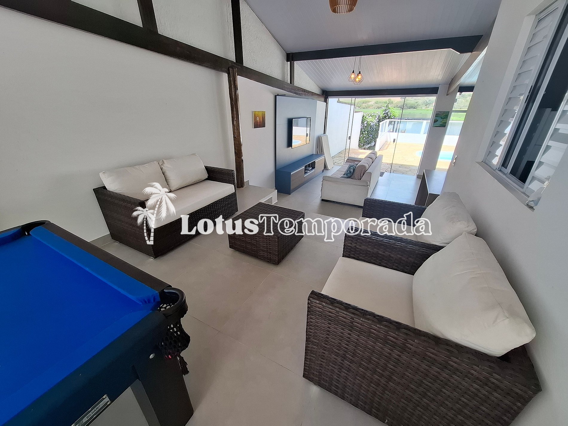 A propriedade conta com 3 dormitórios, sendo 1 suíte, além de banheiro social e lavabo na área de churrasco. A cozinha é totalmente equipada e integrada ao espaço de convivência, que inclui sala de TV e mesa de sinuca, tudo cercado por amplas portas de vidro que proporcionam iluminação natural e conexão direta com a área da piscina.