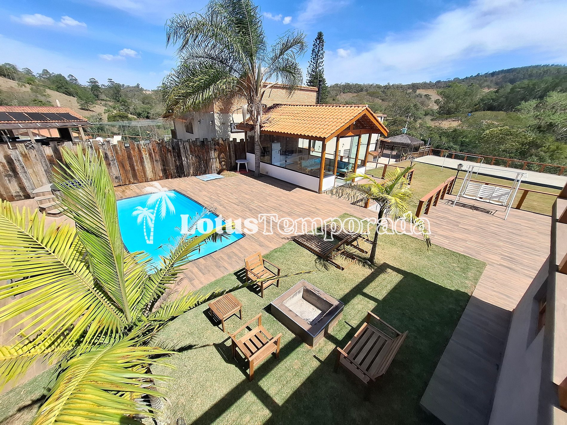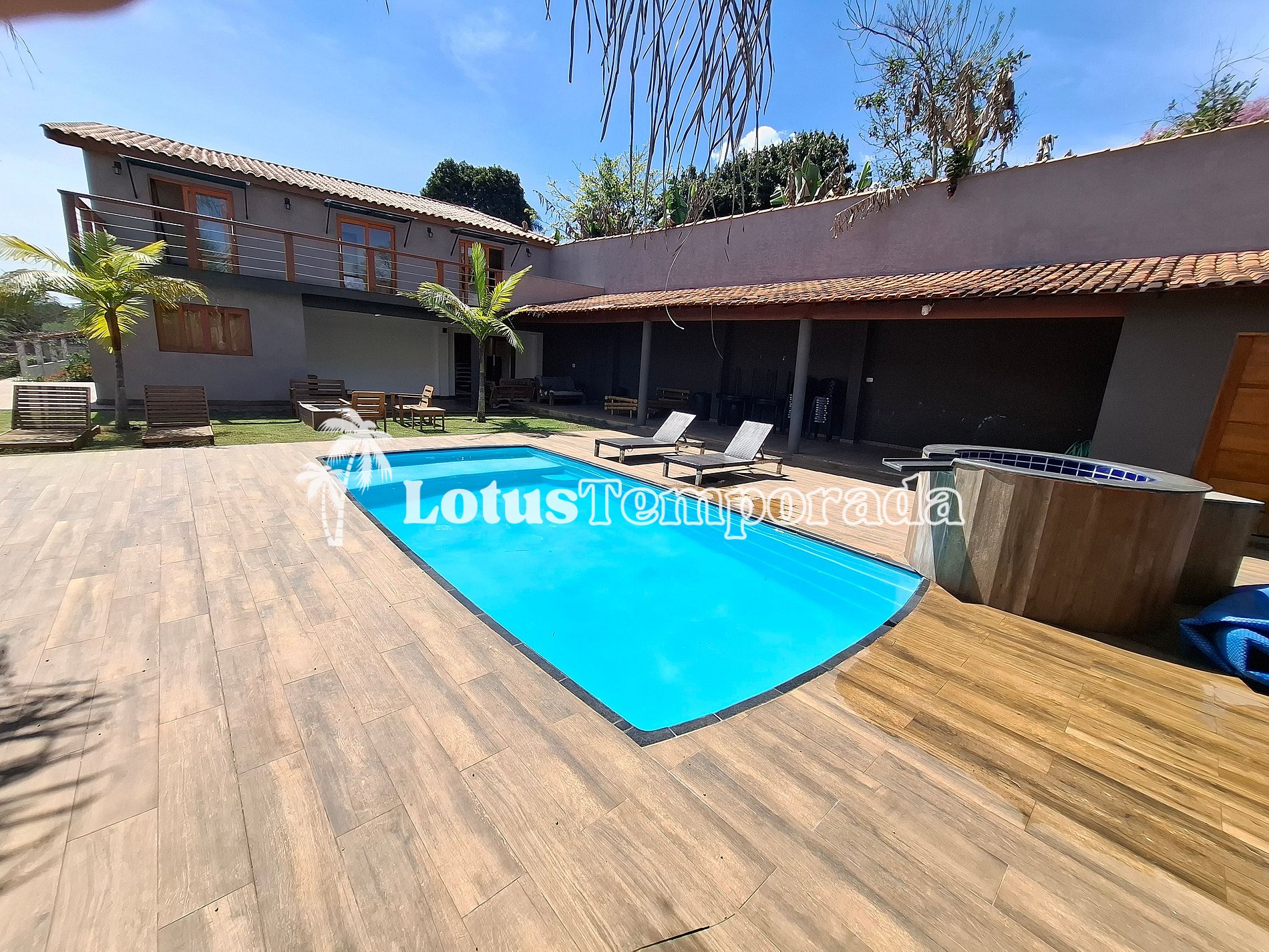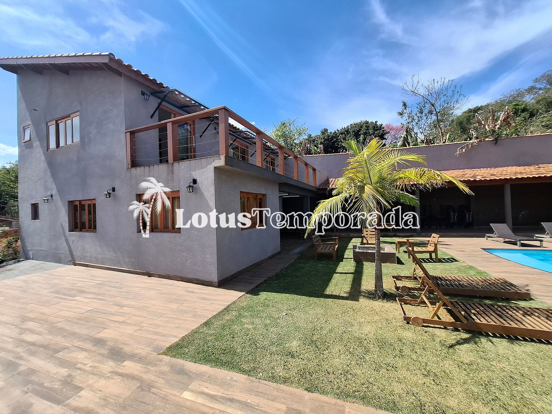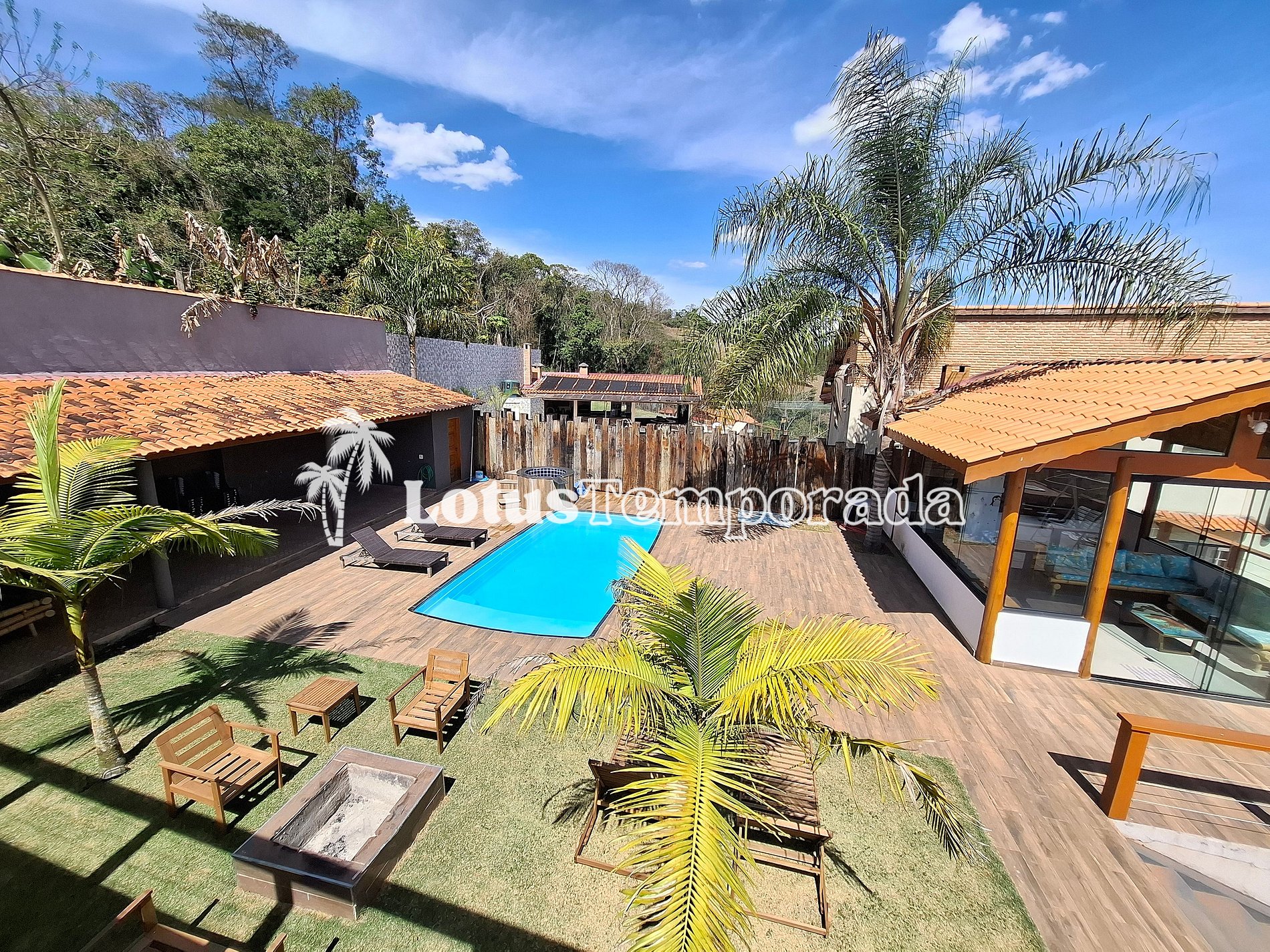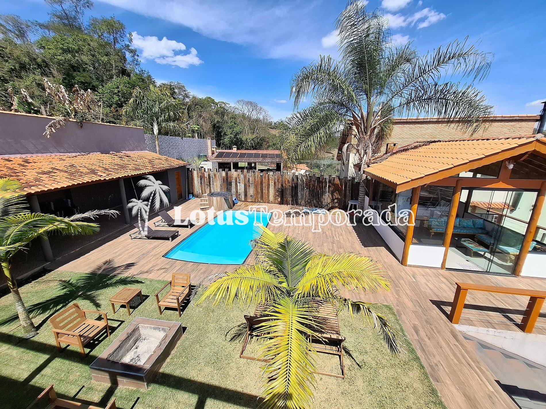 Chácara em condomínio fechado em Atibaia, perfeita para grupos de até 12 pessoas. Conta com 5 dormitórios, sendo 1 suíte e 1 externo, sala ampla, cozinha americana, varanda, espaço gourmet, piscina com cascata, jacuzzi, fogueira e área gramada. Ideal para famílias que buscam conforto, lazer e momentos inesquecíveis.