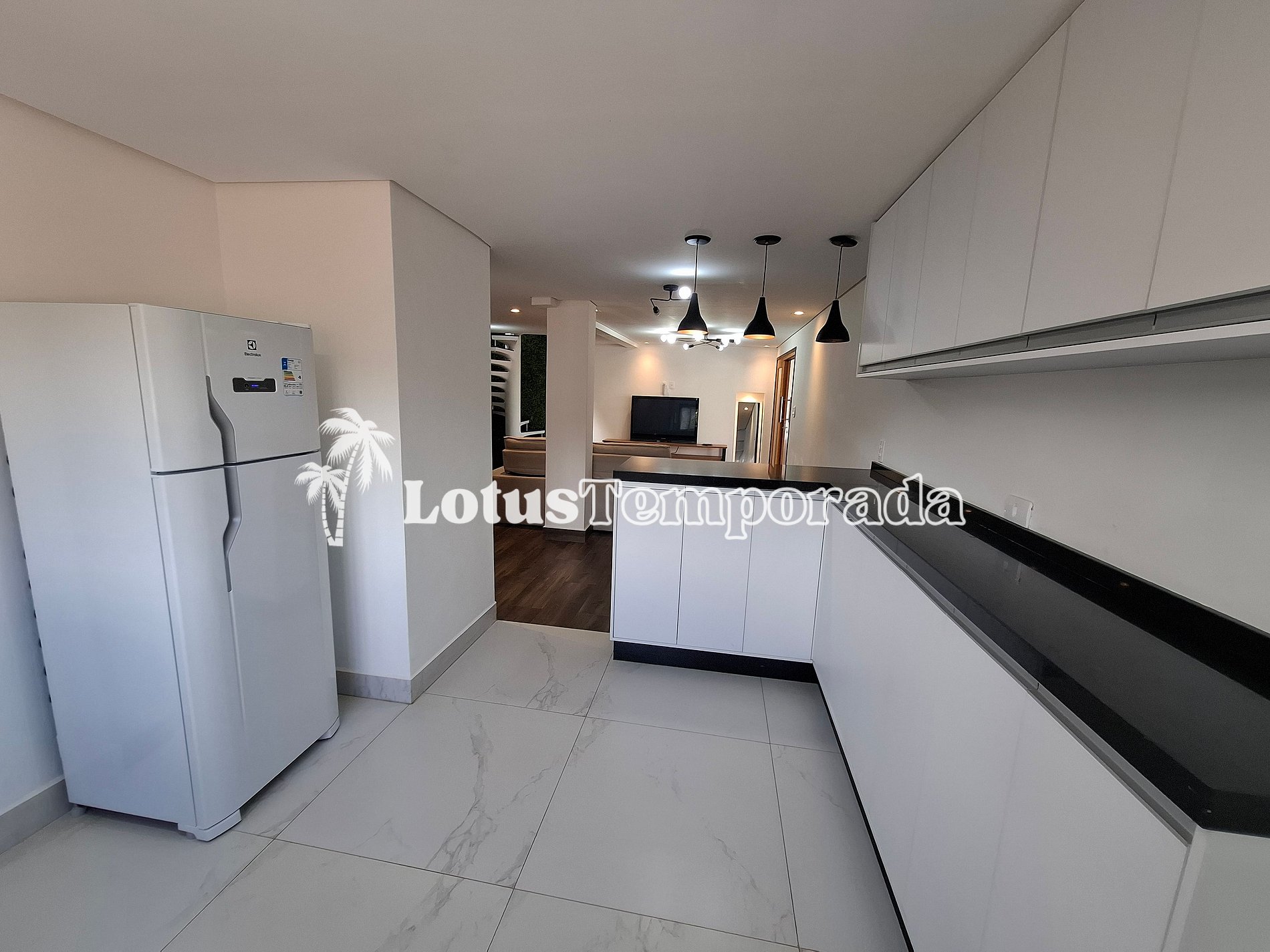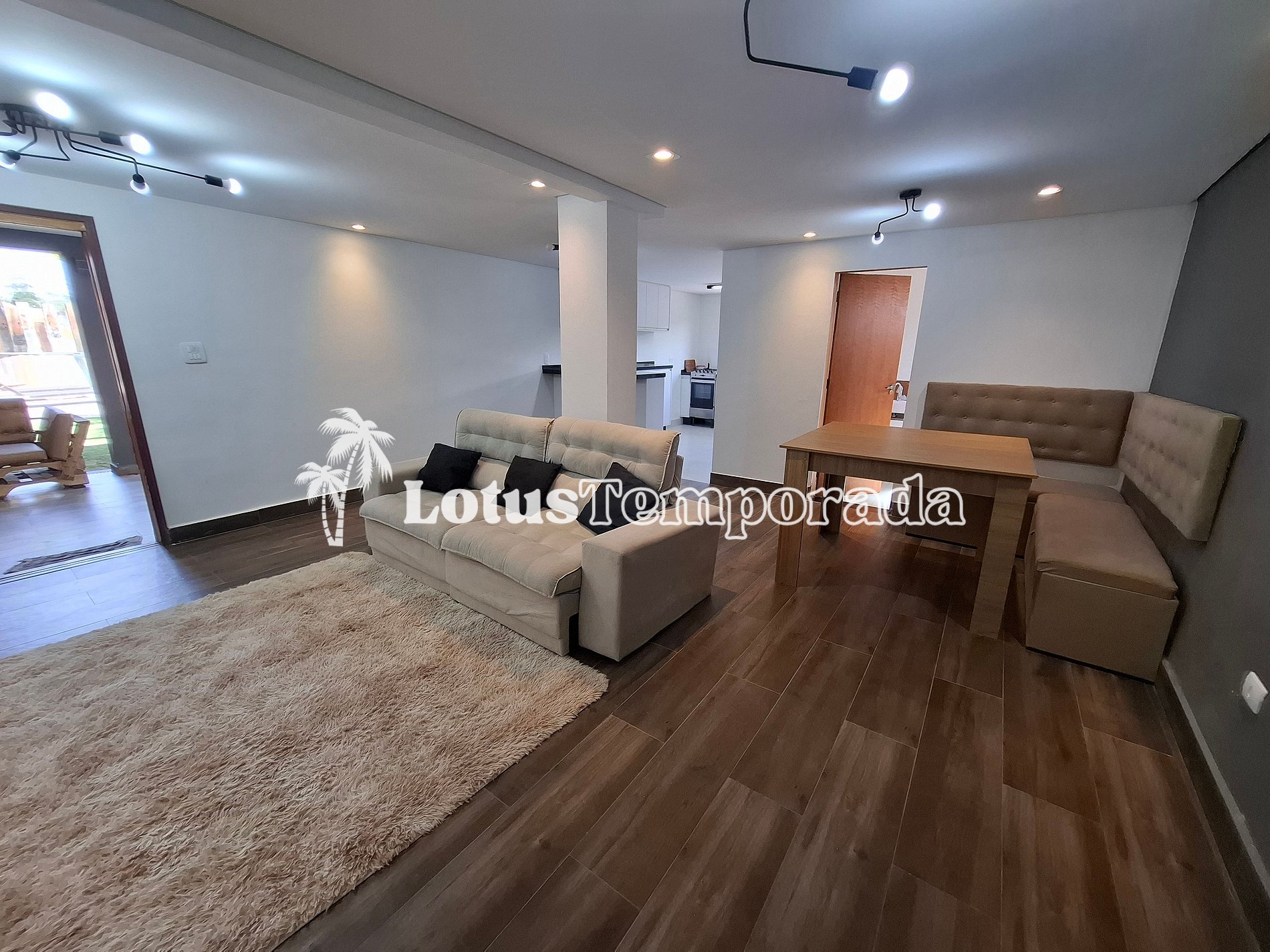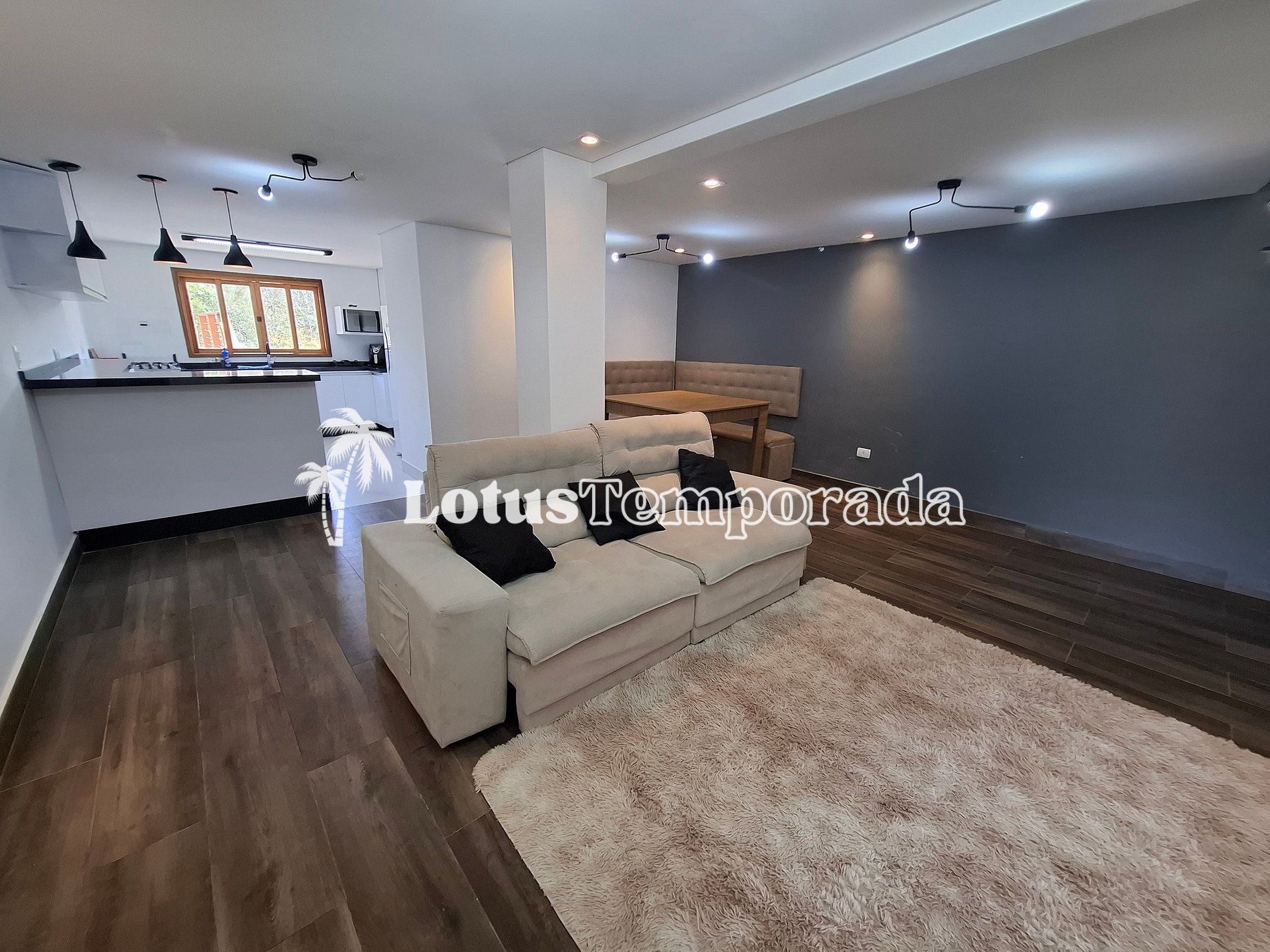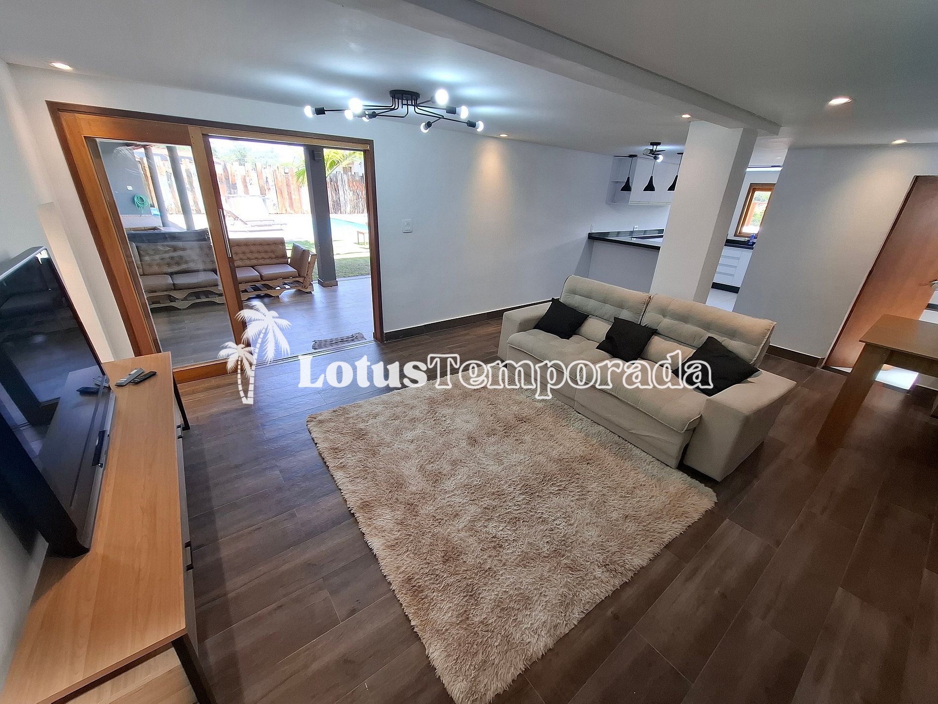 A sala ampla e a cozinha americana criam um ambiente integrado e aconchegante, perfeito para refeições e momentos de convívio. Além disso, há um banheiro social e um lavabo para maior comodidade dos hóspedes.