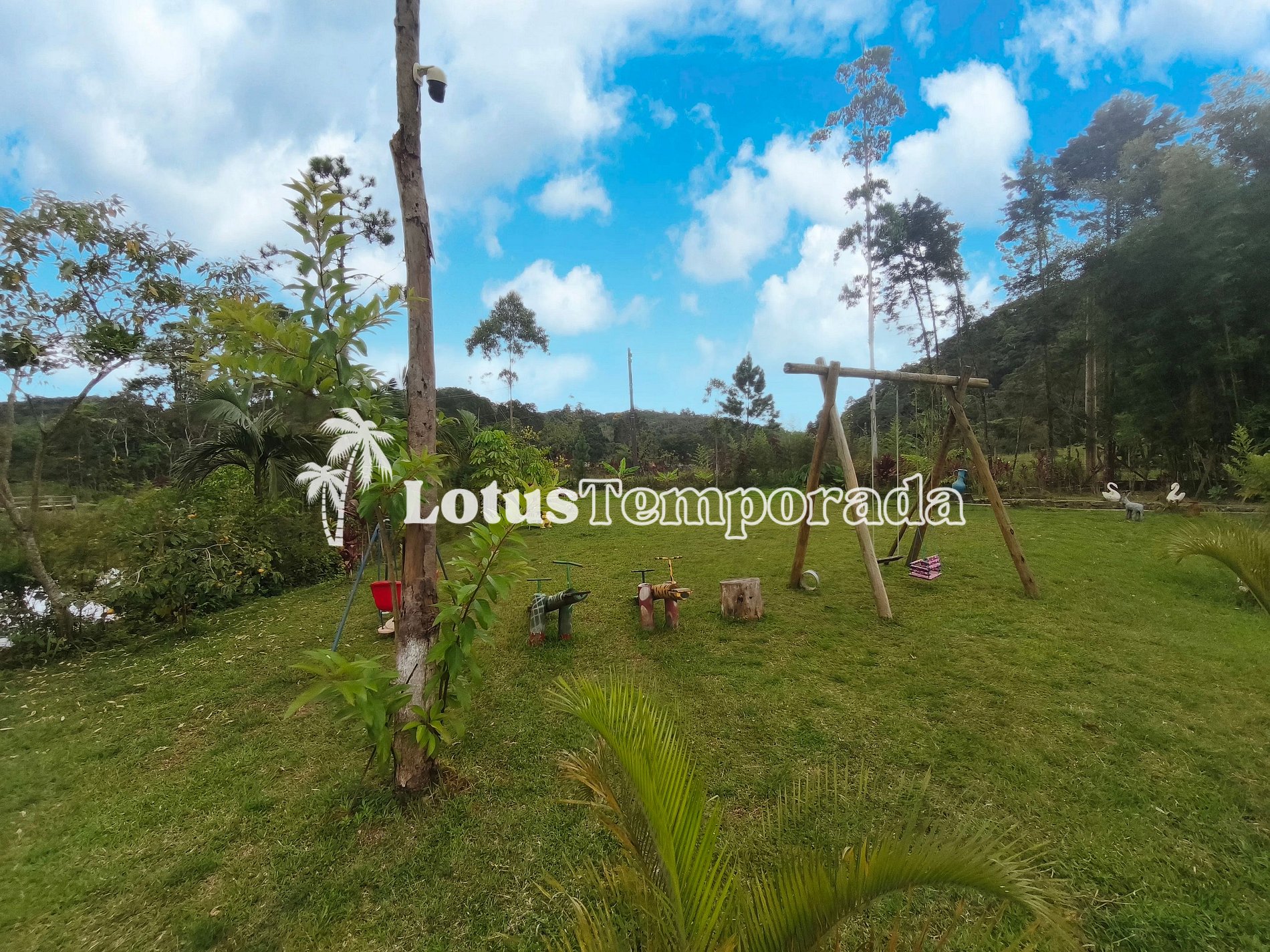 Chácara completa com 4 suítes, sala de TV, cozinha equipada, área gourmet com churrasqueira, forno e fogão a lenha. Piscina com cascata e prainha, playground, lagos ornamentais e área gramada. Acomoda até 20 pessoas com conforto.