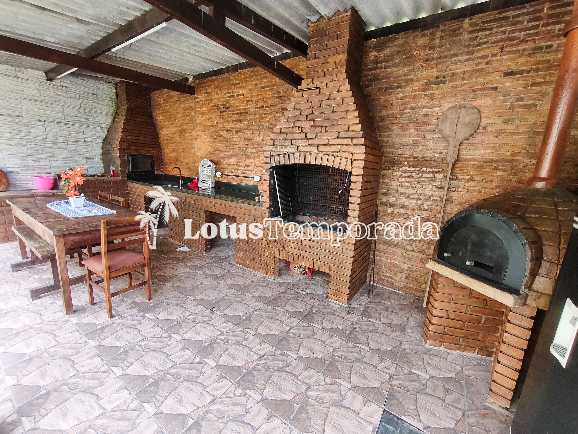 • Área de churrasco completa, com churrasqueira, forno de pizza e fogão a lenha