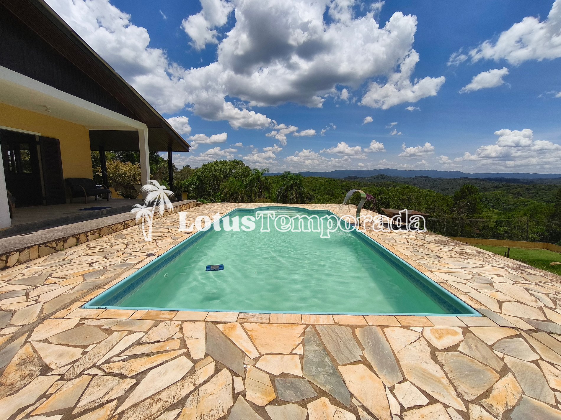 A casa principal possui 4 dormitórios, incluindo 1 suíte, além de 1 banheiro social e uma sala ampla com dois ambientes, integrando sala de jantar e sala de TV com muito conforto. A cozinha é funcional e bem equipada, enquanto a varanda proporciona uma vista espetacular para a piscina e para as montanhas.
