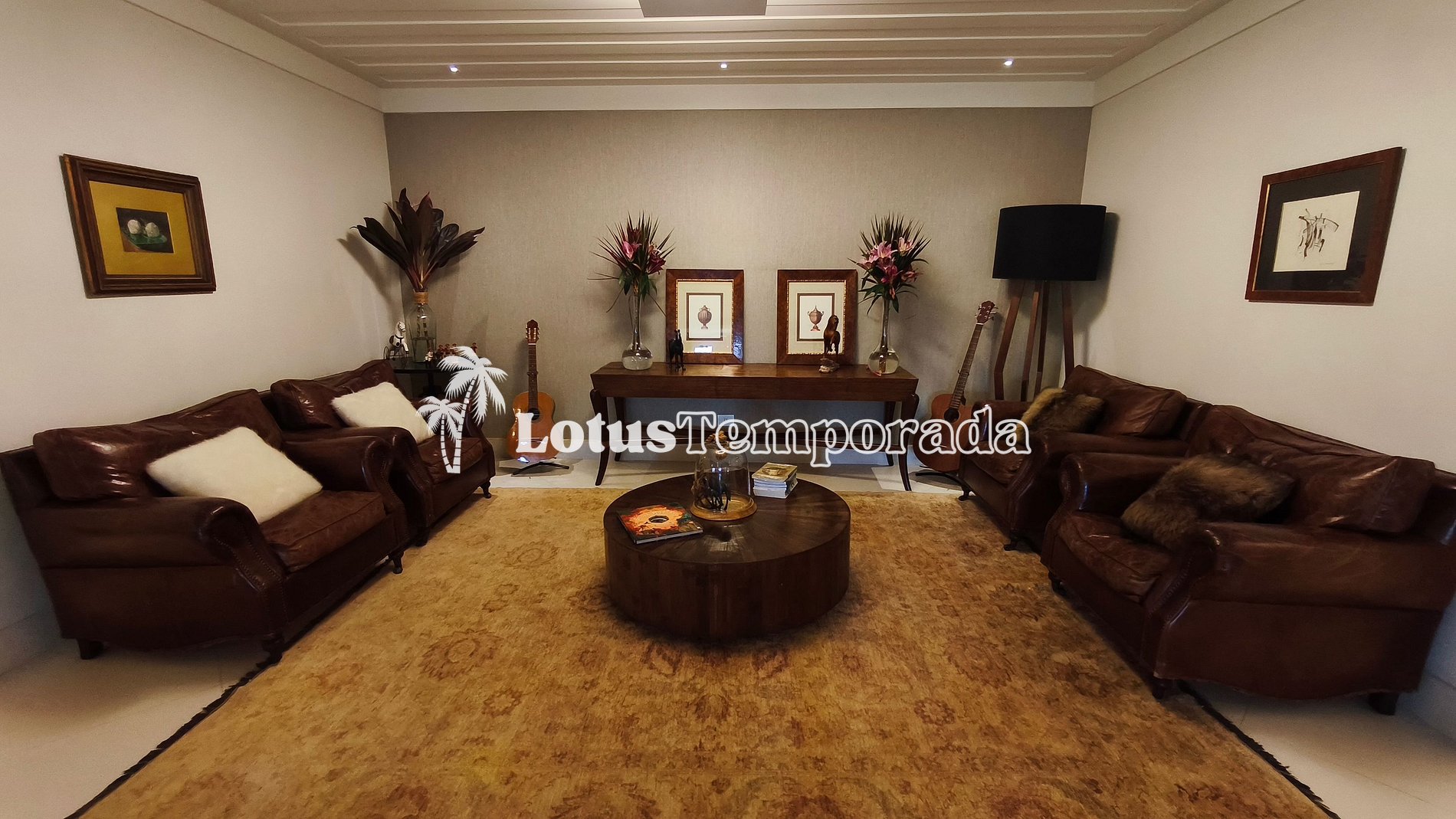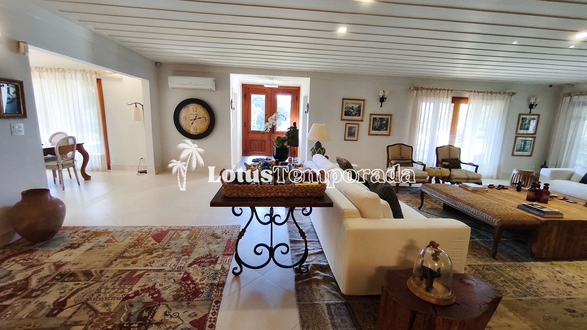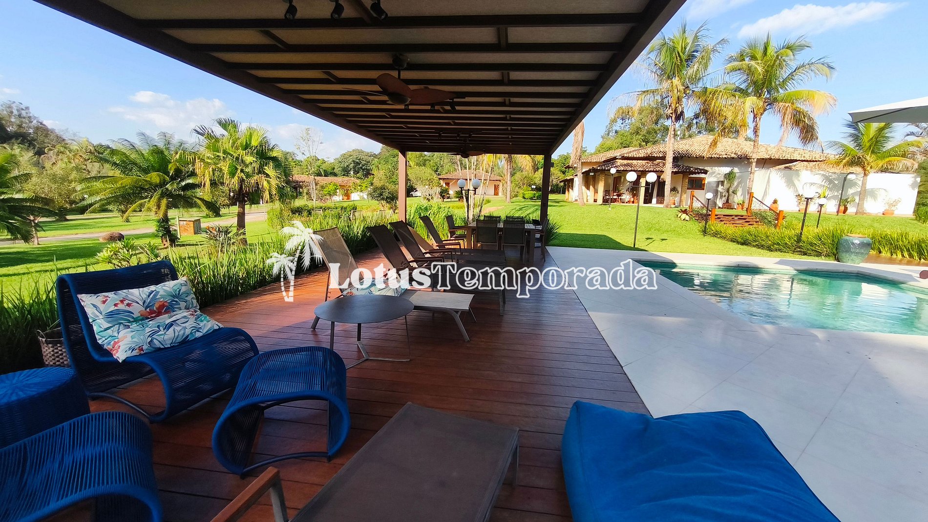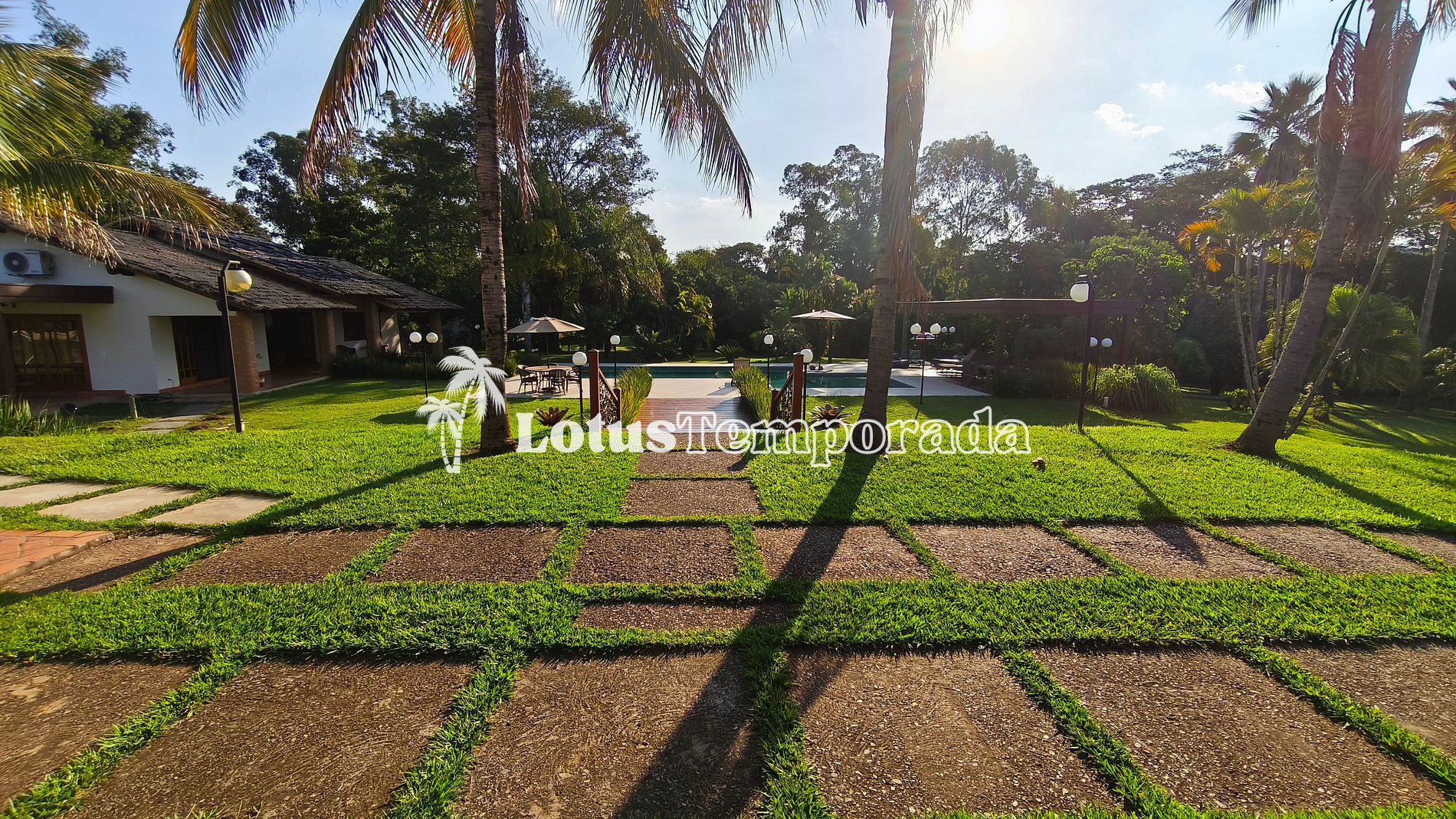 A propriedade conta com 9 suítes amplas, todas equipadas com ar-condicionado e TV, garantindo conforto e privacidade para todos os hóspedes. Na casa sede, estão distribuídas 4 dessas suítes, além de uma área social imponente com dois ambientes integrados: sala de TV e sala de estar, ambas decoradas com requinte e pensadas para proporcionar aconchego e funcionalidade. Há ainda lavabo de apoio e uma sala de jantar com mesa para 10 lugares, ideal para momentos de convivência.