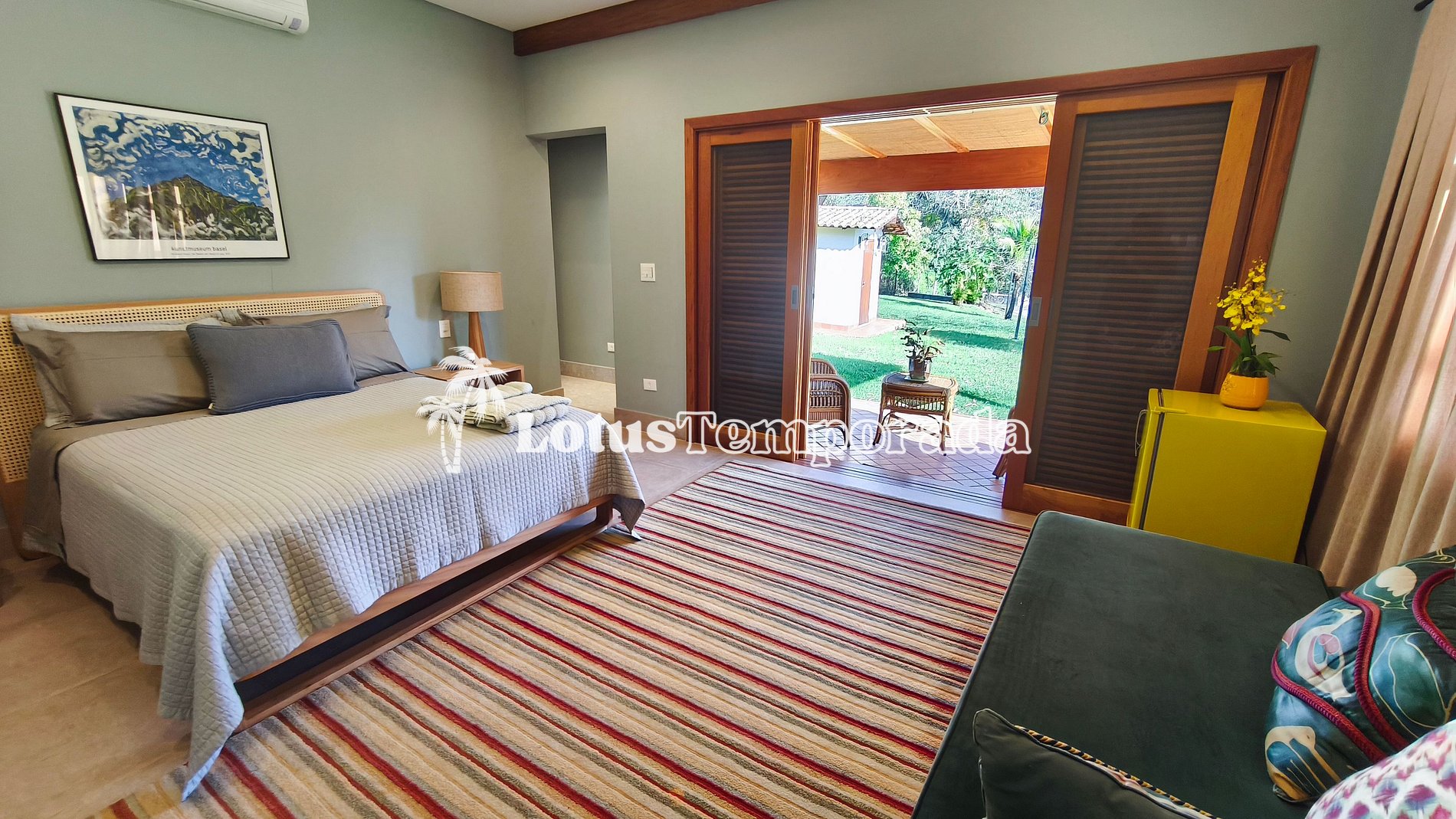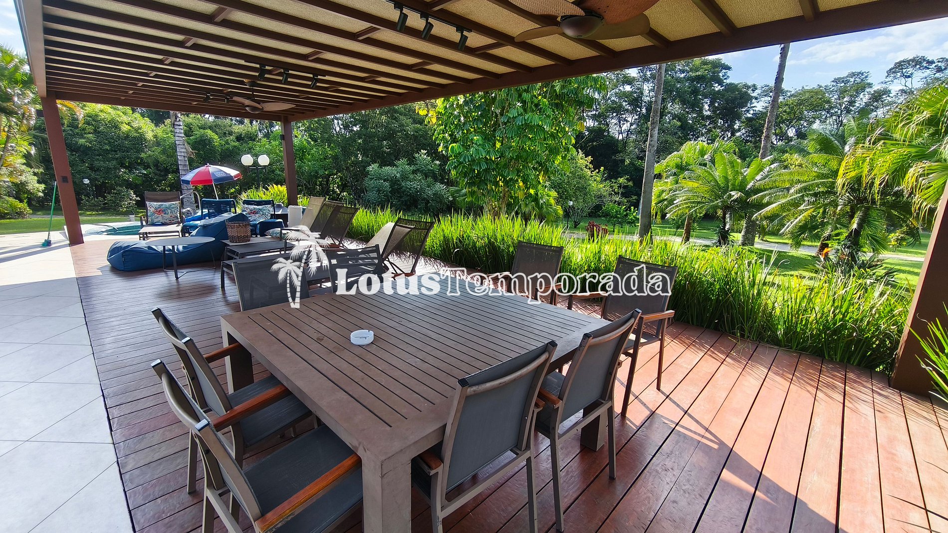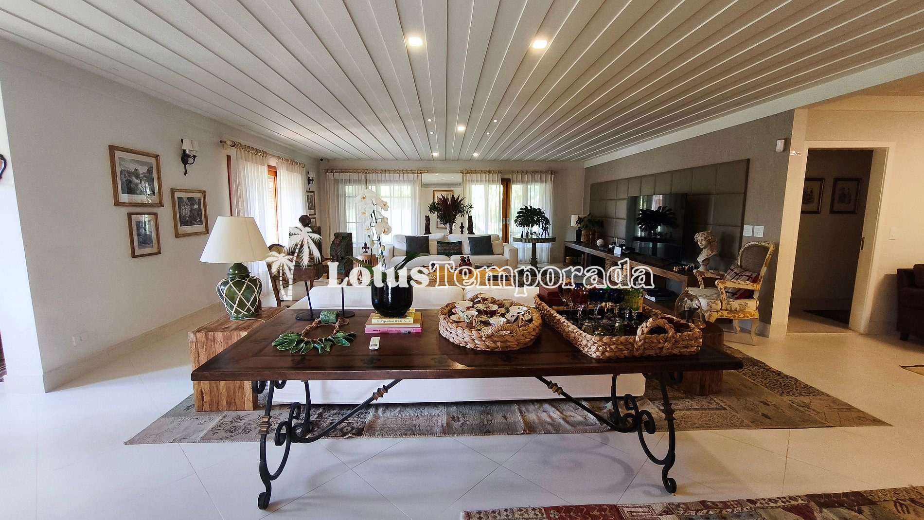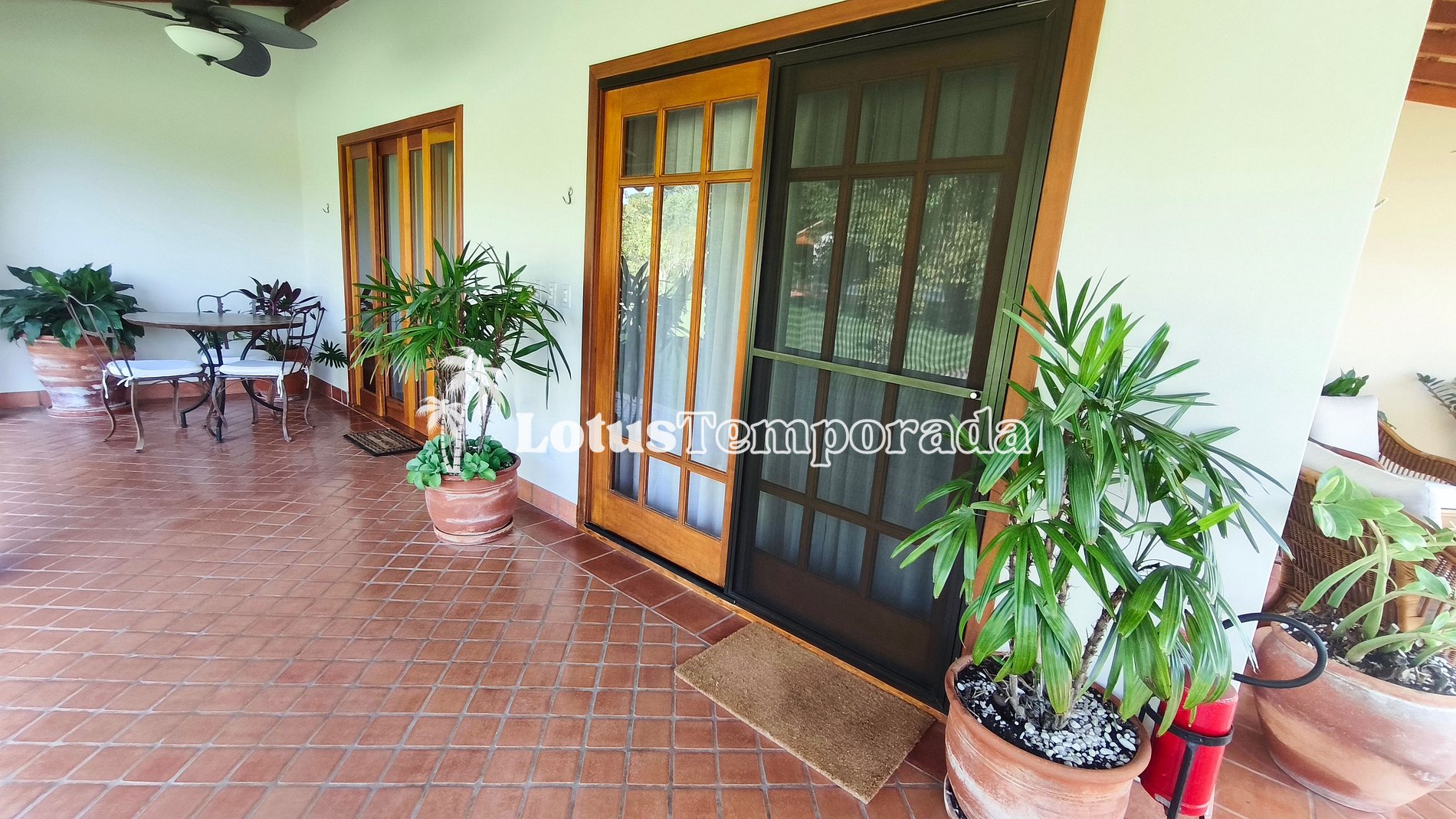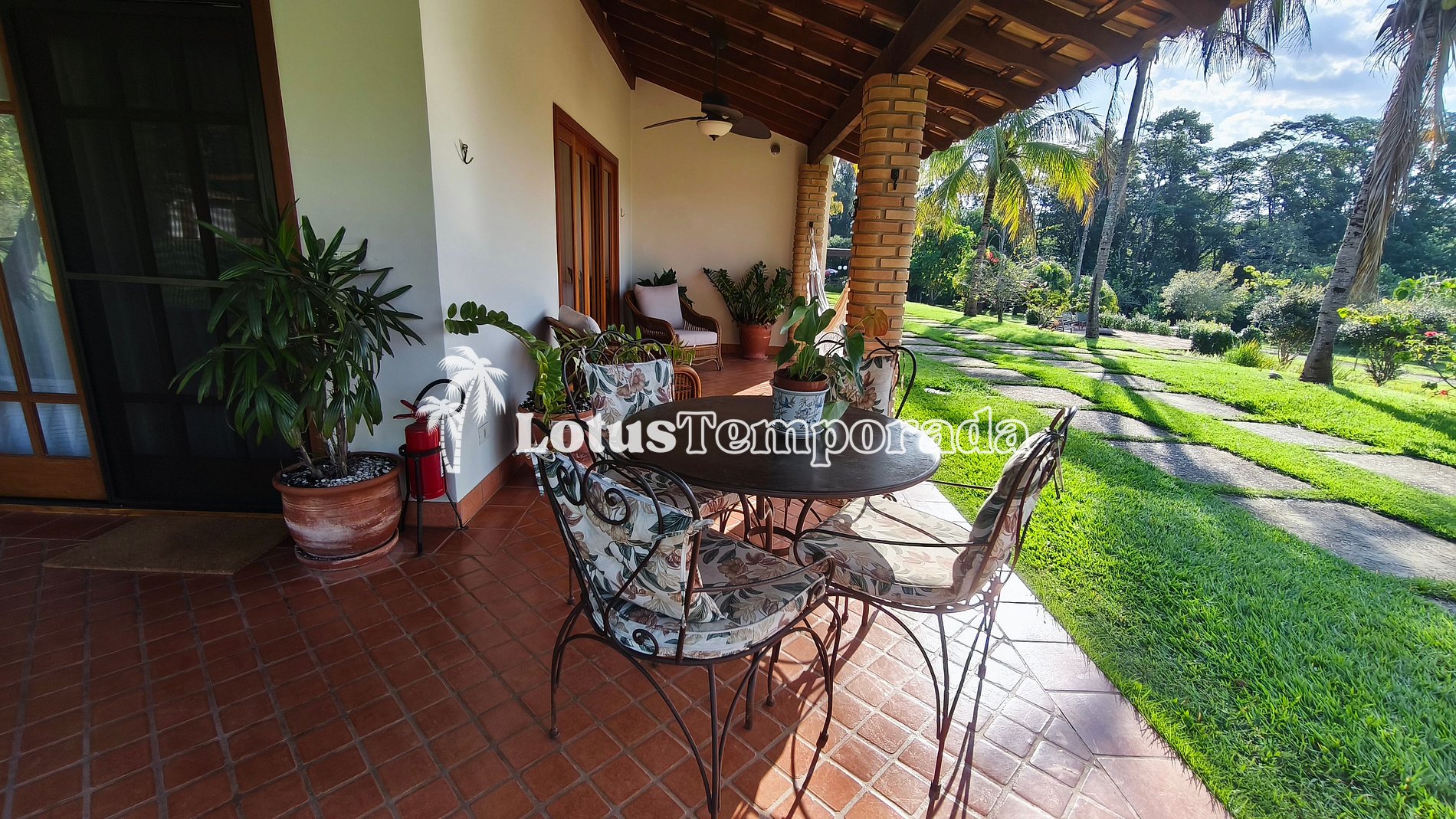 A cozinha é completa e totalmente equipada, atendendo com excelência tanto estadias quanto eventos. Todos os ambientes internos possuem climatização, reforçando o padrão elevado do imóvel. A varanda se abre para uma vista encantadora do espaço externo, criando um ambiente perfeito para relaxar e contemplar a natureza.