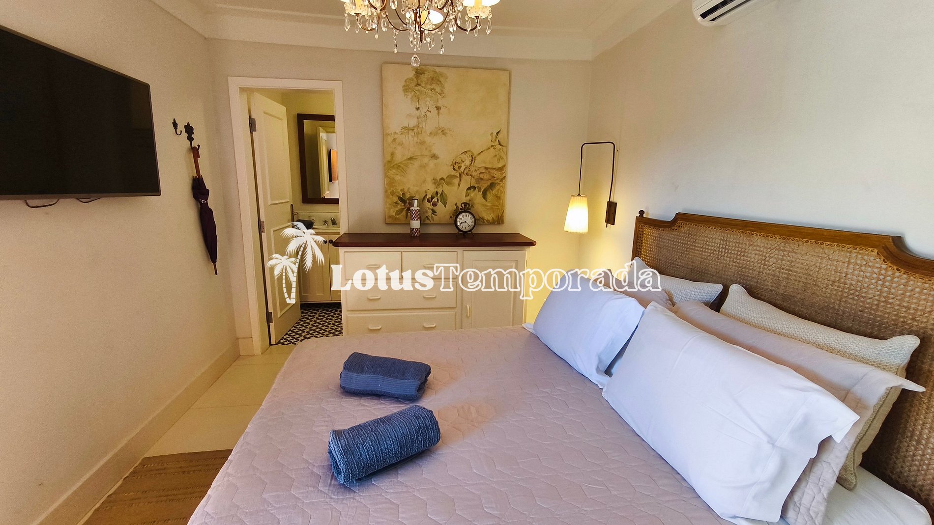 Suíte 1 = 1 cama king size, banheiro com chuveiro, ar-condicionado e TV;