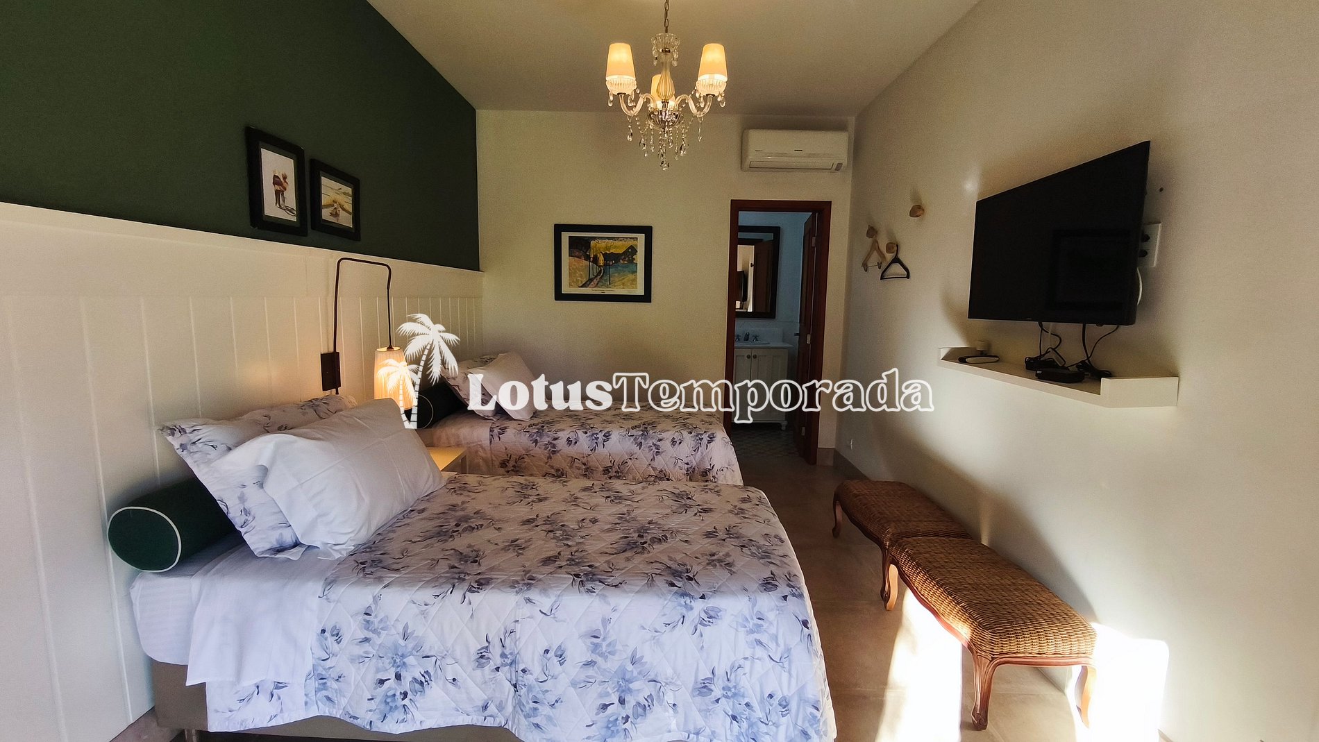 Suíte 4 = 2 camas de solteiro, banheiro com chuveiro, ar-condicionado e TV;