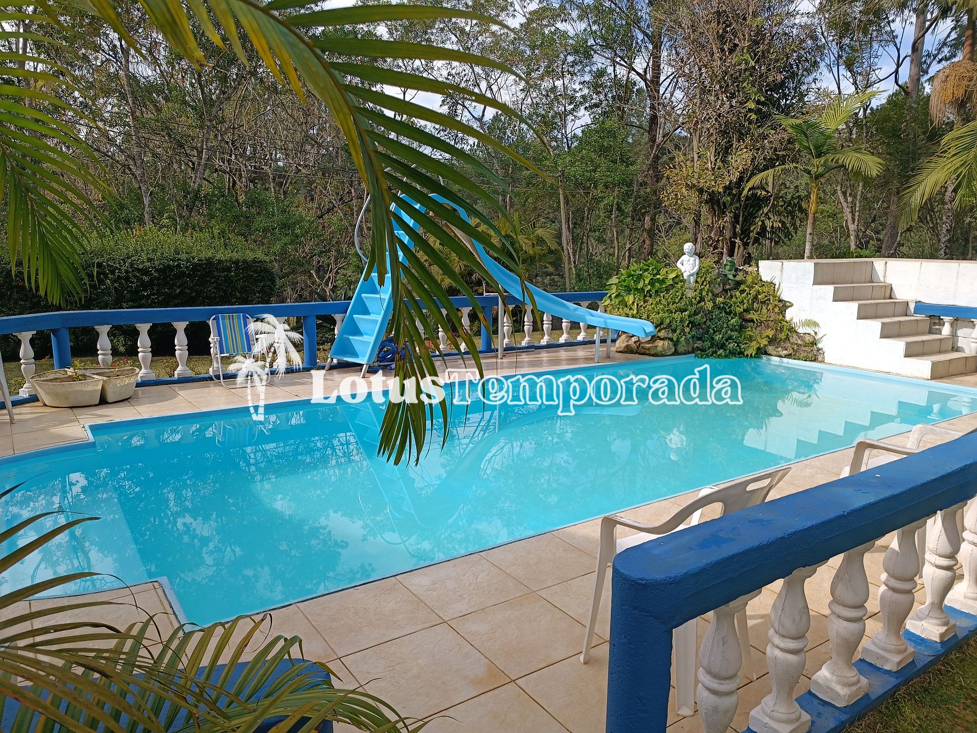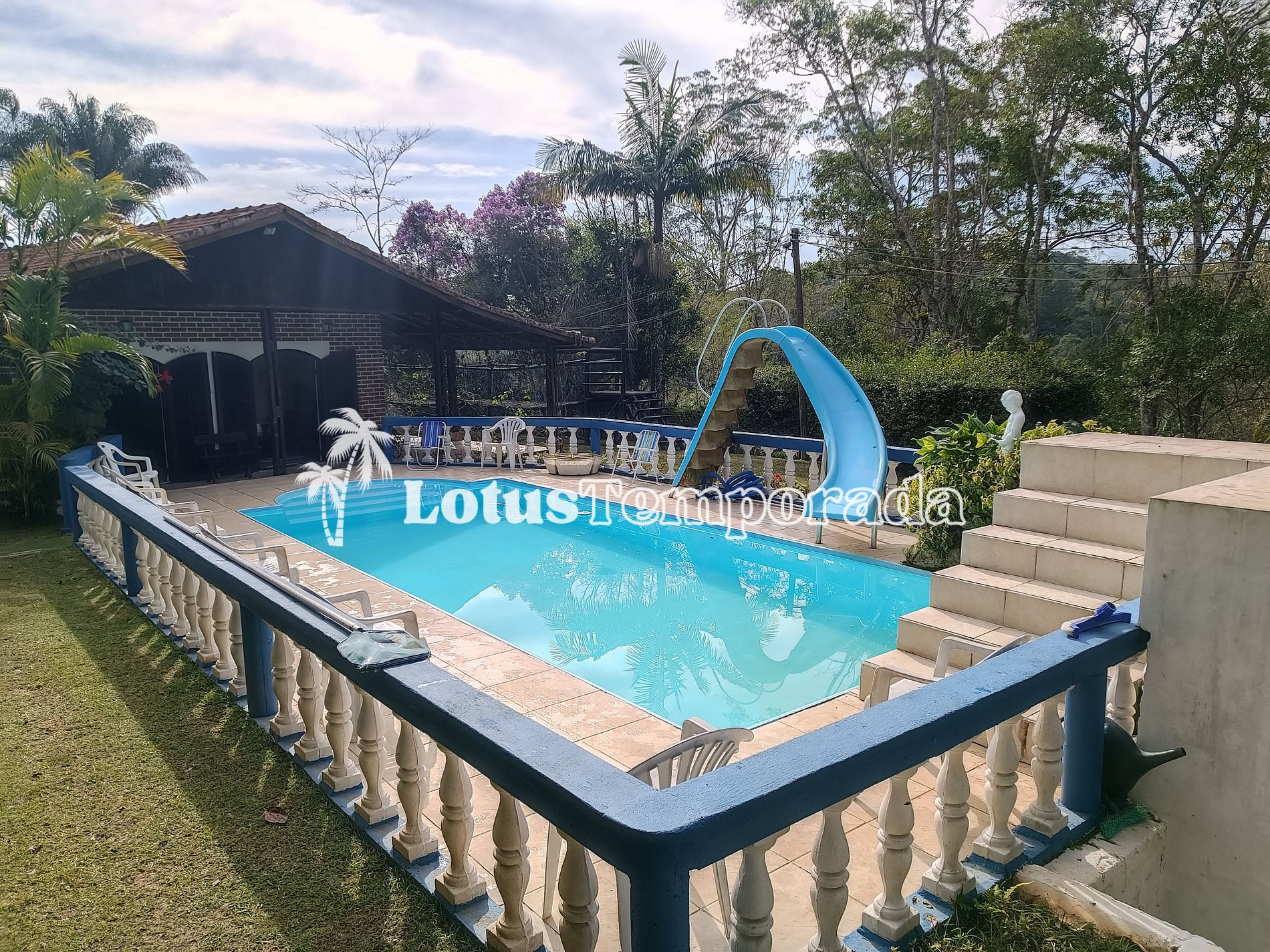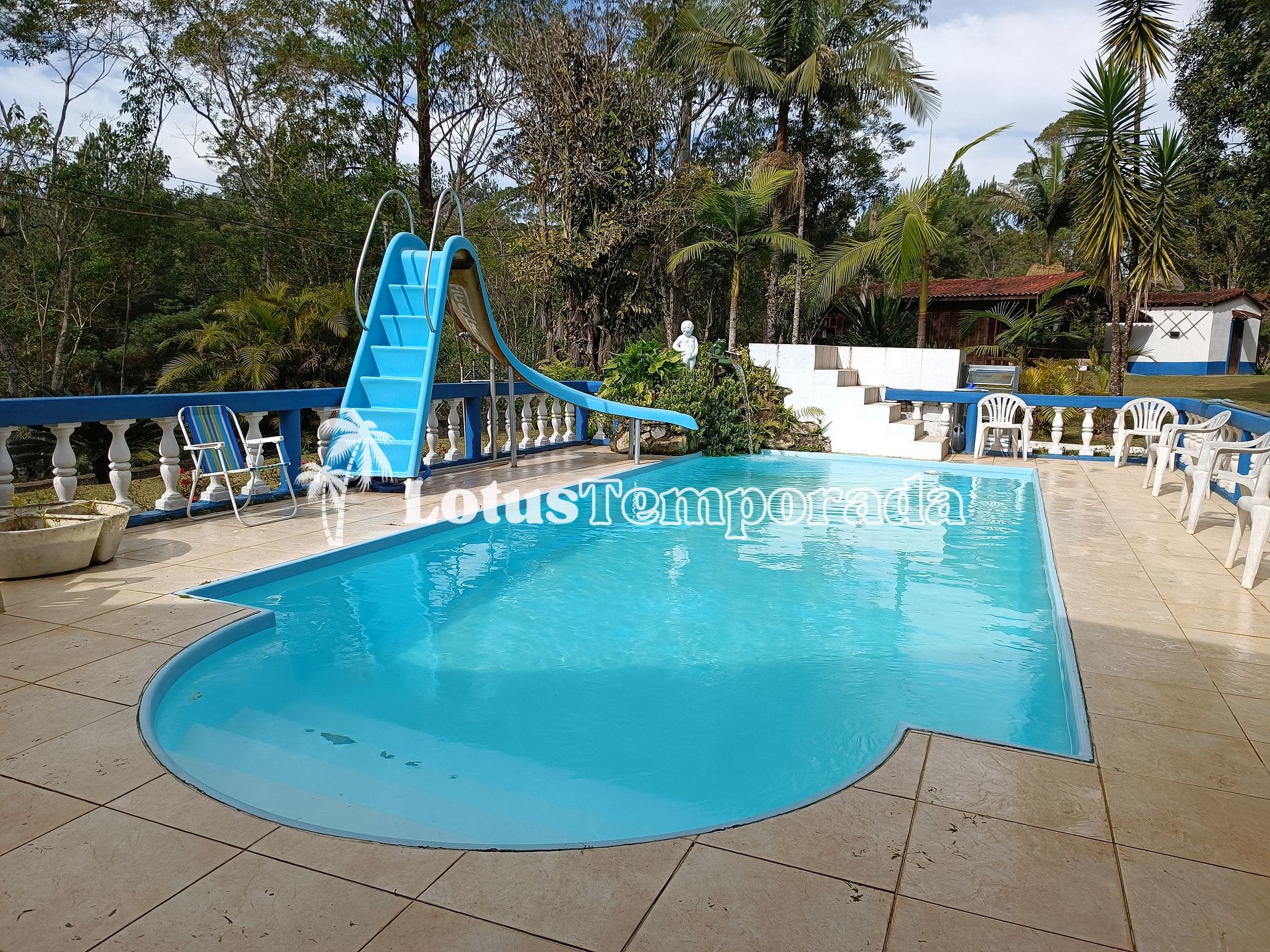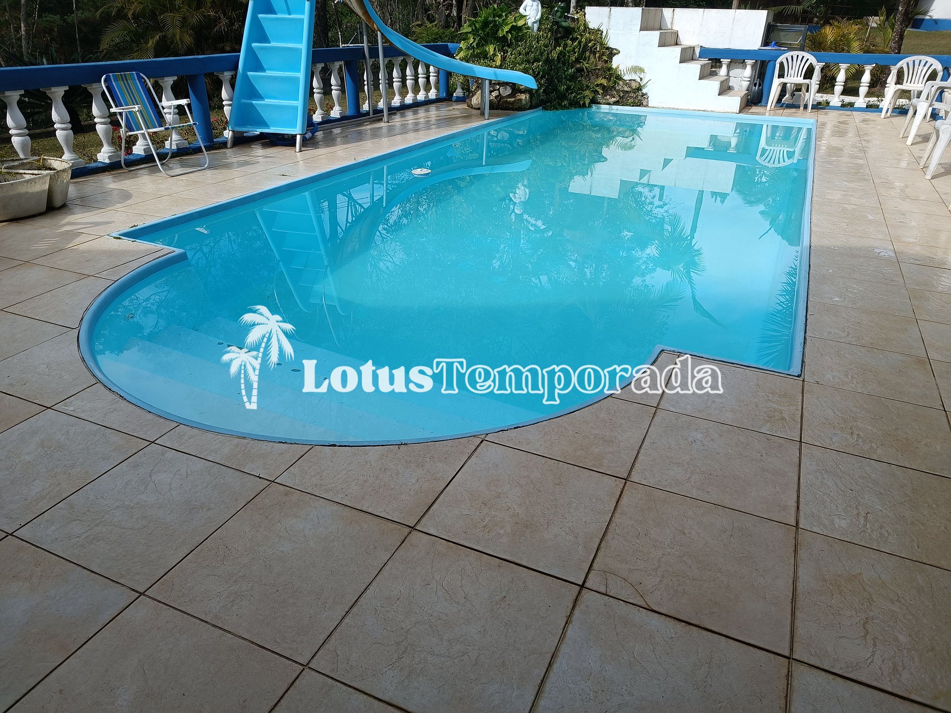 Sítio completo em Juquitiba com lago para pesca, pomar, campo de futebol telado, playground, piscina com toboágua, salão de jogos e área de churrasco coberta. Acomodações confortáveis em casa sede e chalé anexo. Ideal para lazer em família, contato com a natureza e momentos de descanso.