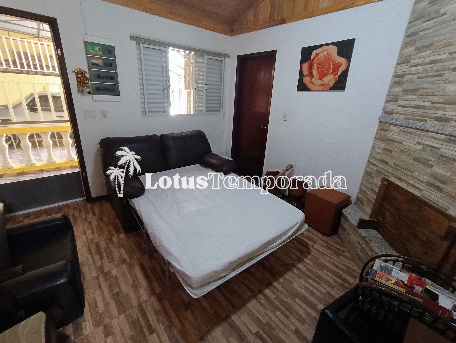 • Sala de TV com 01 sofá, poltronas, tv de plasma com cinebox, ventilador de teto, interfone com comunicação com os dormitórios e Lareira*;