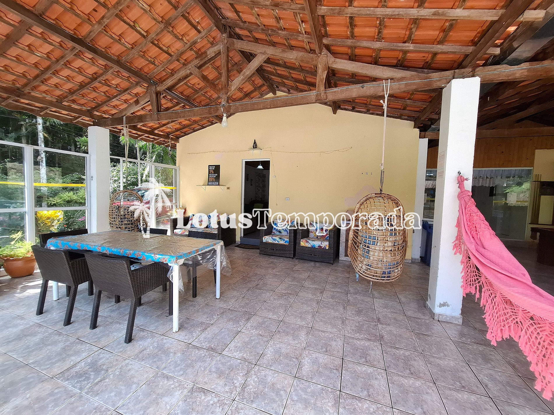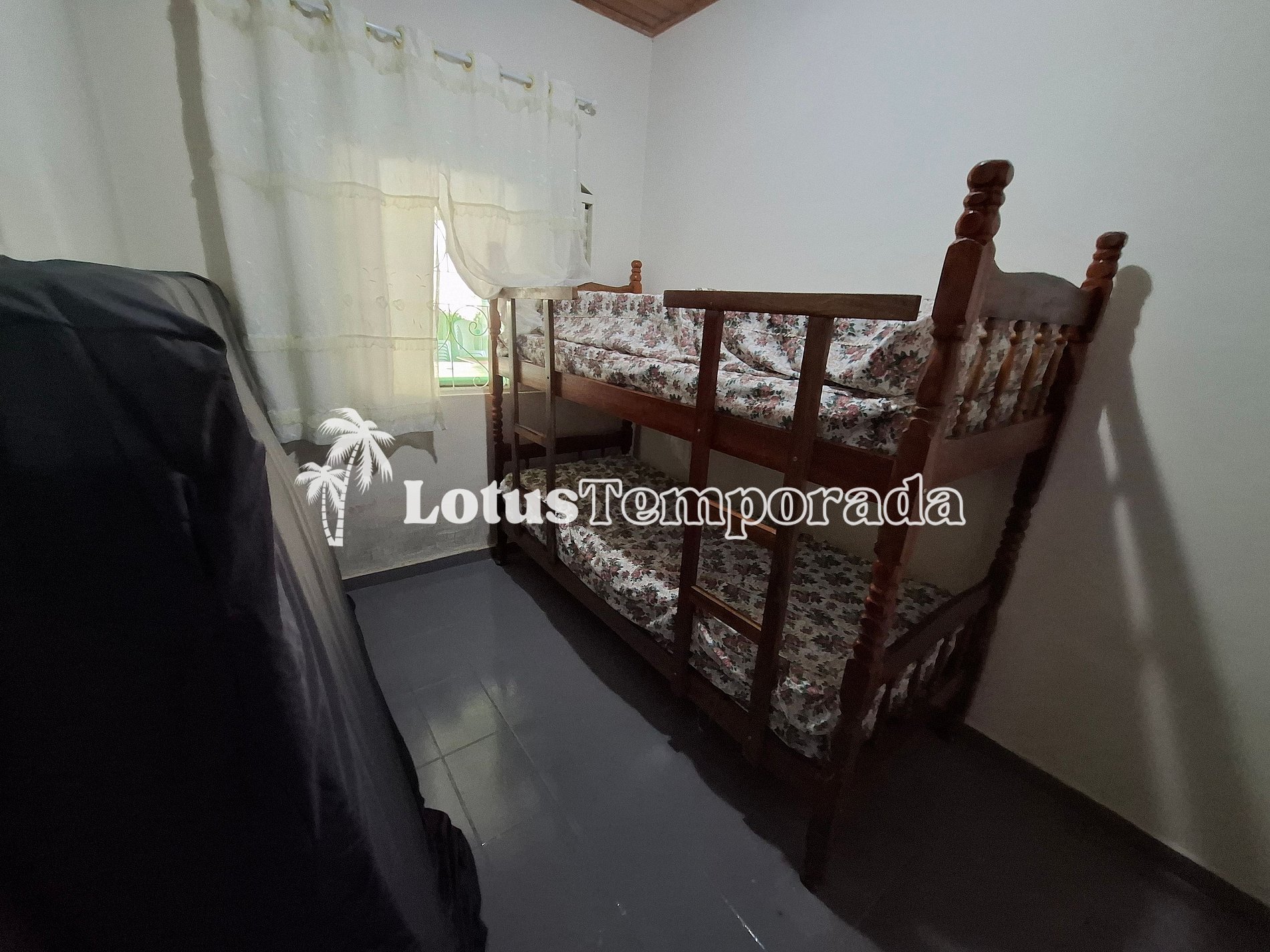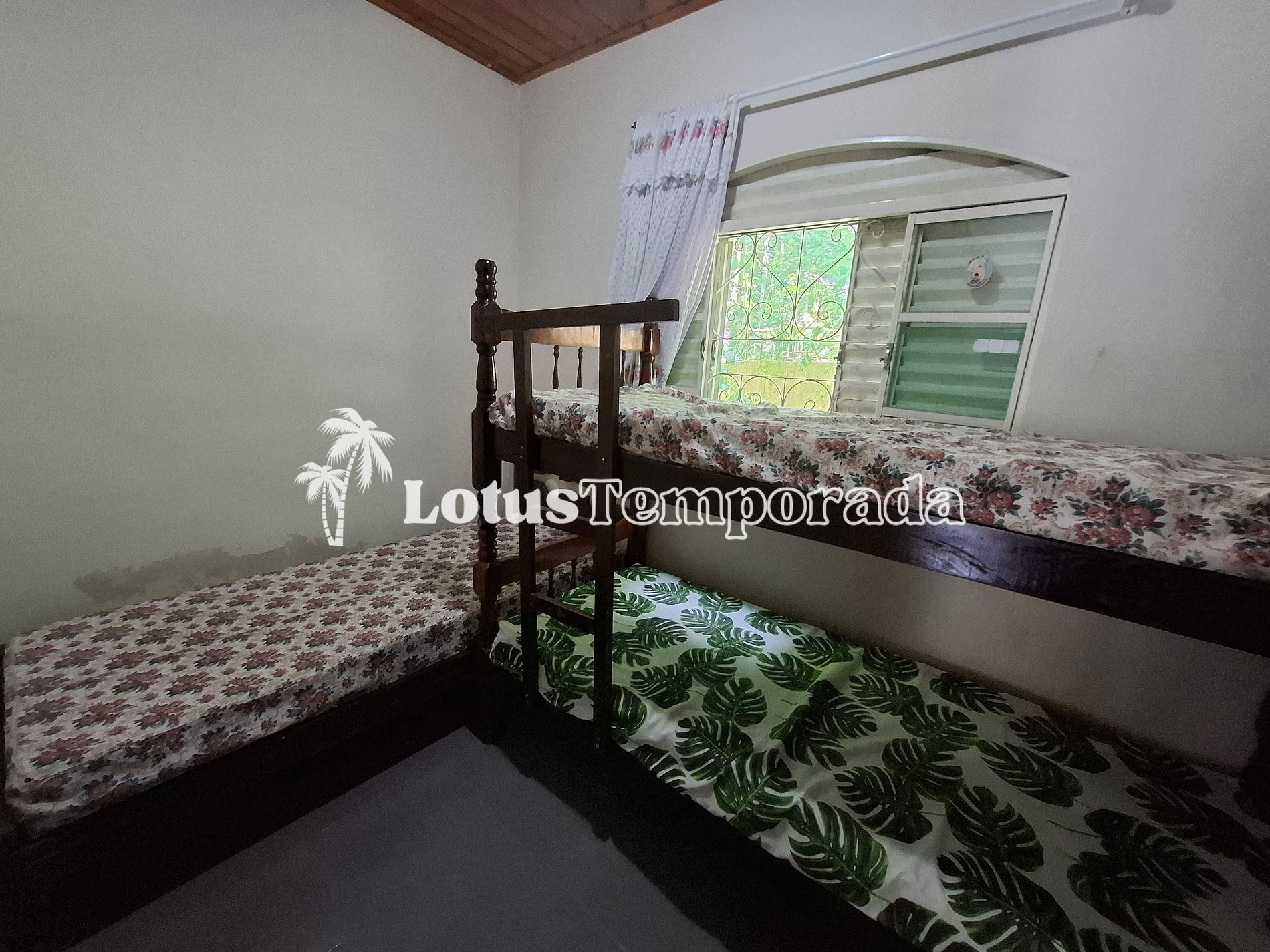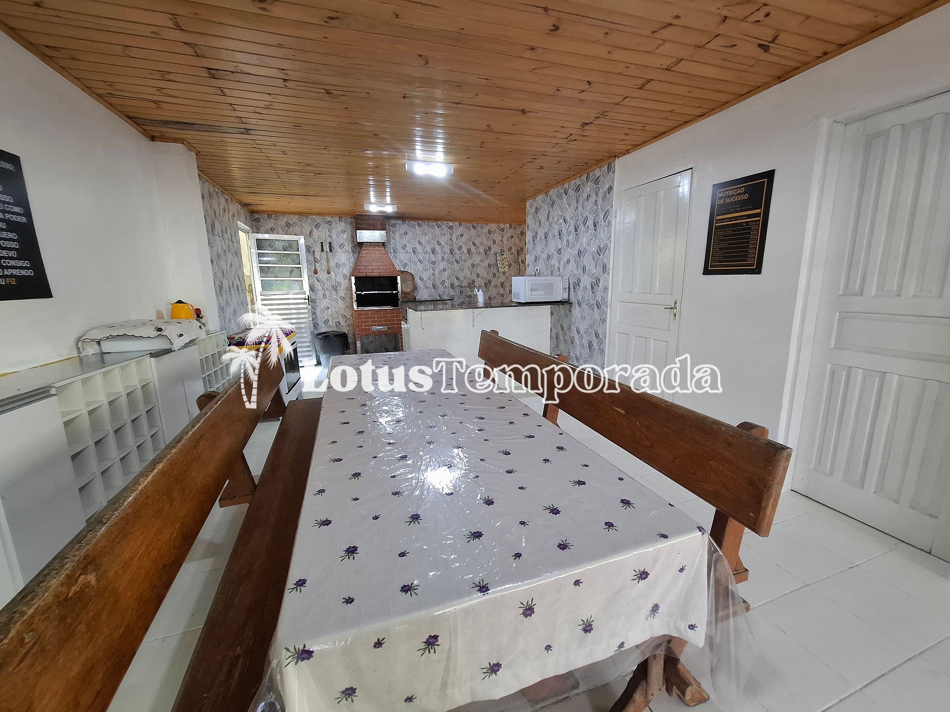 A residência conta com três dormitórios bem ventilados e um banheiro social interno, além de um banheiro externo que oferece praticidade extra durante o uso das áreas comuns. A sala ampla, equipada com TV a cabo, também abriga uma cama de casal, proporcionando um espaço adicional para descanso e relaxamento.
