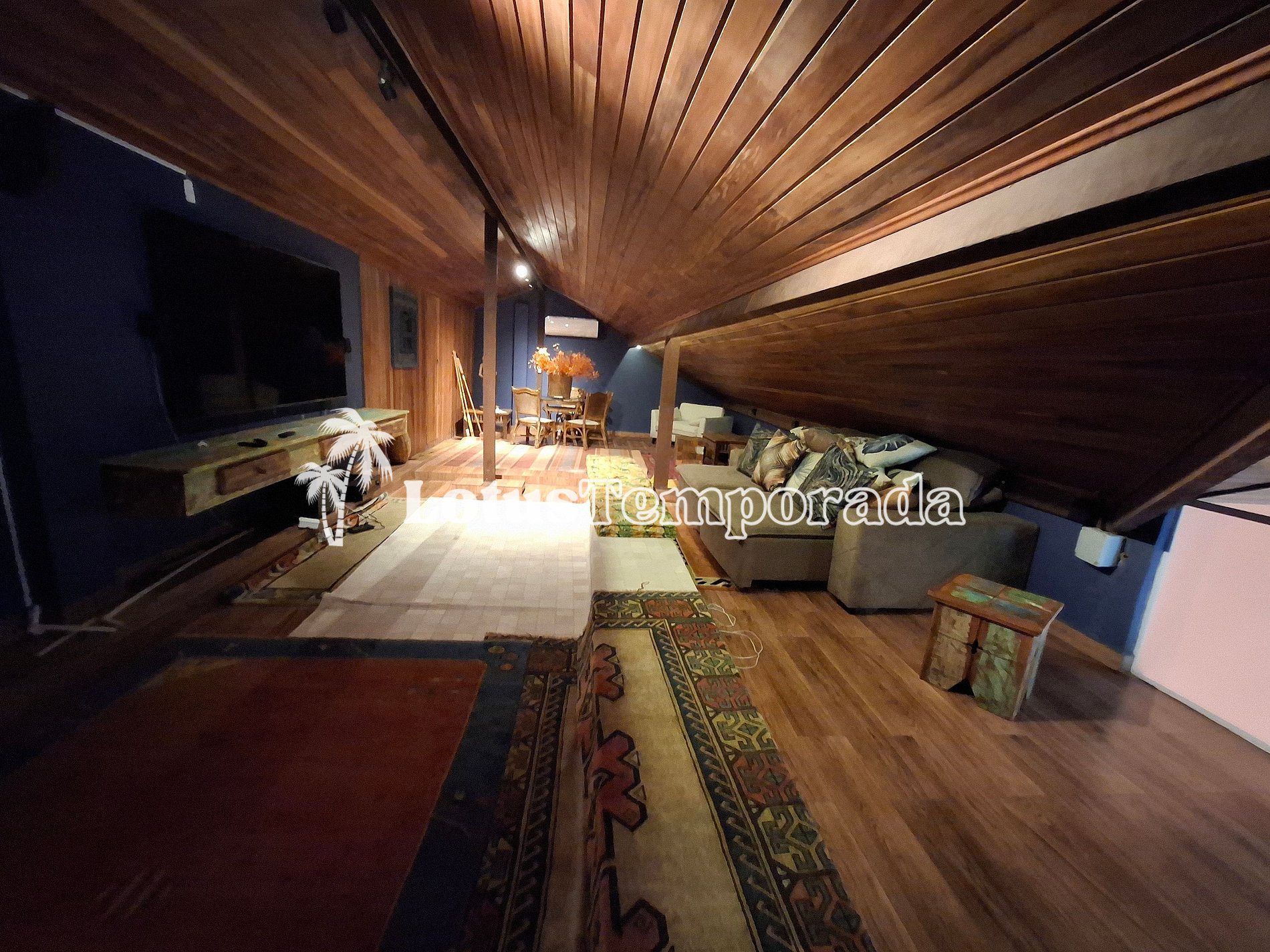 Sala de lareira e sala de TV com pé-direito duplo para aquele clima aconchegante.
