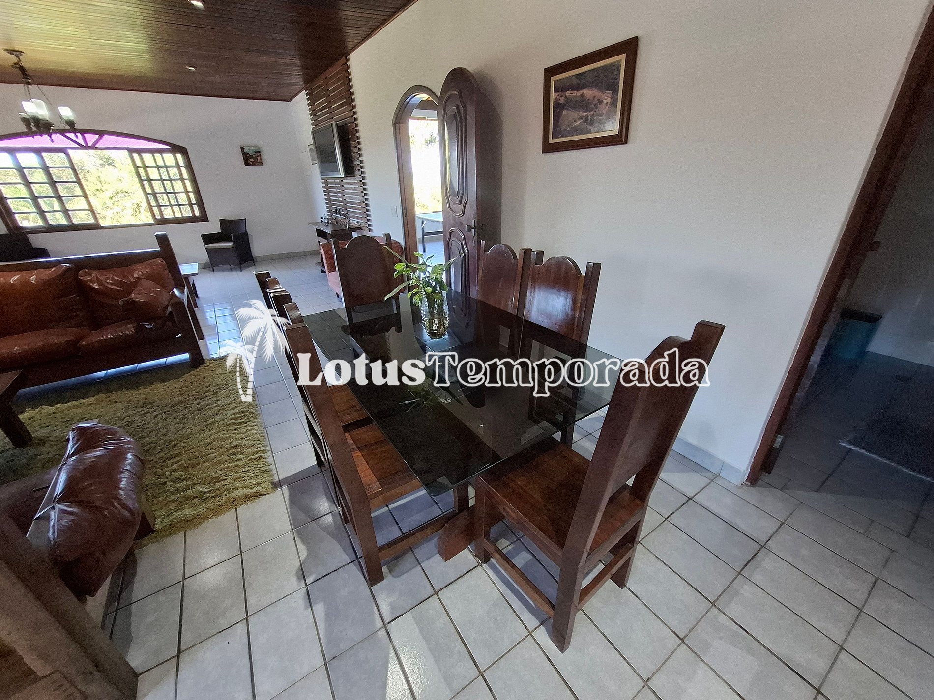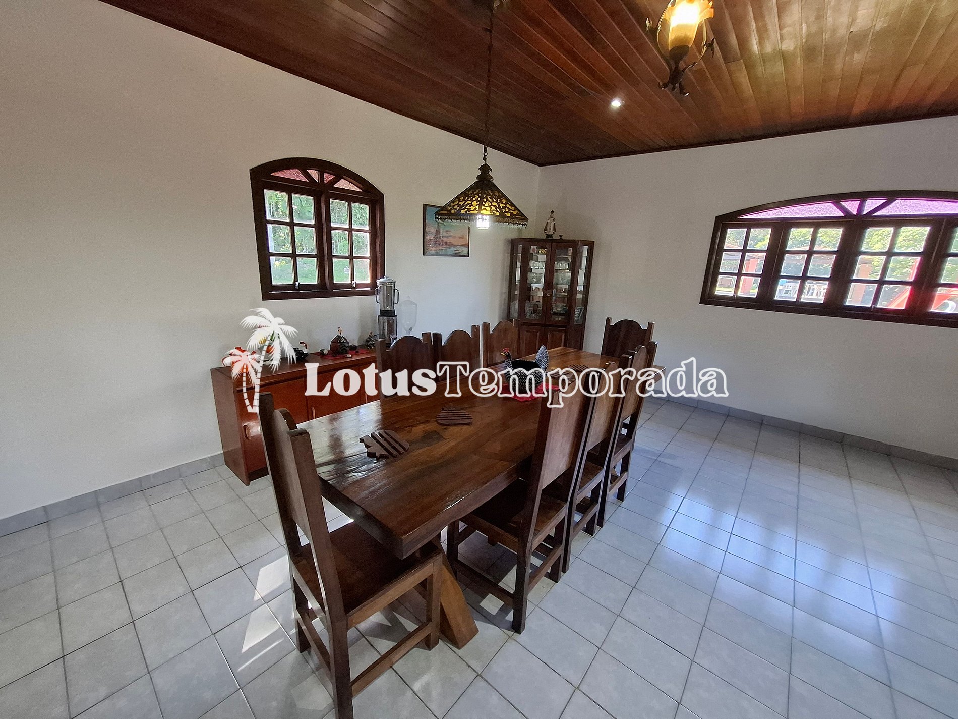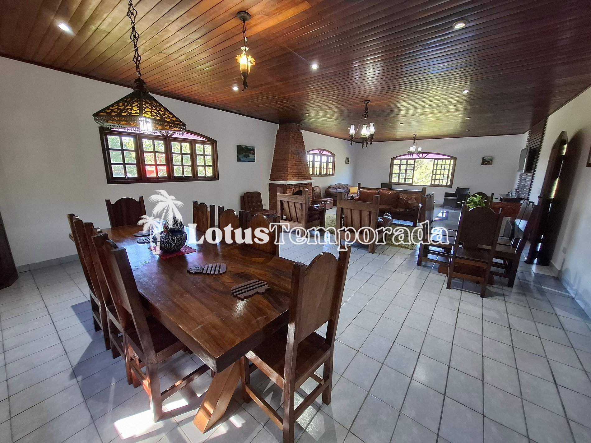 Sala de jantar com mesa rústica de 08 lugares