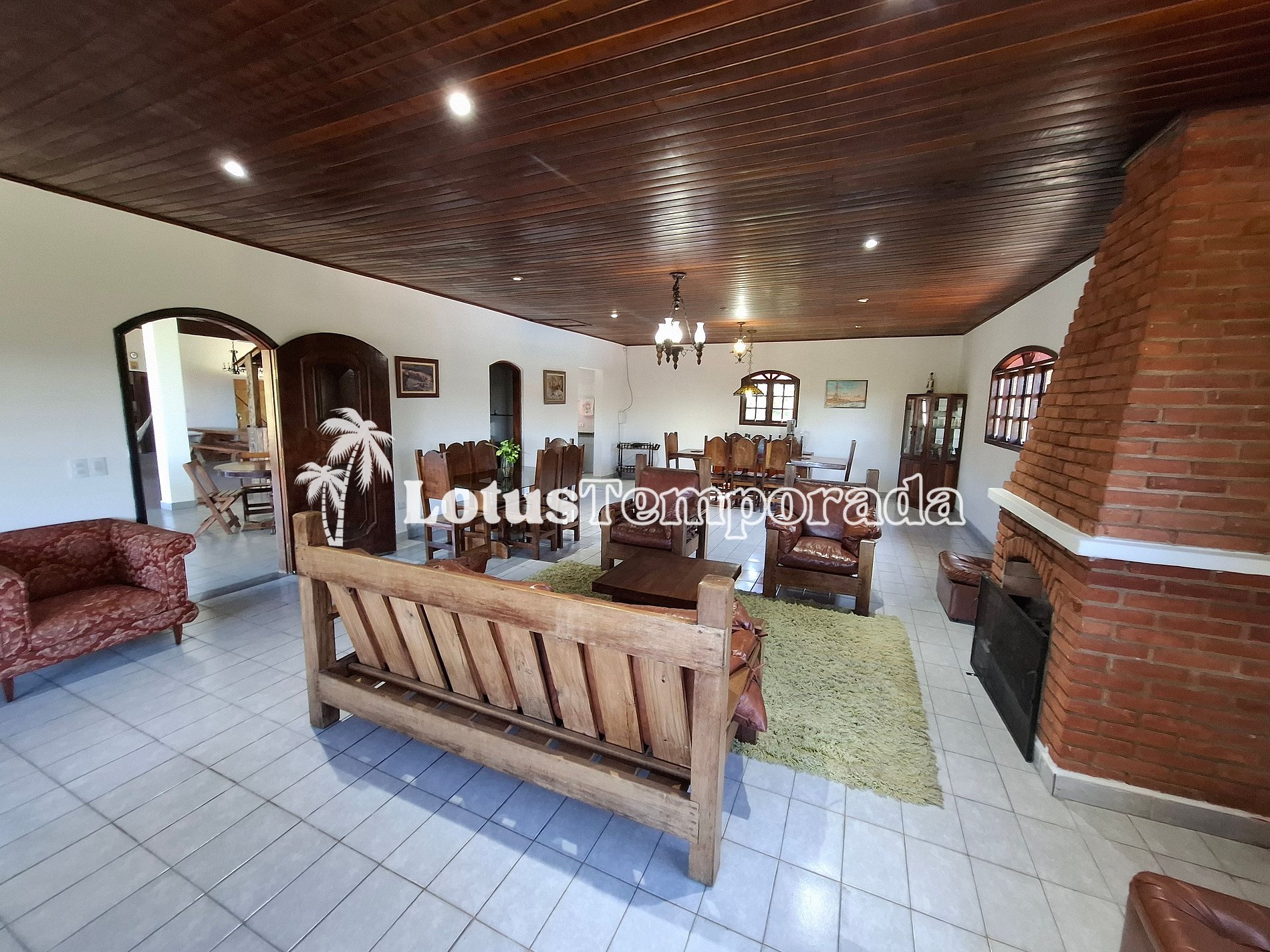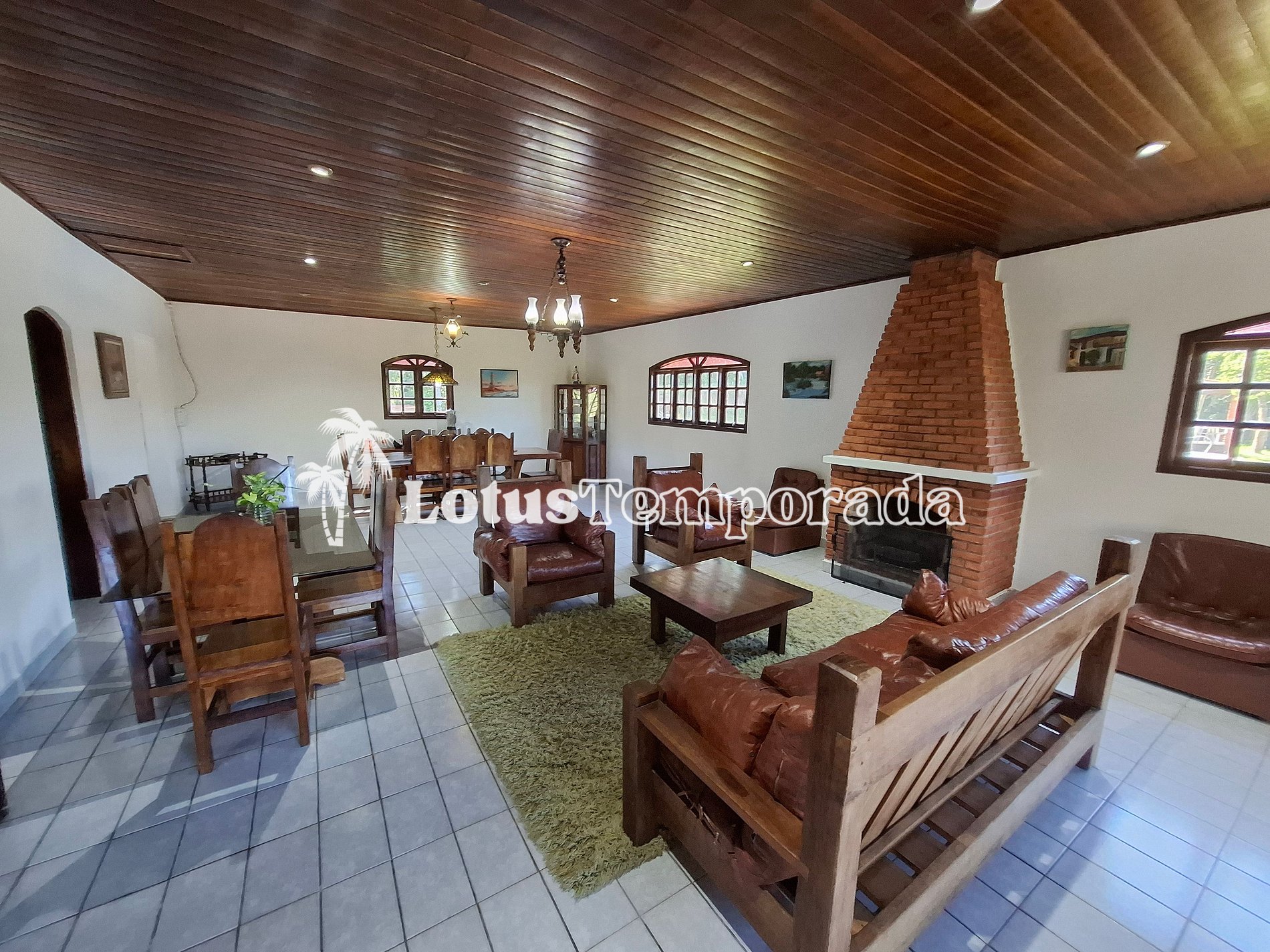 Sala de lareira com jogo de sofá rústico e mesa para 06 pessoas