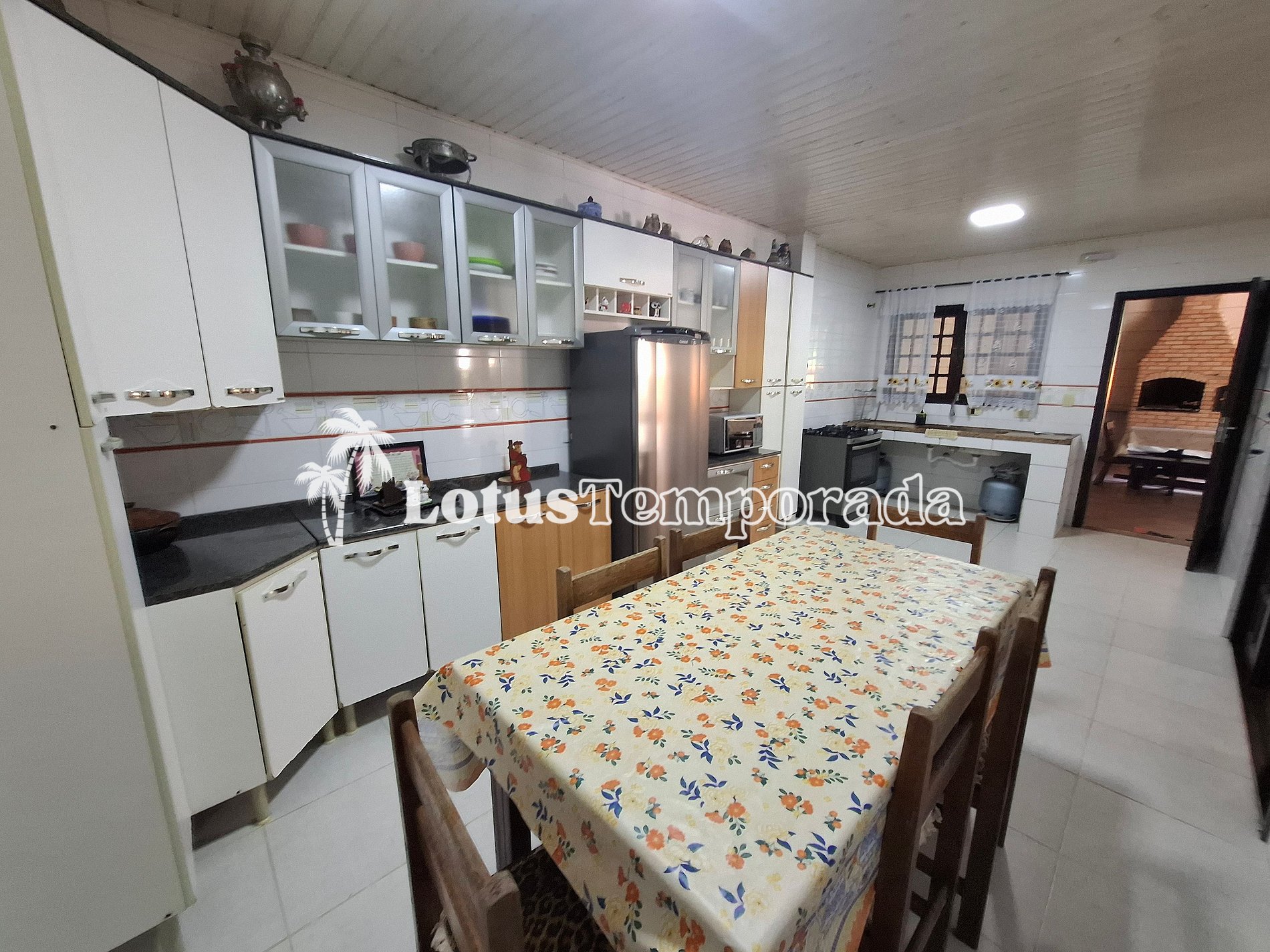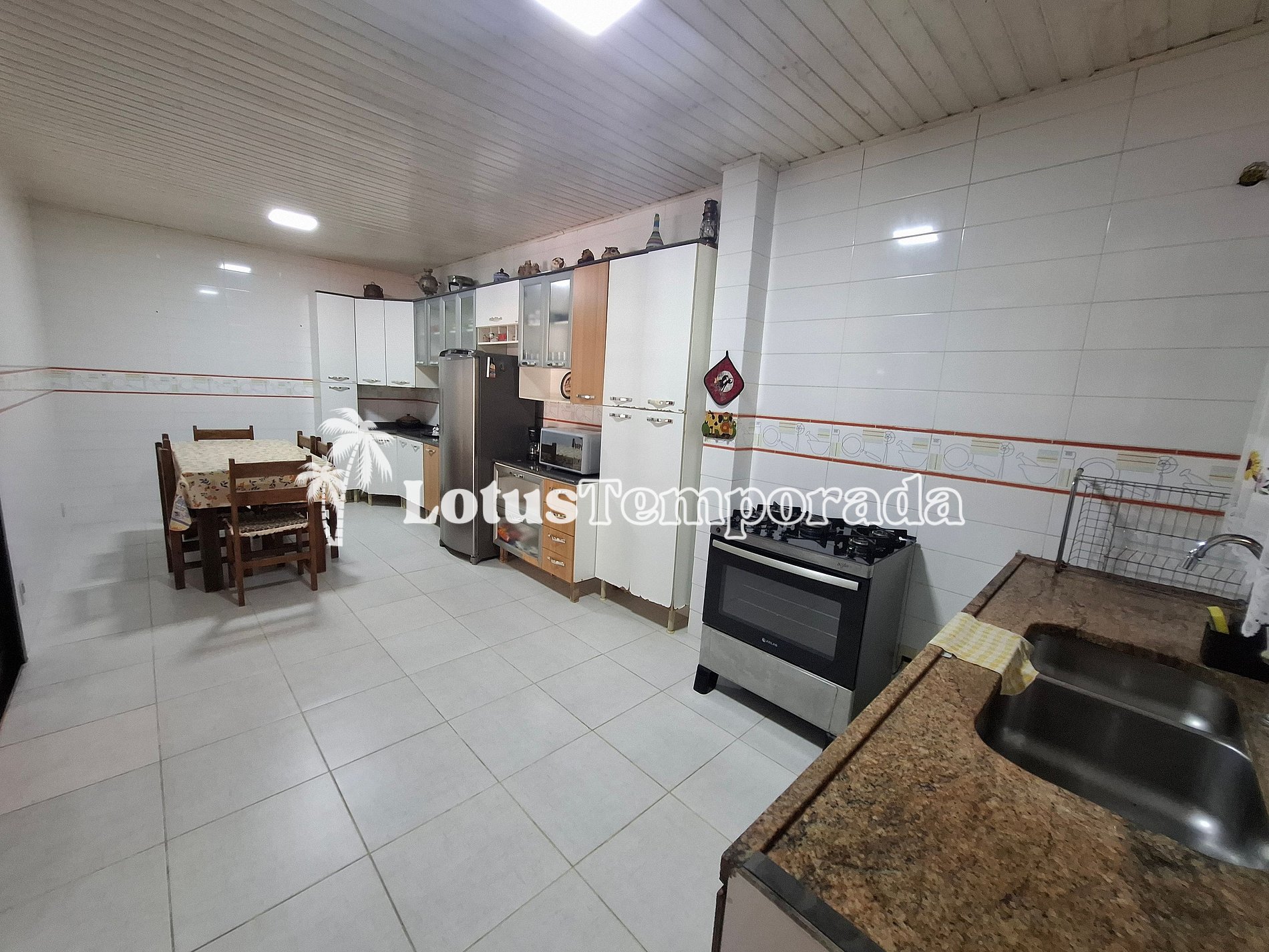 • Cozinha completa com utensílios básicos, pia, mesa para 6 pessoas, micro-ondas, geladeira duplex, armário e fogão de 5 bocas.