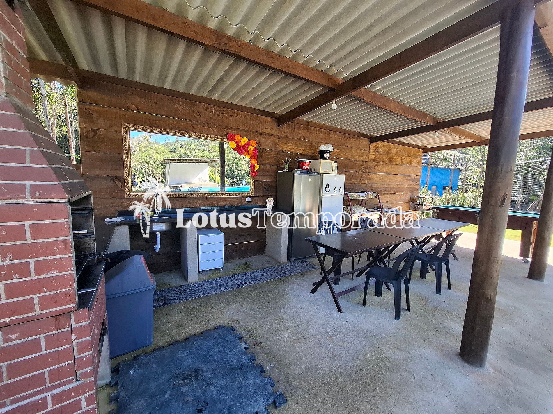 O lago cercado, com alguns animais ao redor, traz um clima ainda mais próximo da natureza. Para maior praticidade, tem dois lavabos bem perto da piscina. A casa principal é super aconchegante, com uma varanda que tem mesas, sofá e até uma mesa de sinuca, garantindo diversão para todos. E se precisar, tem wi-fi por todo o espaço, além de uma sala de TV bem ampla para quem quiser relaxar.