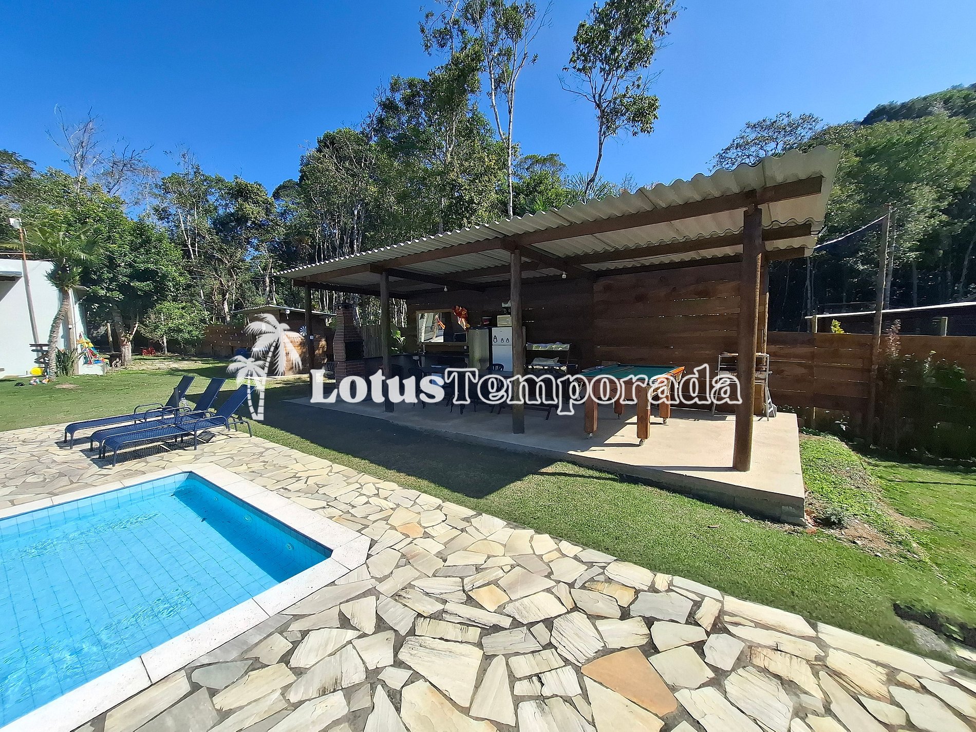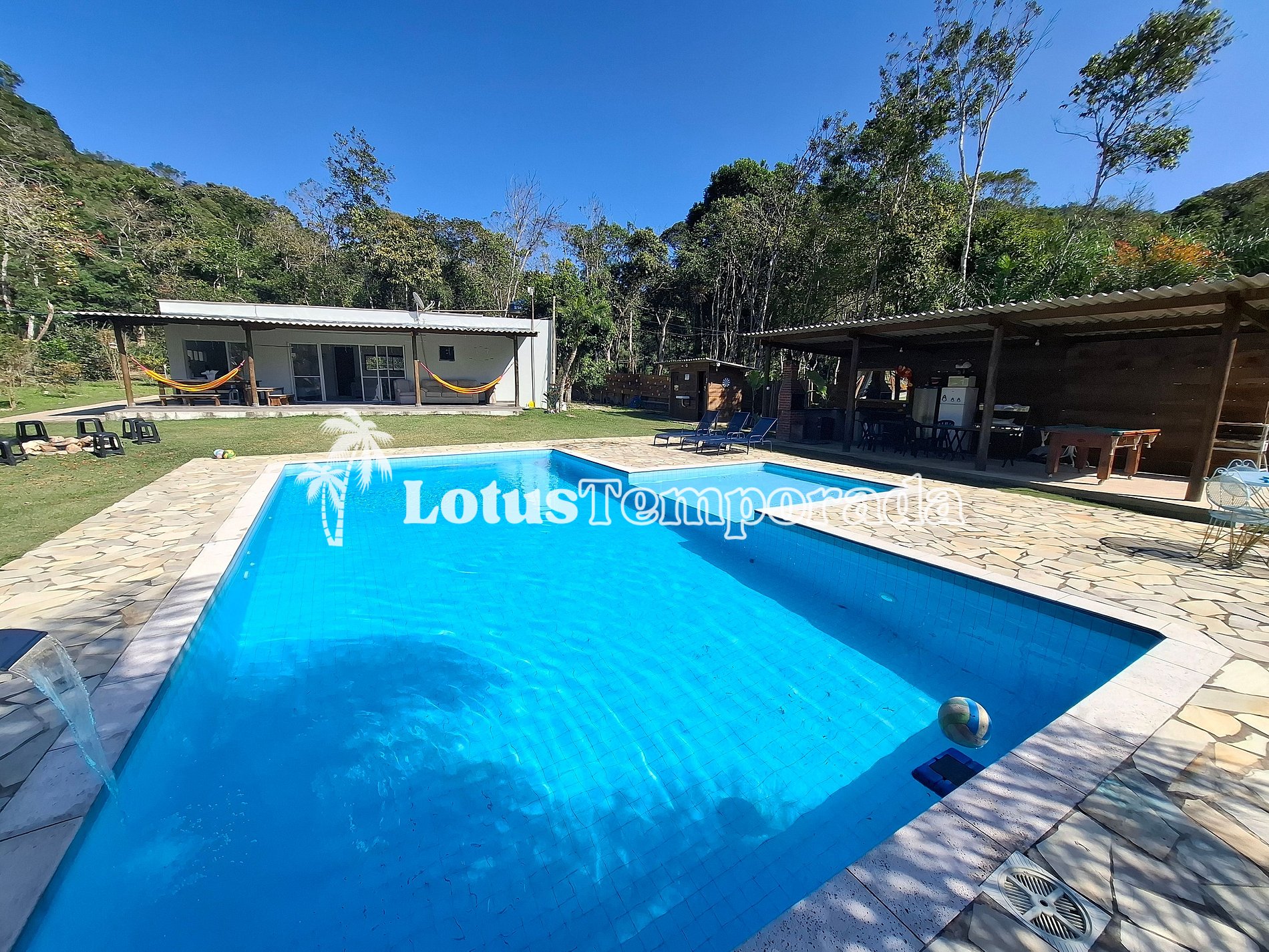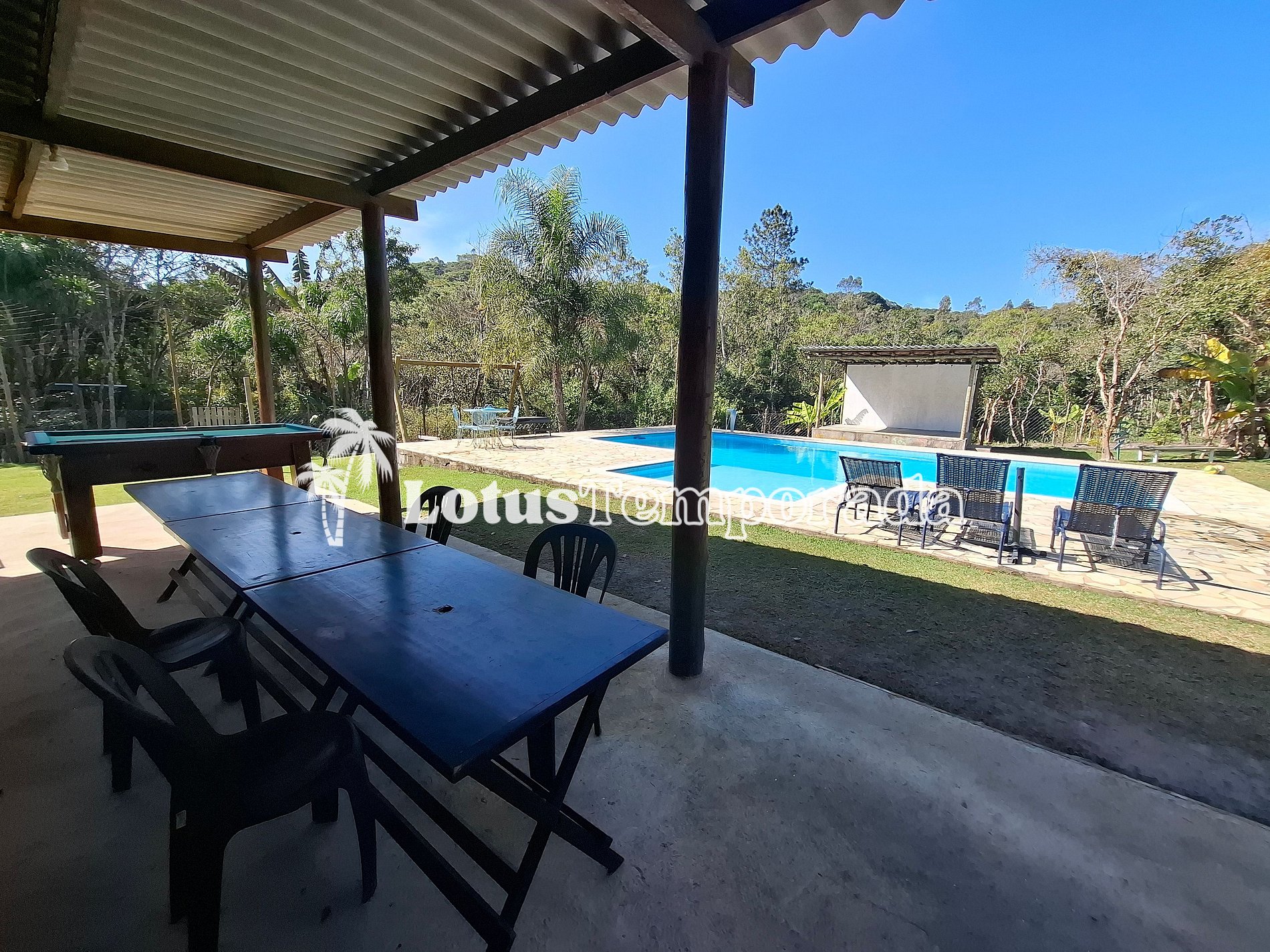 O lago cercado, com alguns animais ao redor, traz um clima ainda mais próximo da natureza. Para maior praticidade, tem dois lavabos bem perto da piscina. A casa principal é super aconchegante, com uma varanda que tem mesas, sofá e até uma mesa de sinuca, garantindo diversão para todos. E se precisar, tem wi-fi por todo o espaço, além de uma sala de TV bem ampla para quem quiser relaxar.