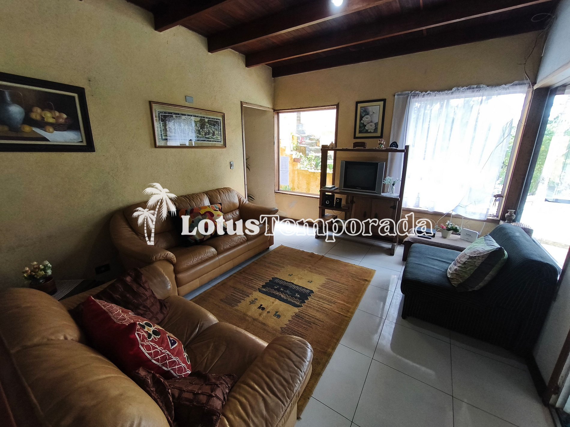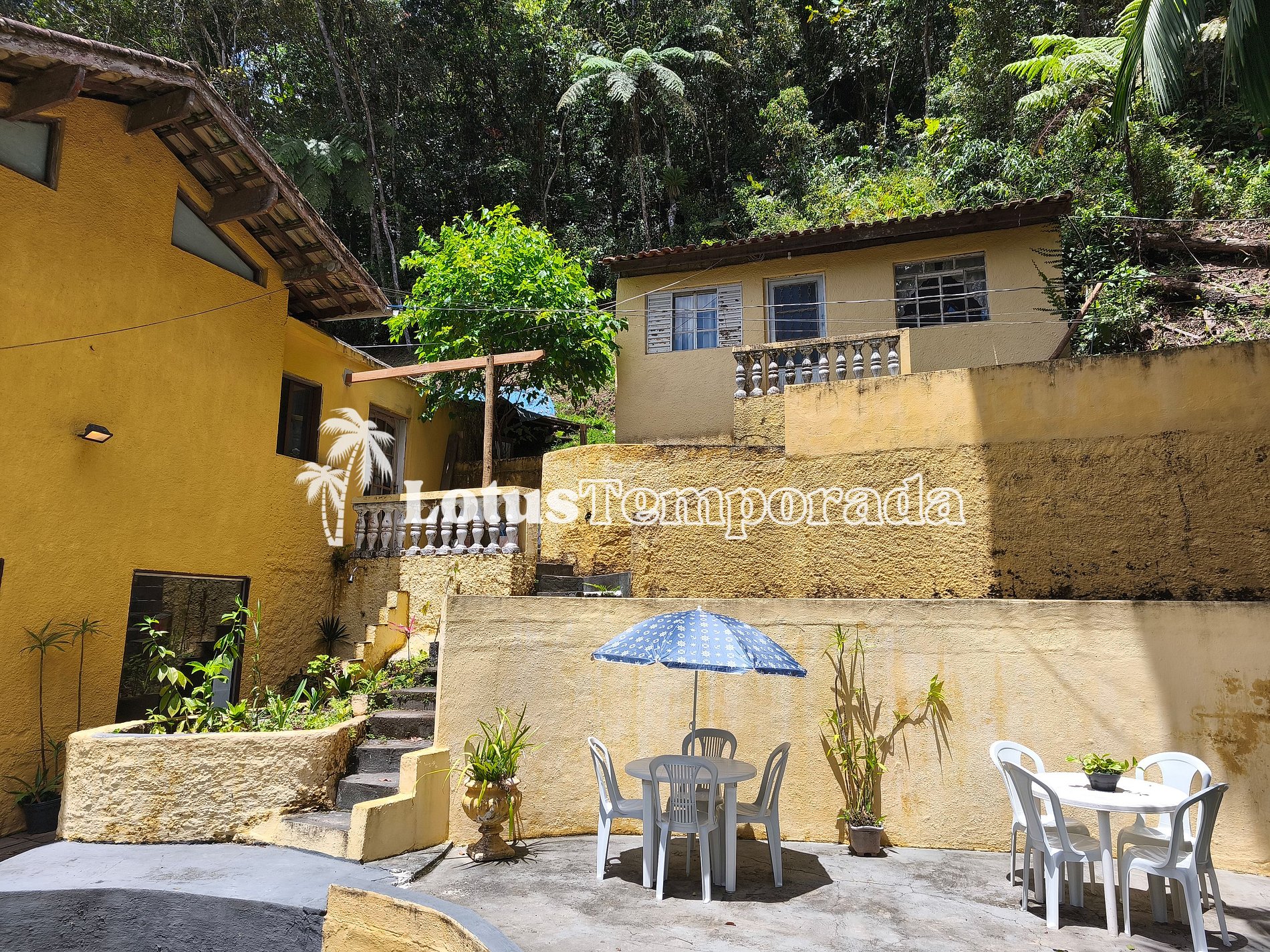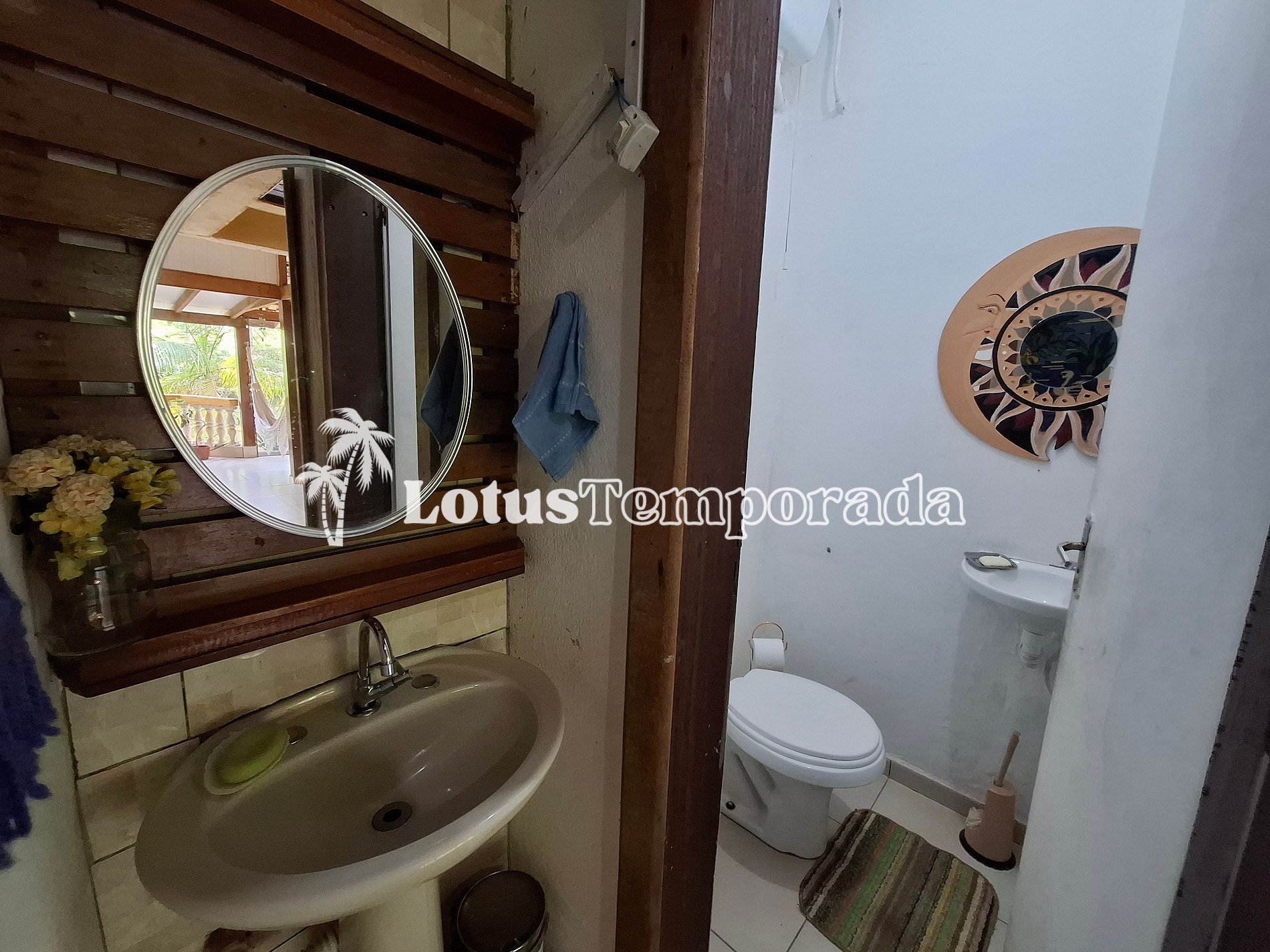 A casa principal é acolhedora e funcional, com uma cozinha compacta, sala de estar com TV de tubo equipada com SKY (canais abertos), Wi-Fi, dois dormitórios e um ambiente extra com uma beliche. Há também um banheiro social interno e dois lavabos externos para maior comodidade.