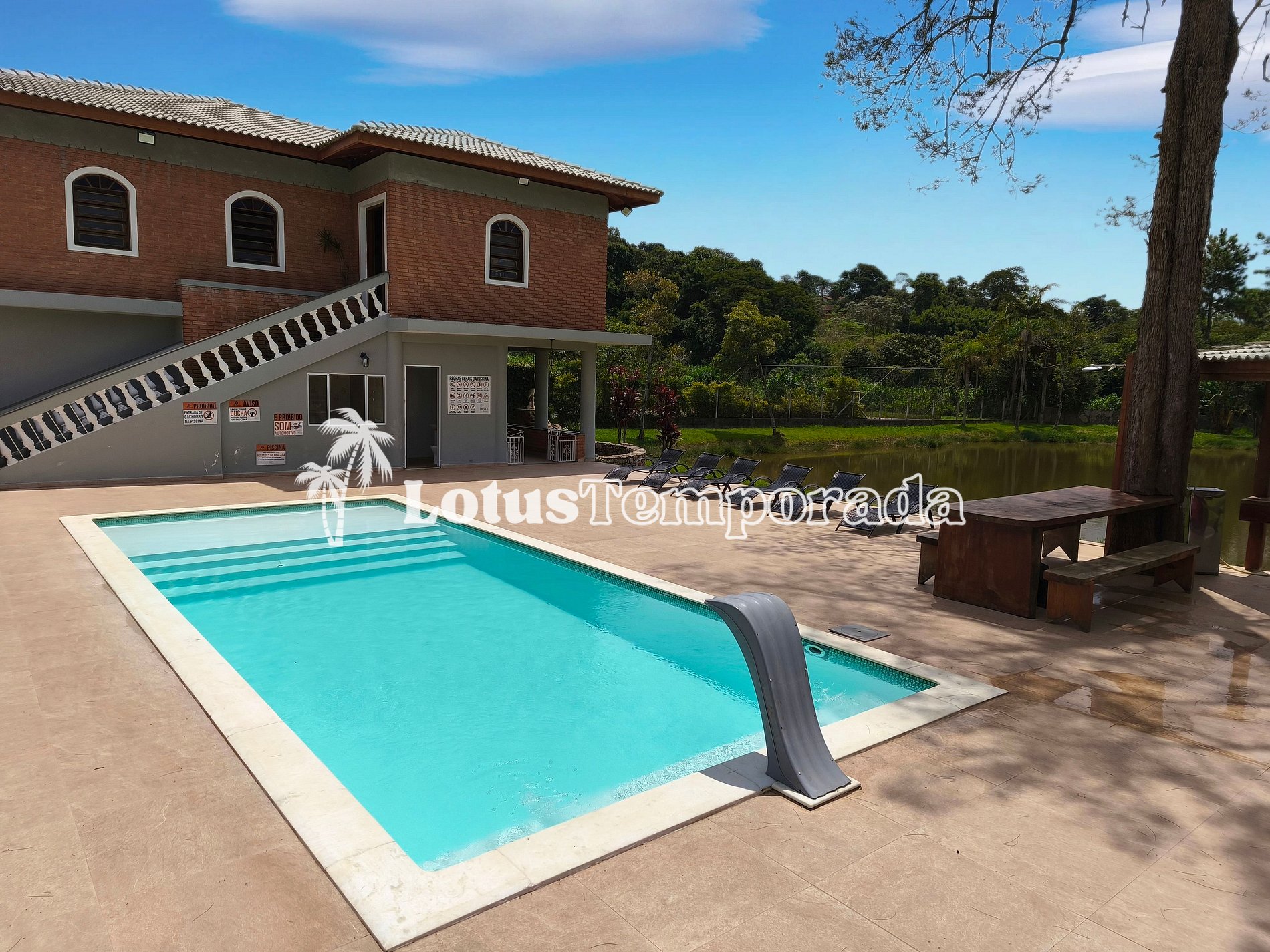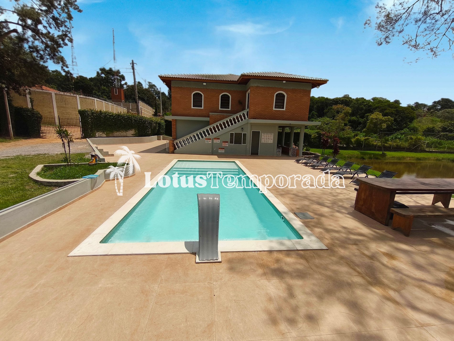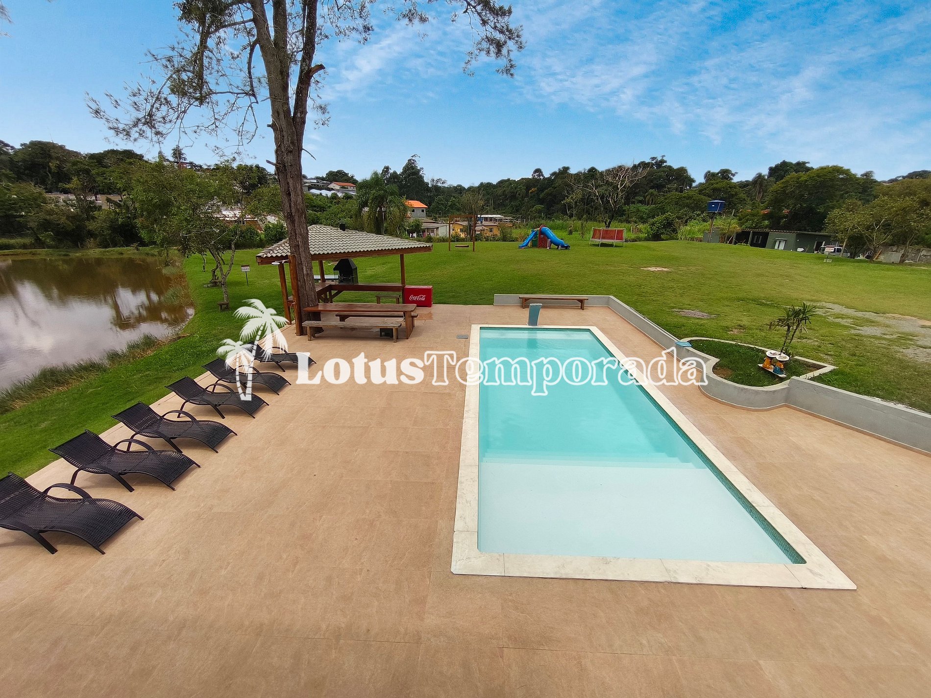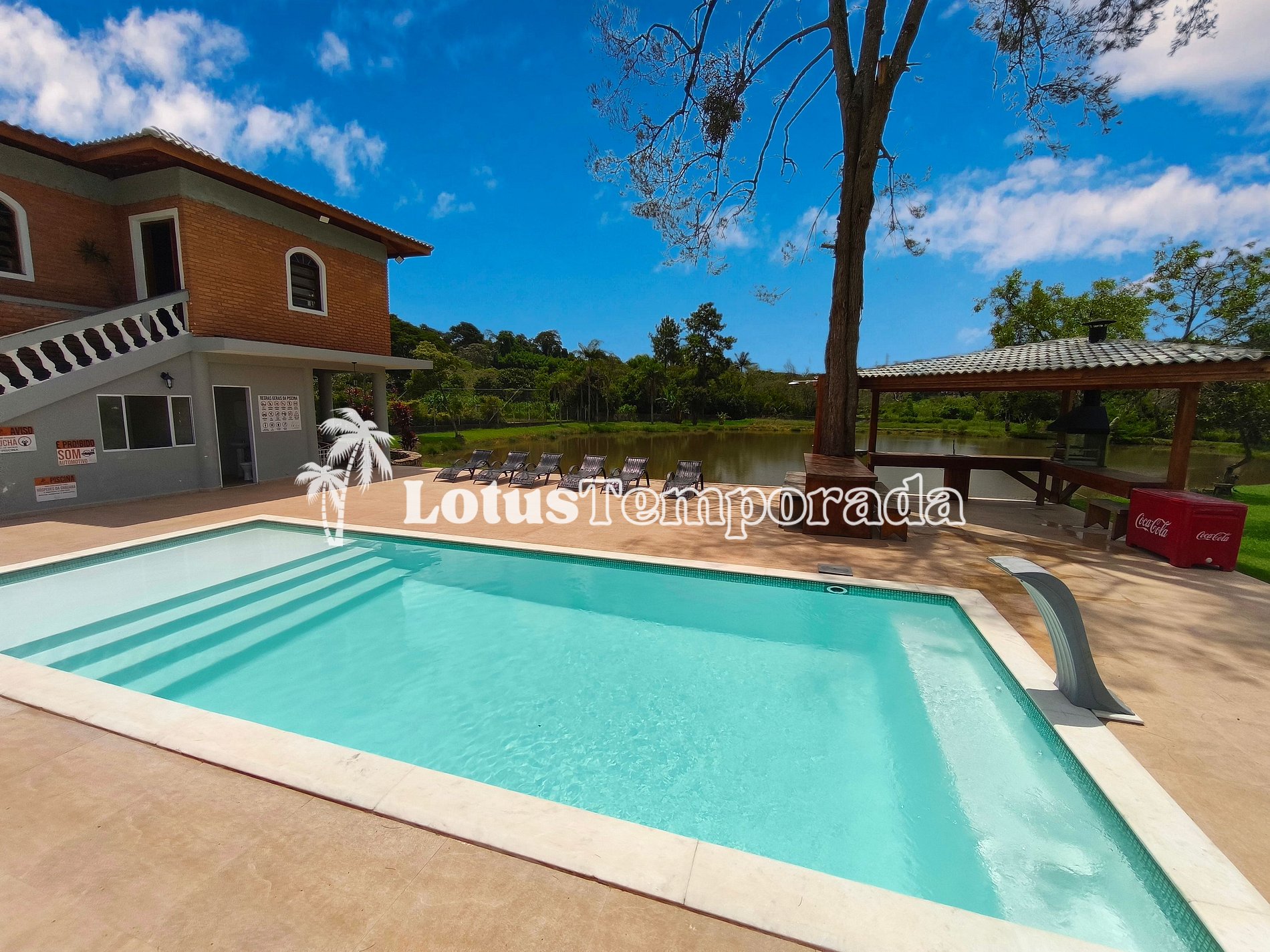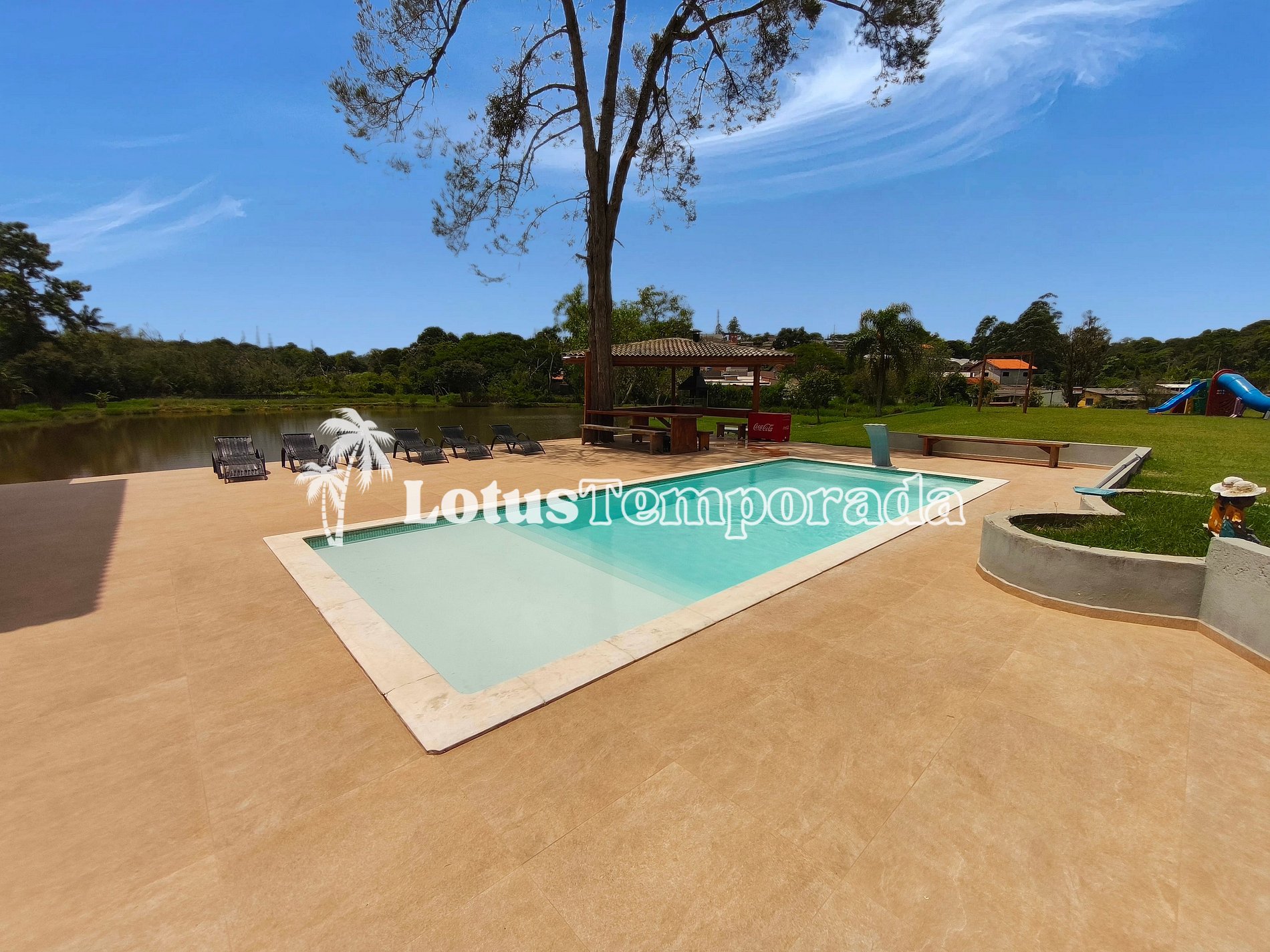 Chácara completa para locação e eventos, com salão de 180m², bar, churrasqueira, mesa de sinuca e pebolim, casa sede com suítes e lavabo, piscina com cascata, playground, área gourmet, fogueira e gramado com vista para o lago.