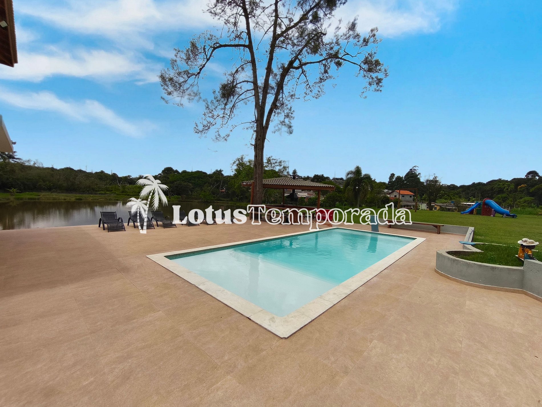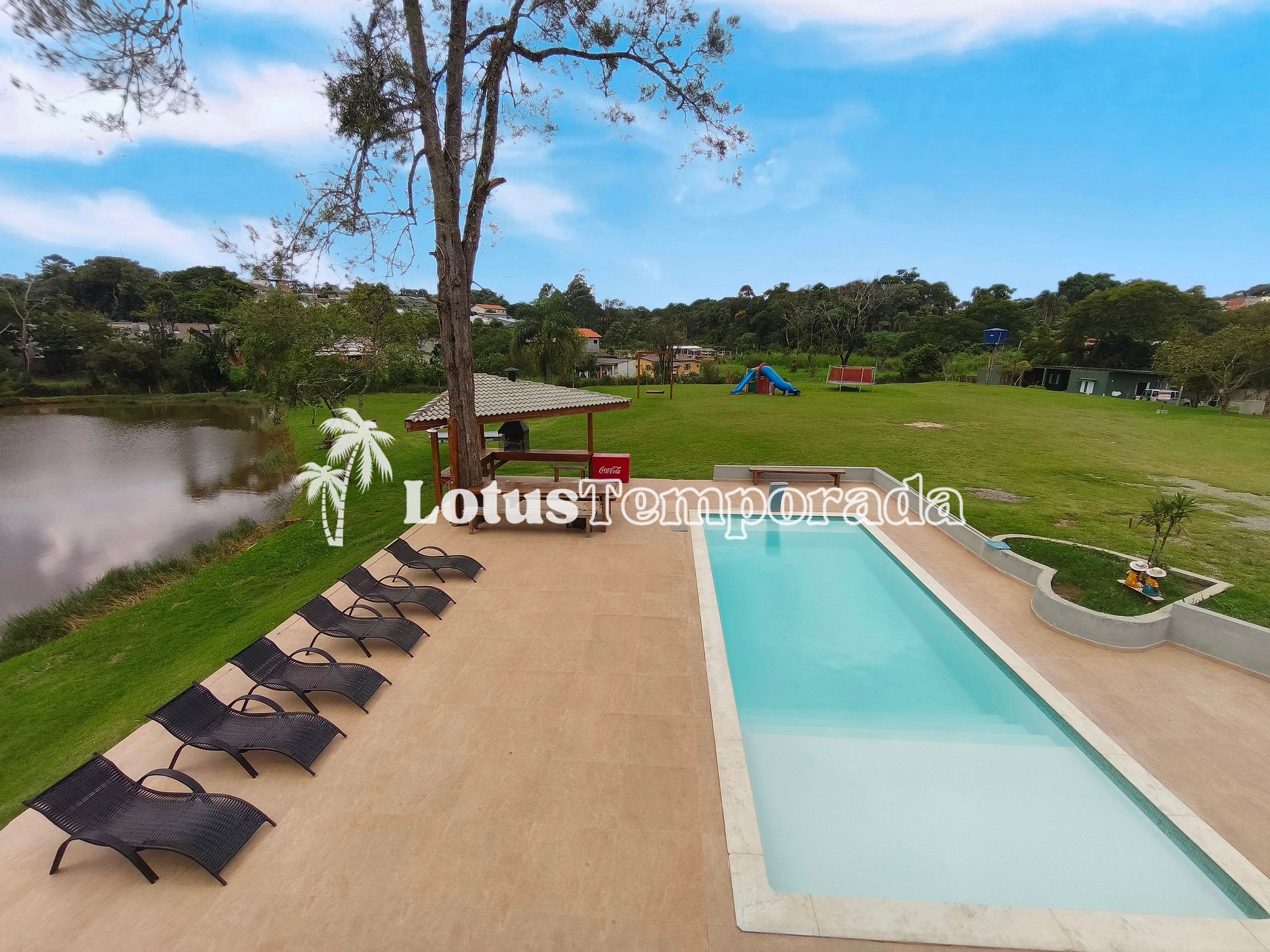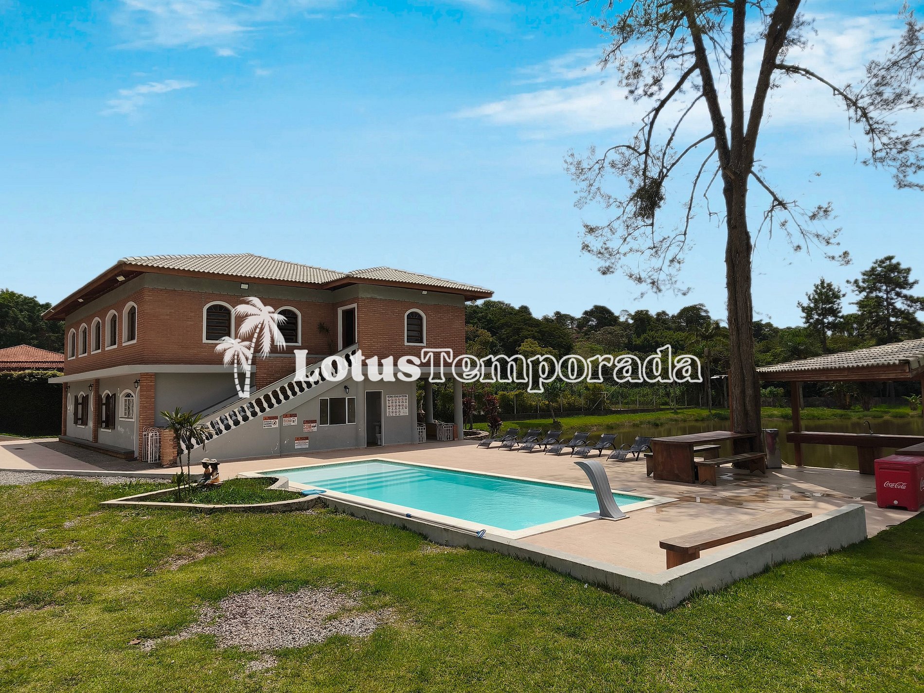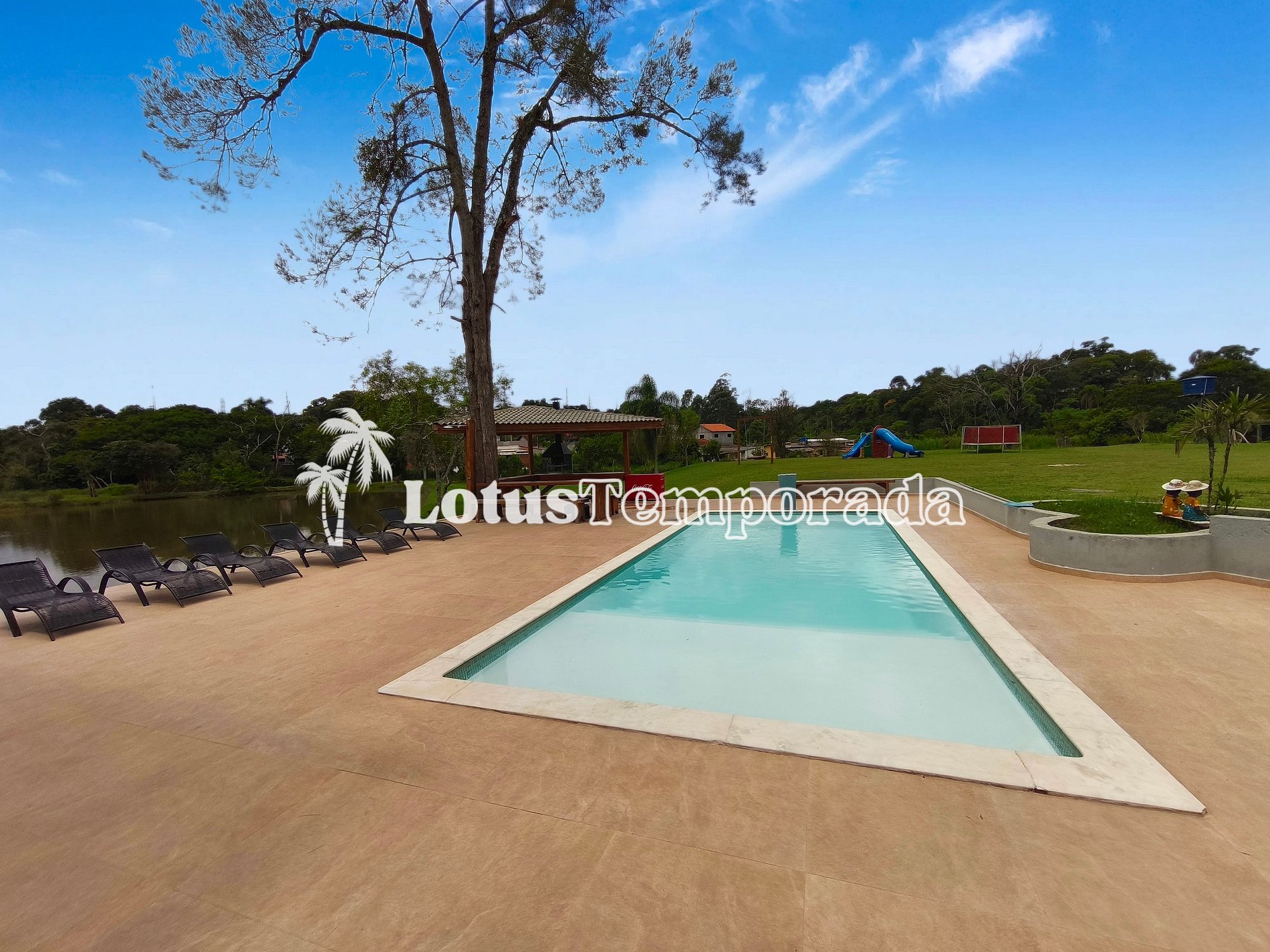 Chácara completa para locação e eventos, com salão de 180m², bar, churrasqueira, mesa de sinuca e pebolim, casa sede com suítes e lavabo, piscina com cascata, playground, área gourmet, fogueira e gramado com vista para o lago.