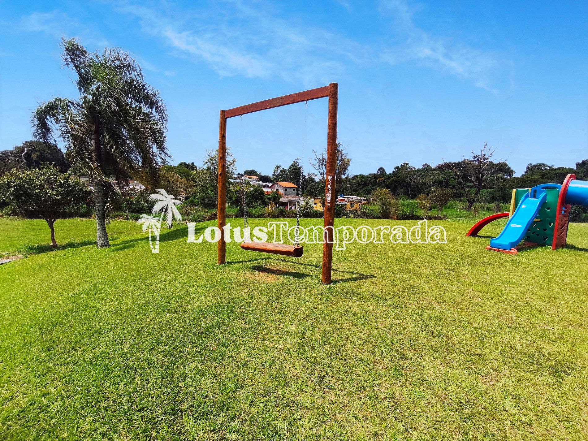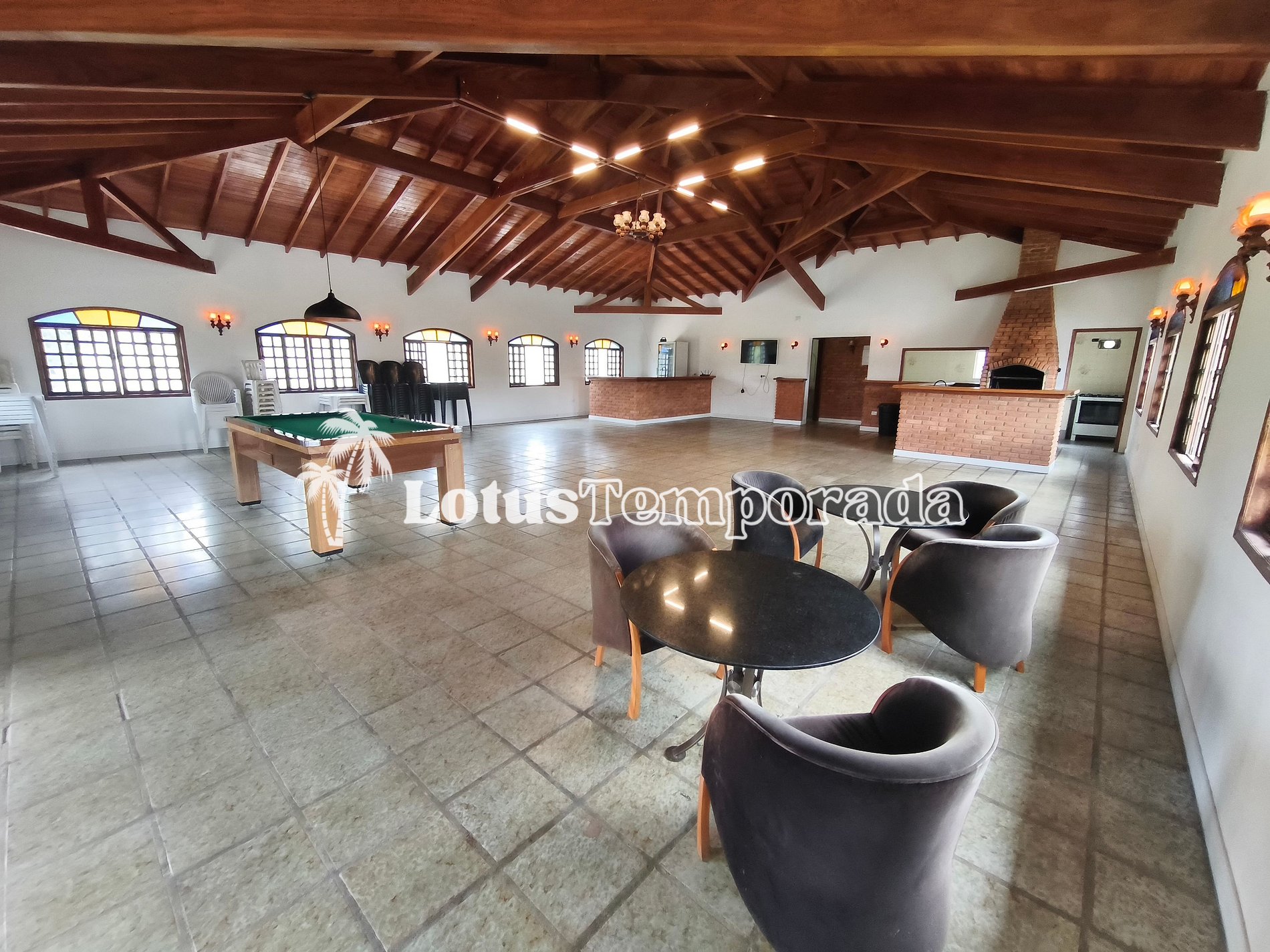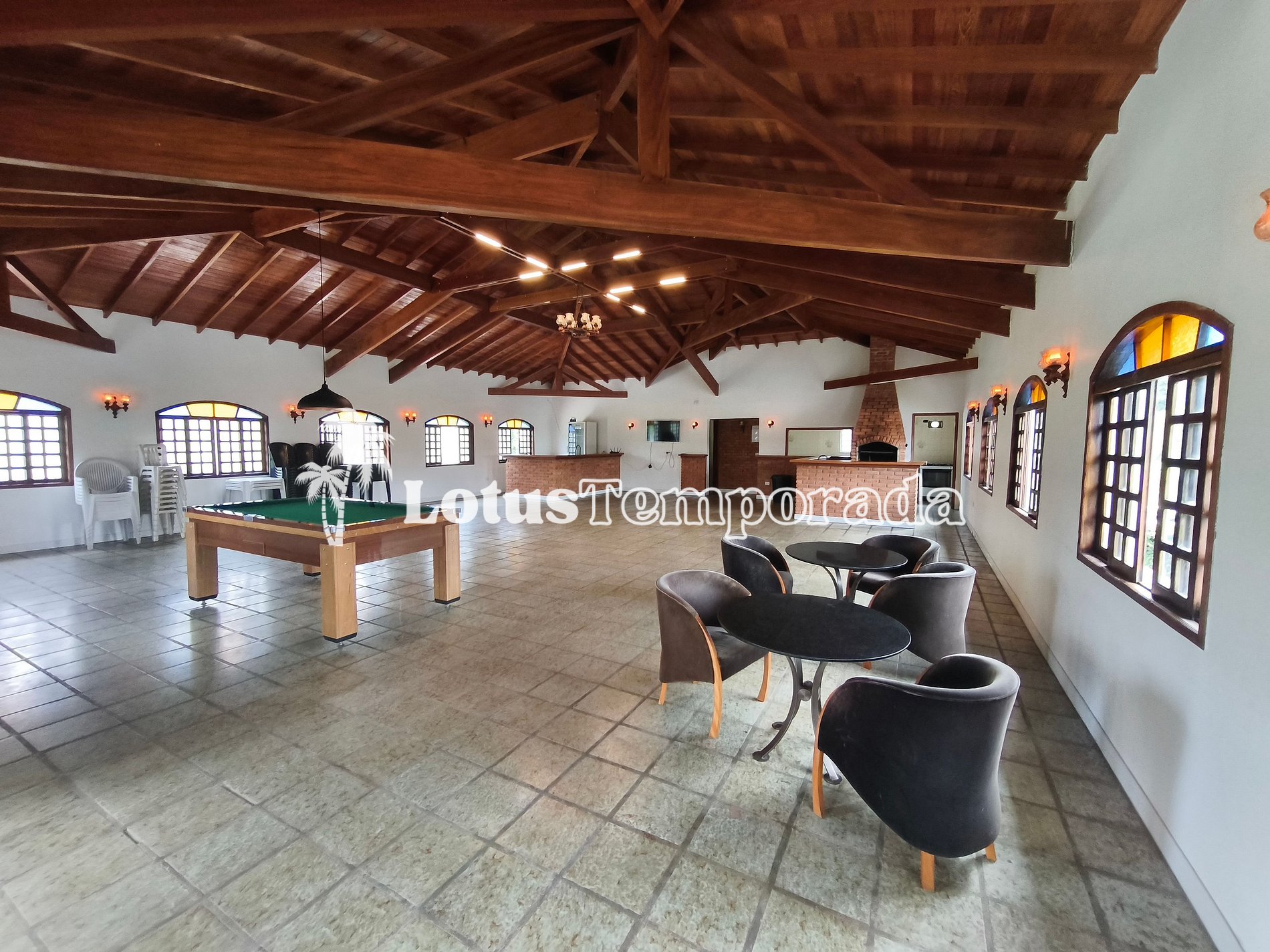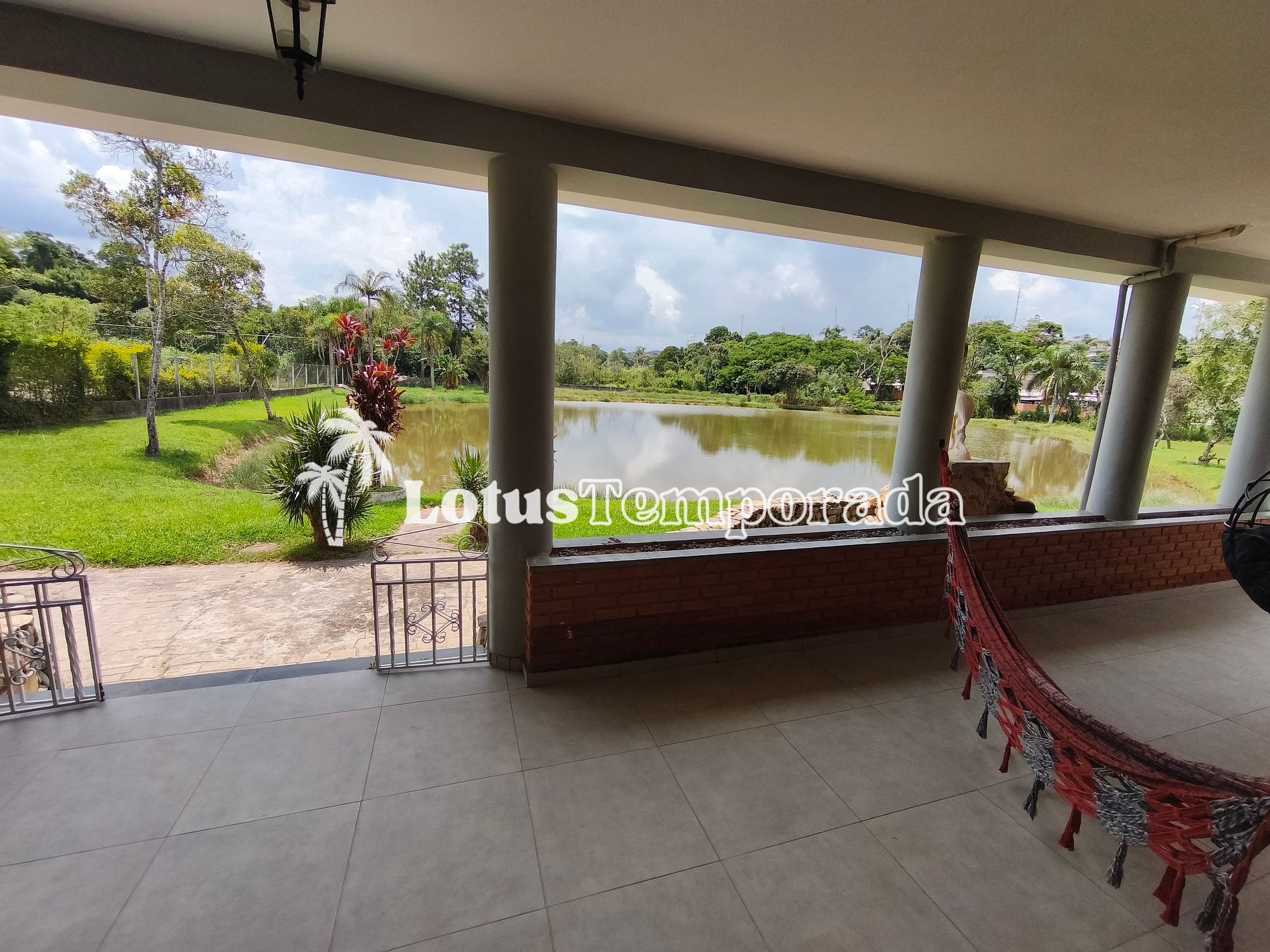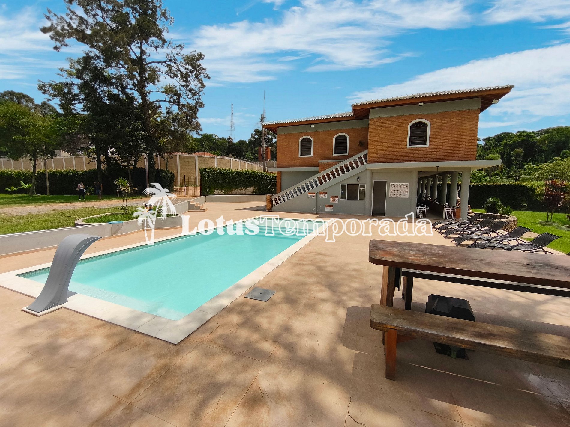 Chácara completa para locação e eventos, com salão de 180m², bar, churrasqueira, mesa de sinuca e pebolim, casa sede com suítes e lavabo, piscina com cascata, playground, área gourmet, fogueira e gramado com vista para o lago.