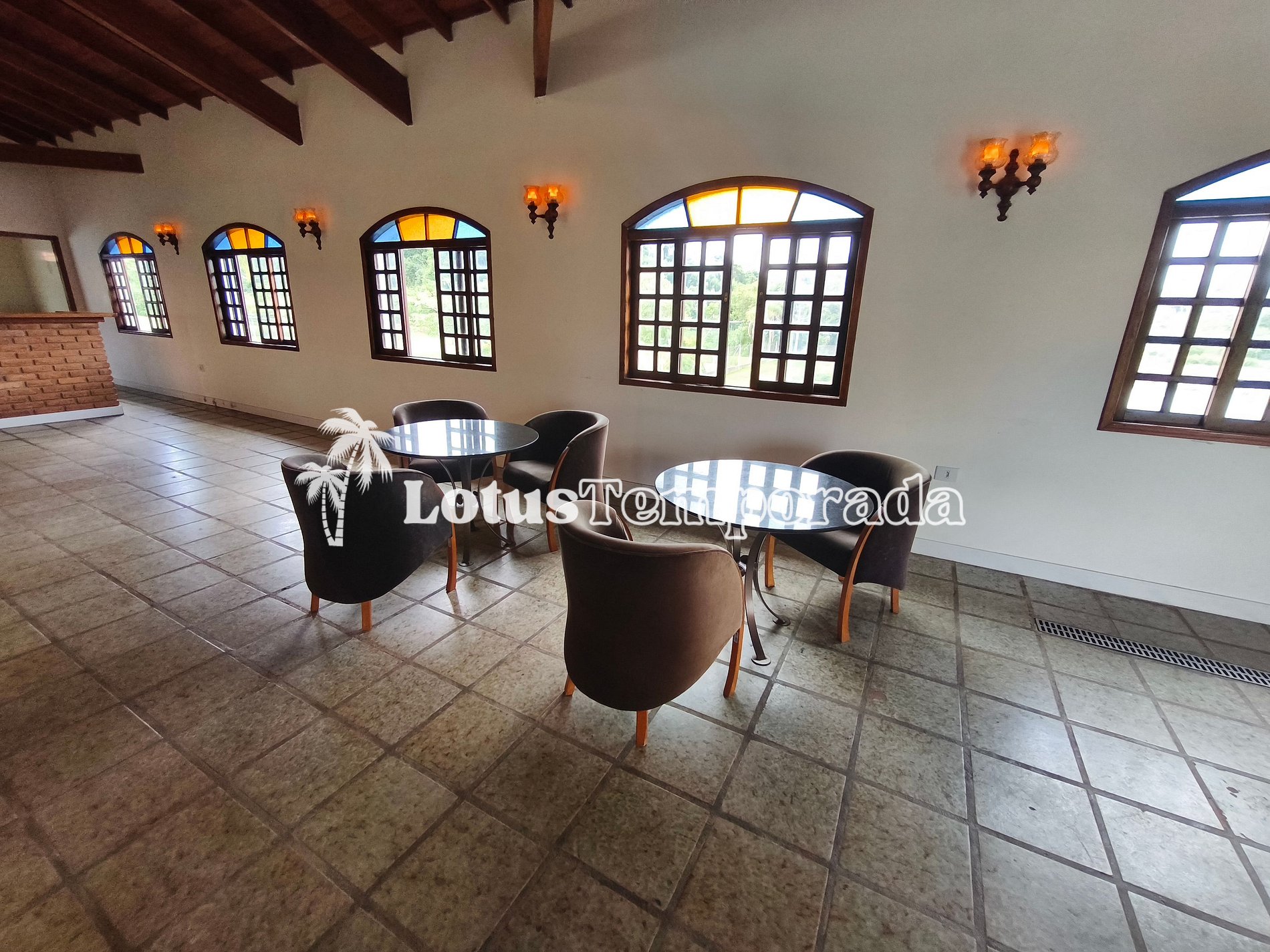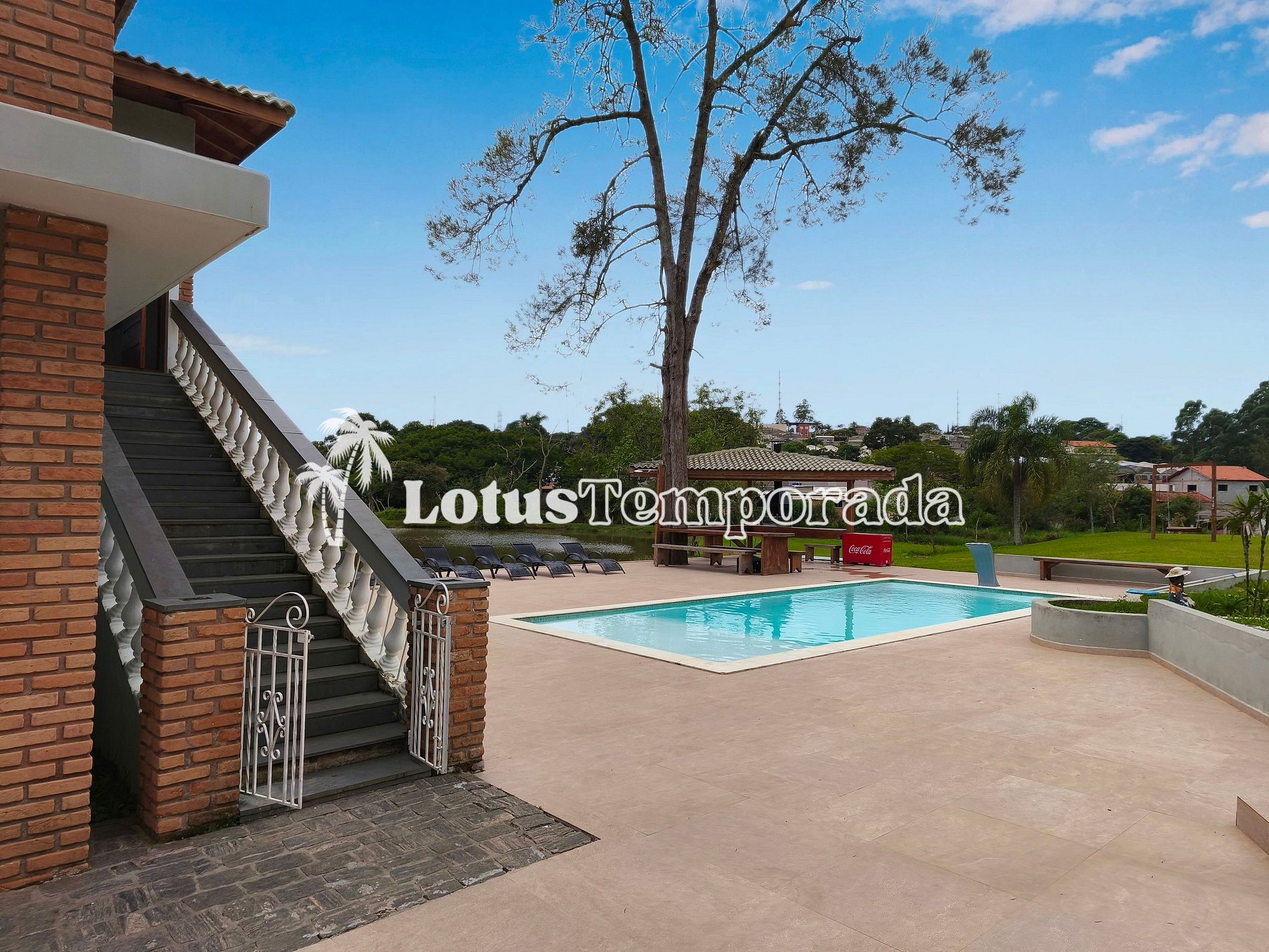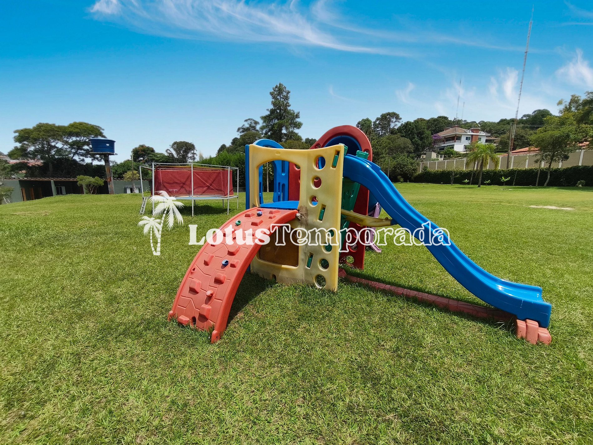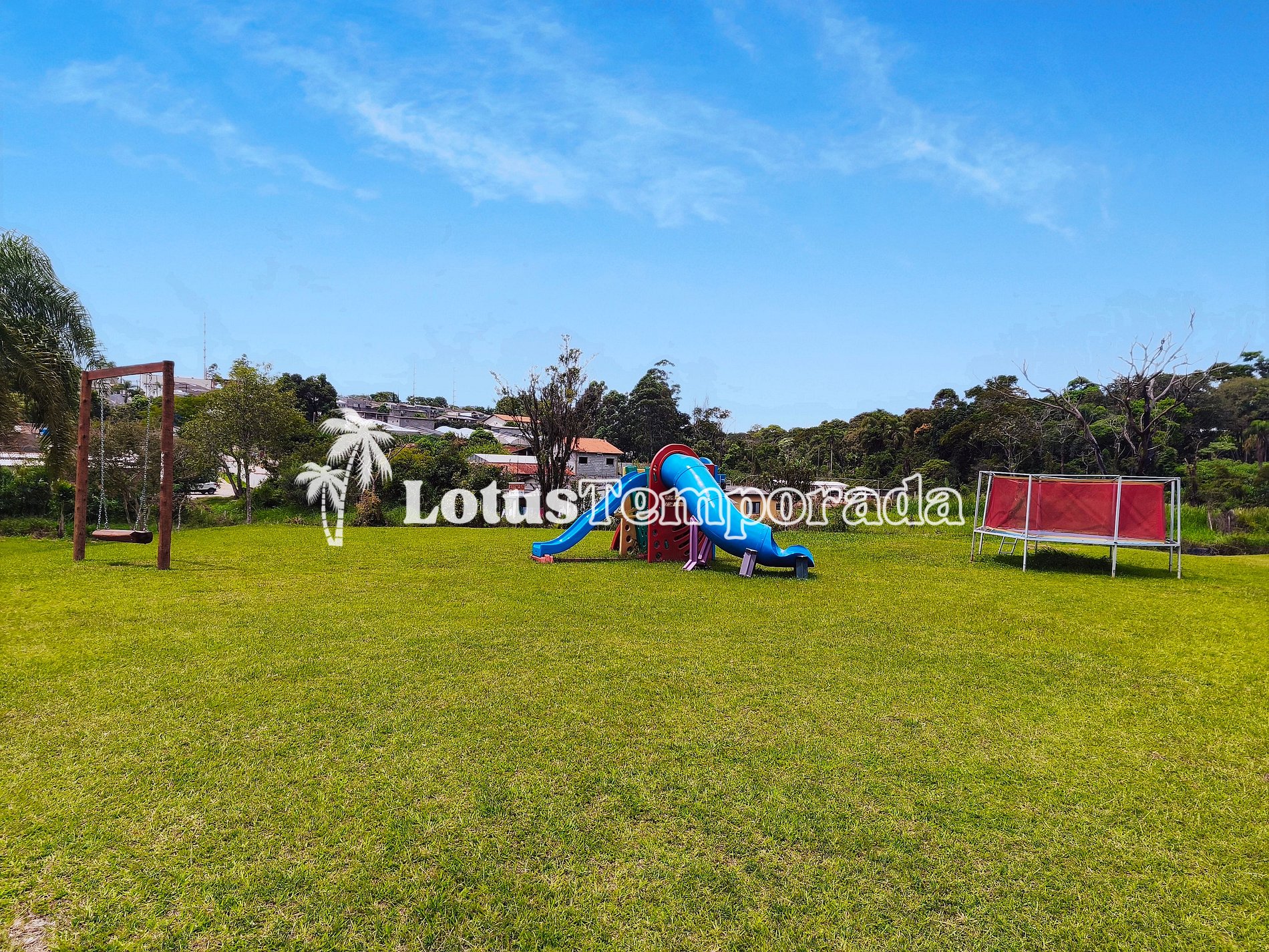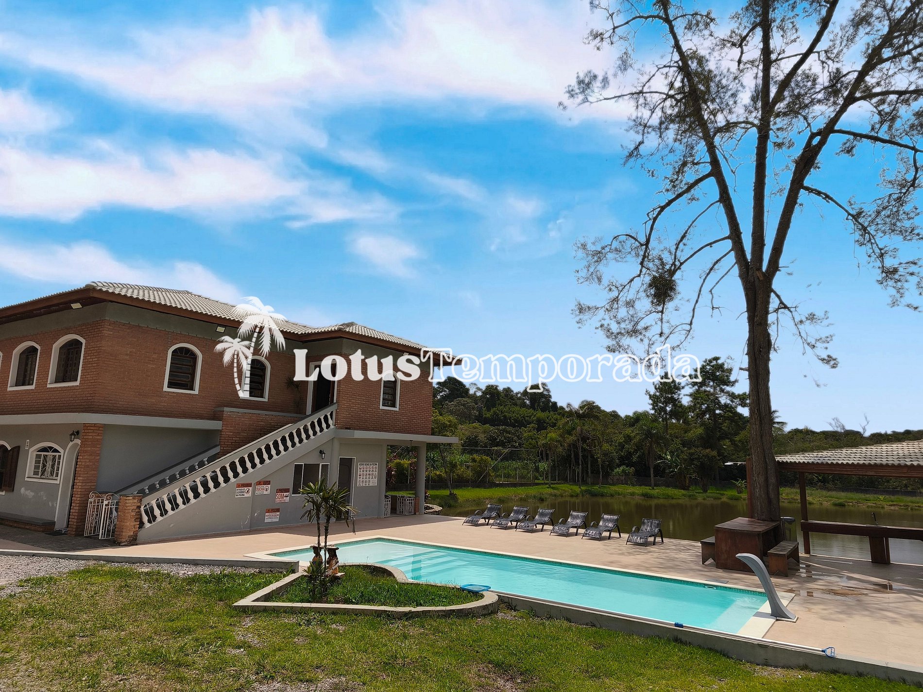 Chácara completa para locação e eventos, com salão de 180m², bar, churrasqueira, mesa de sinuca e pebolim, casa sede com suítes e lavabo, piscina com cascata, playground, área gourmet, fogueira e gramado com vista para o lago.