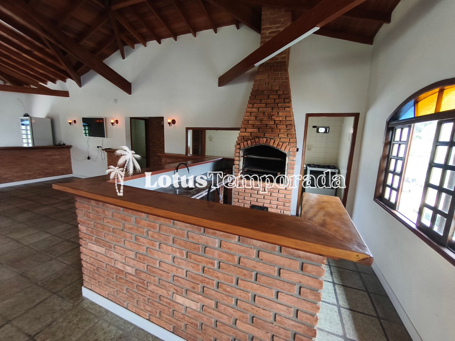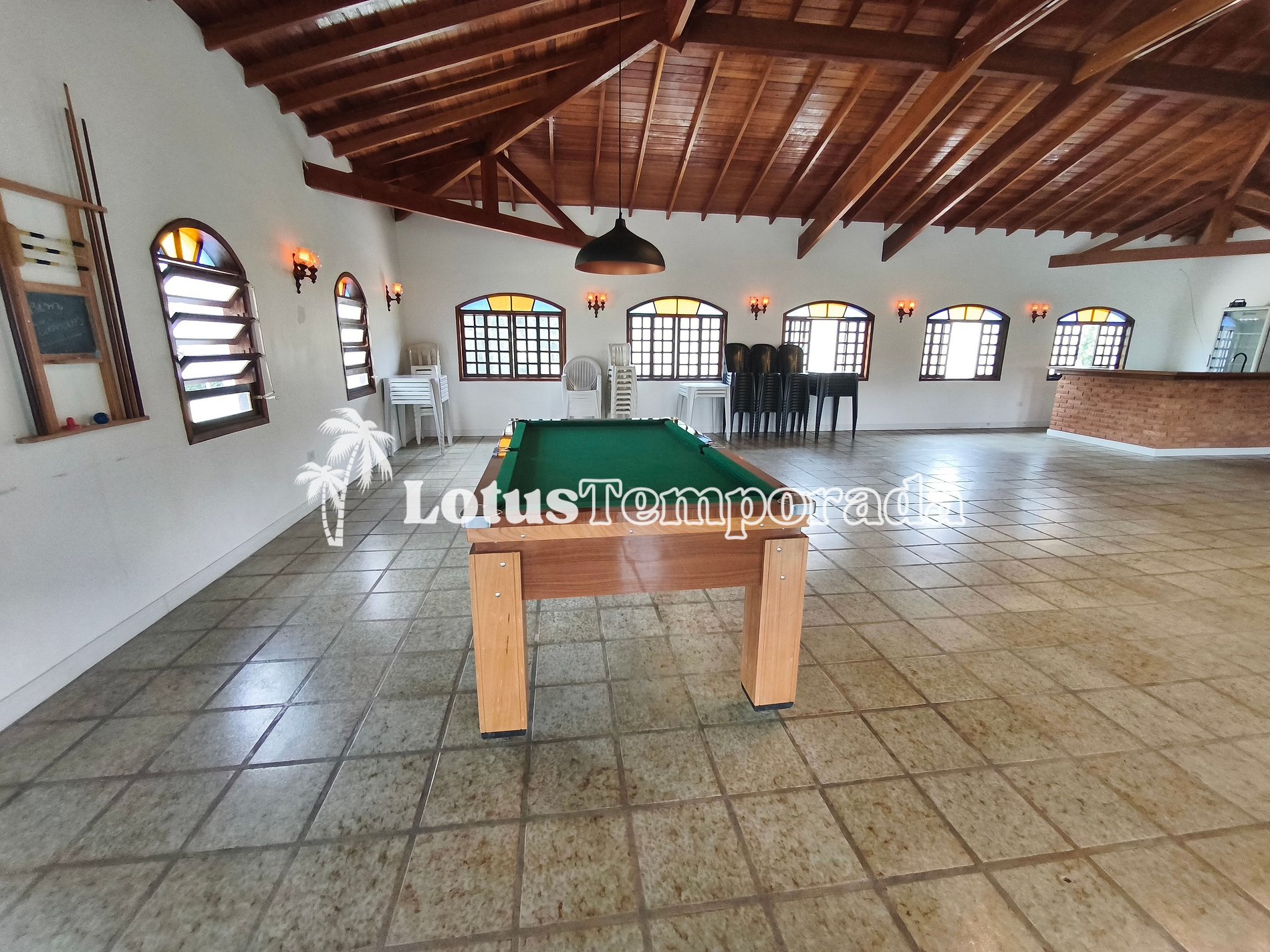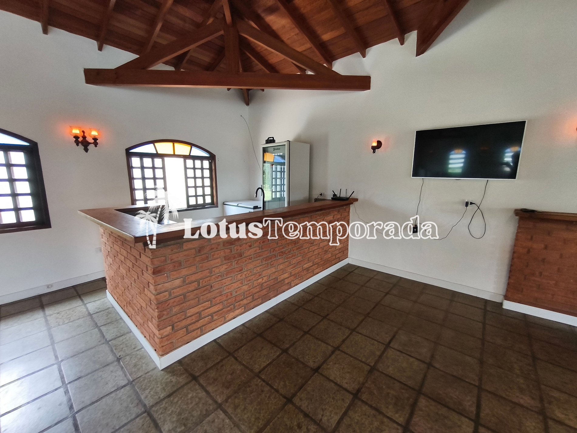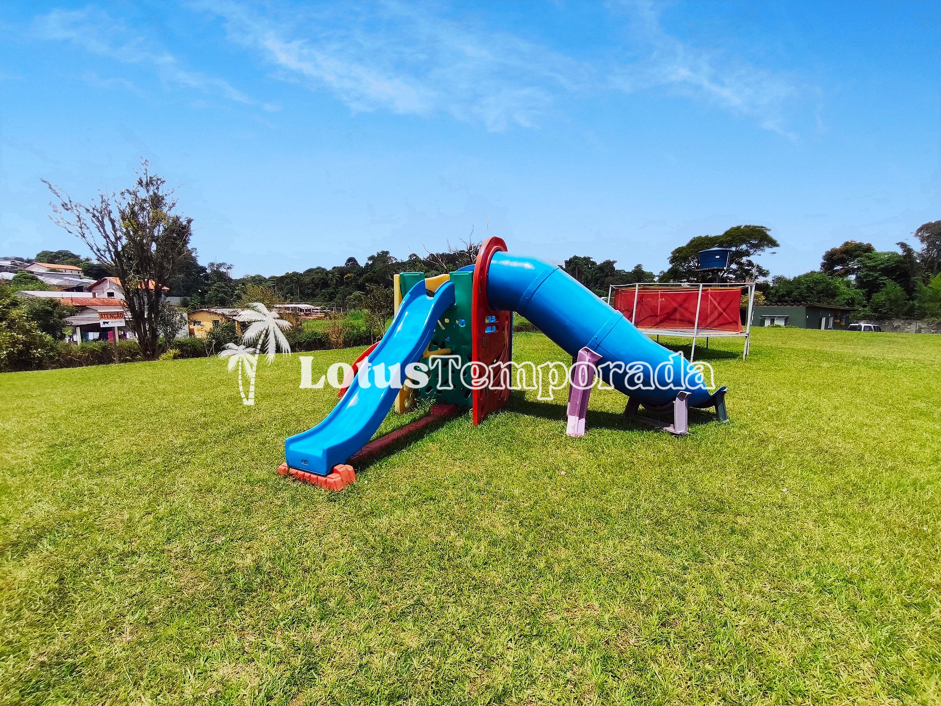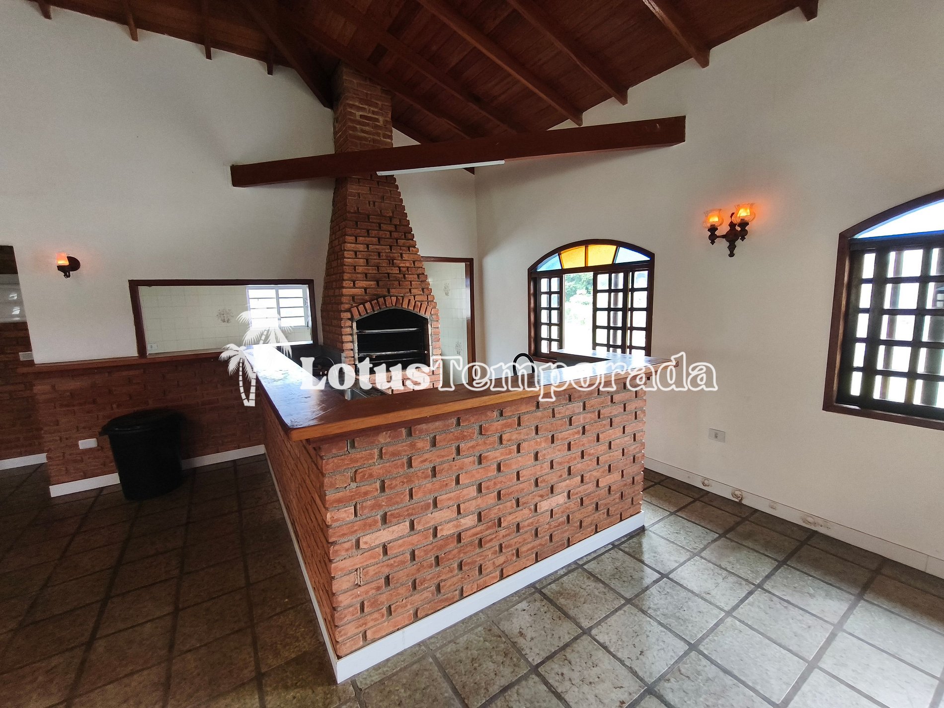 Chácara completa para locação e eventos, com salão de 180m², bar, churrasqueira, mesa de sinuca e pebolim, casa sede com suítes e lavabo, piscina com cascata, playground, área gourmet, fogueira e gramado com vista para o lago.