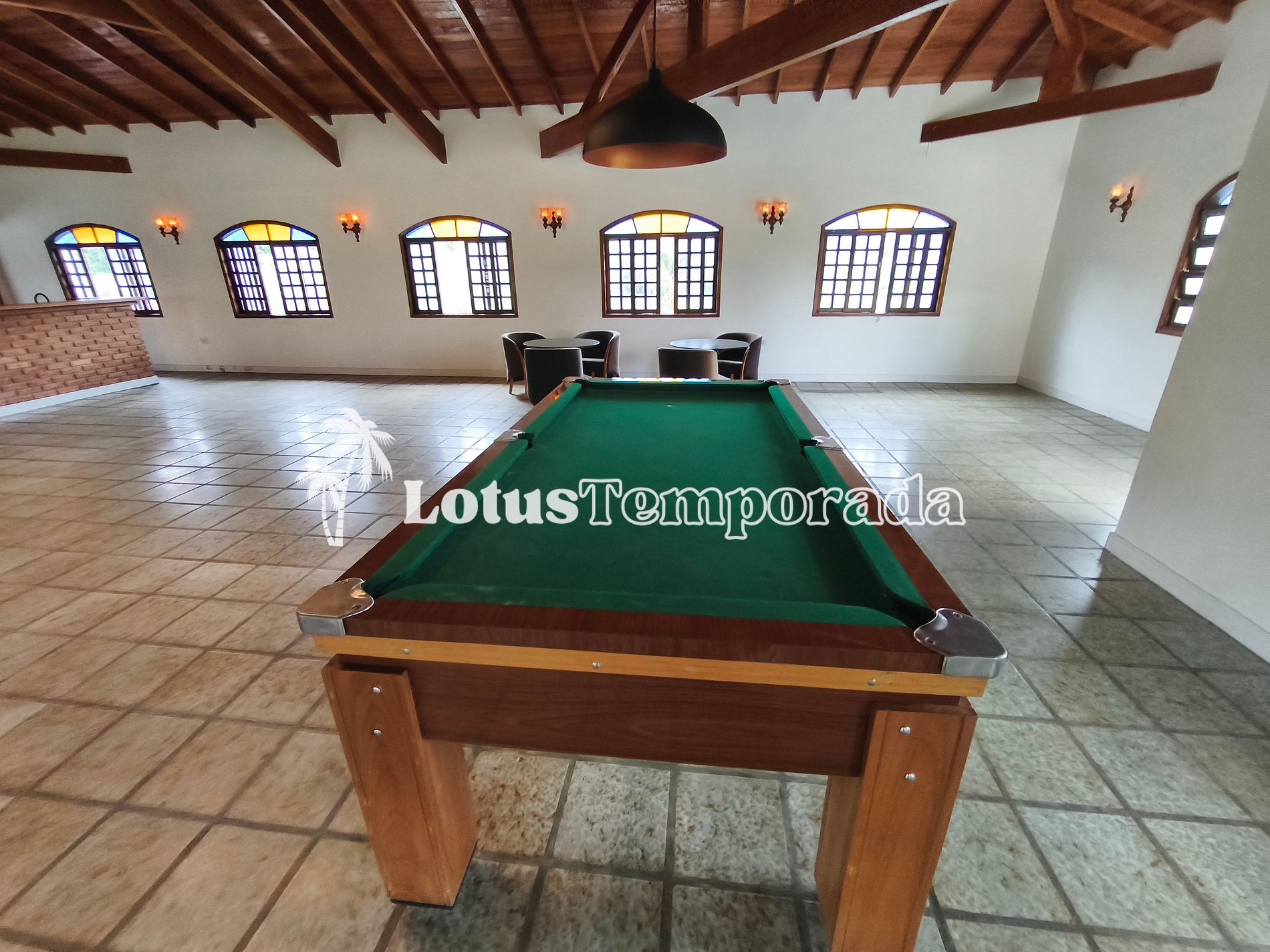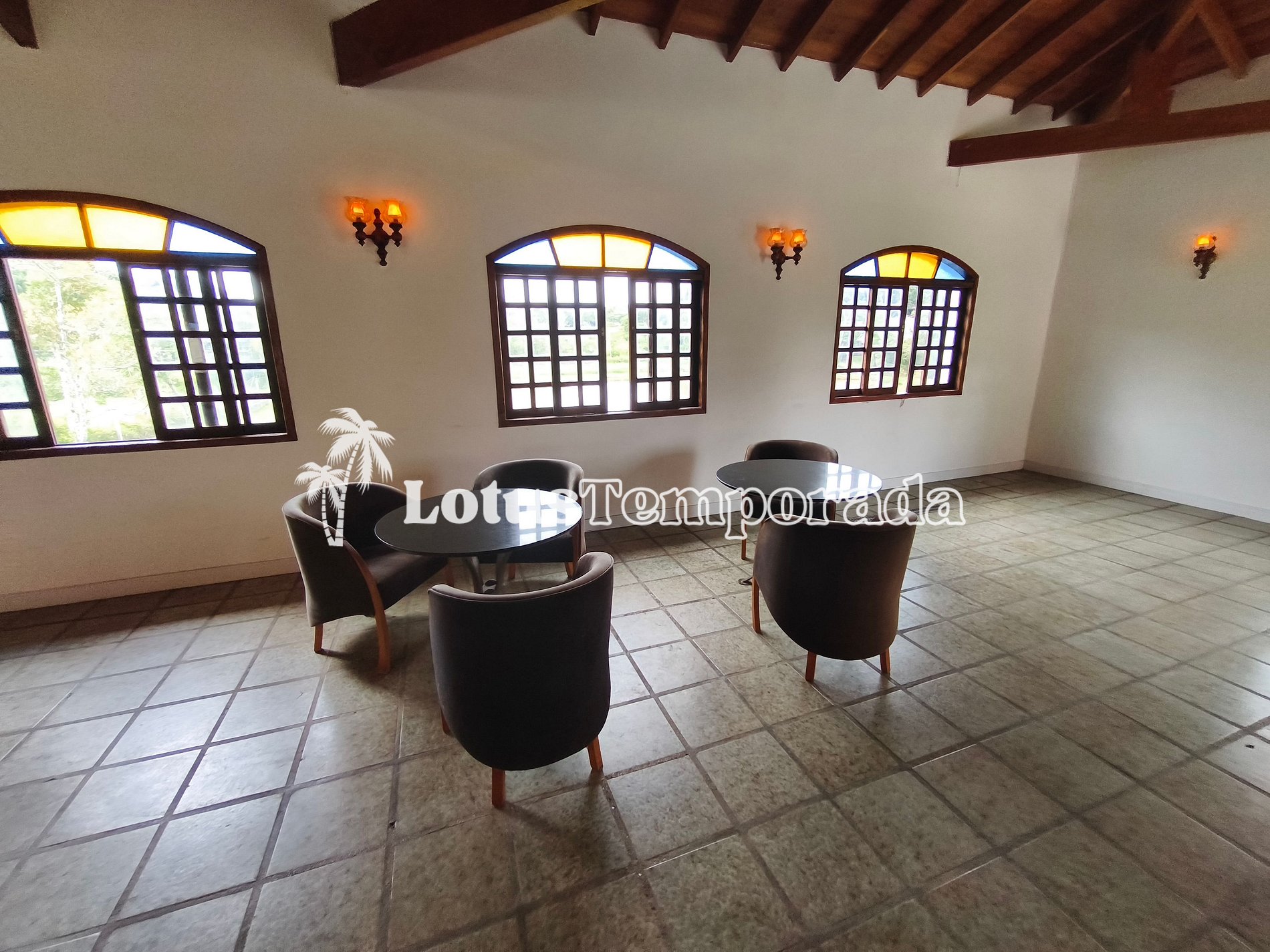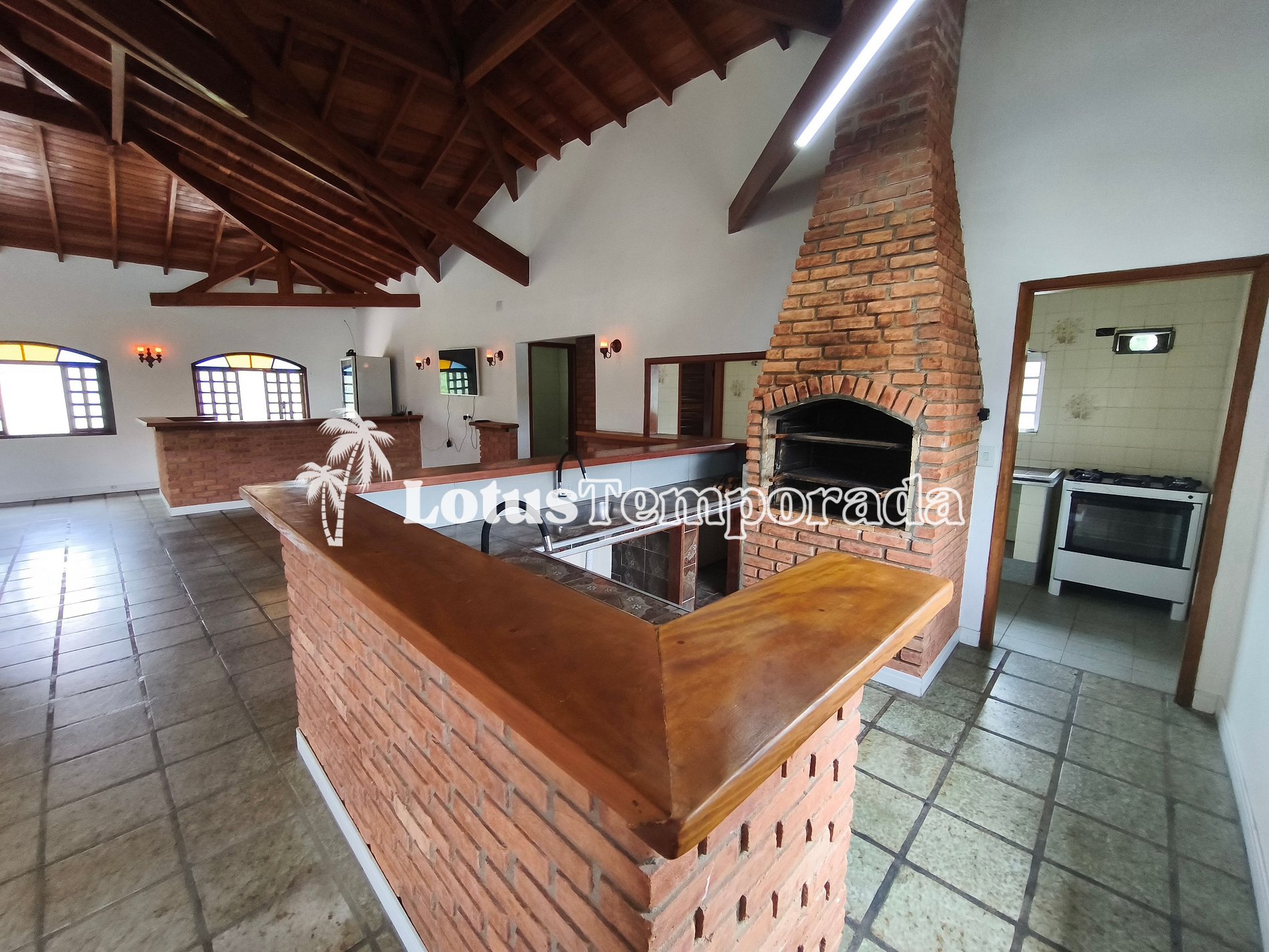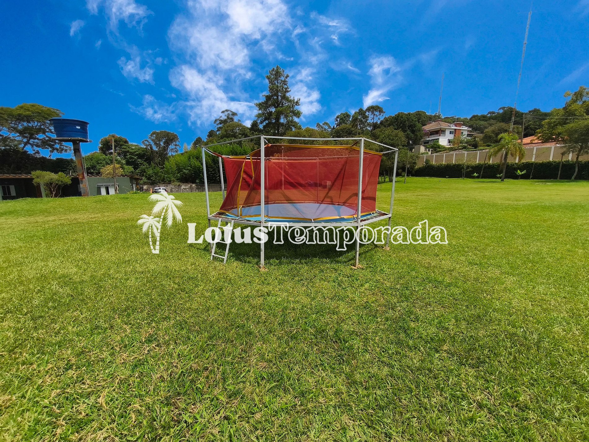Chácara completa para locação e eventos, com salão de 180m², bar, churrasqueira, mesa de sinuca e pebolim, casa sede com suítes e lavabo, piscina com cascata, playground, área gourmet, fogueira e gramado com vista para o lago.