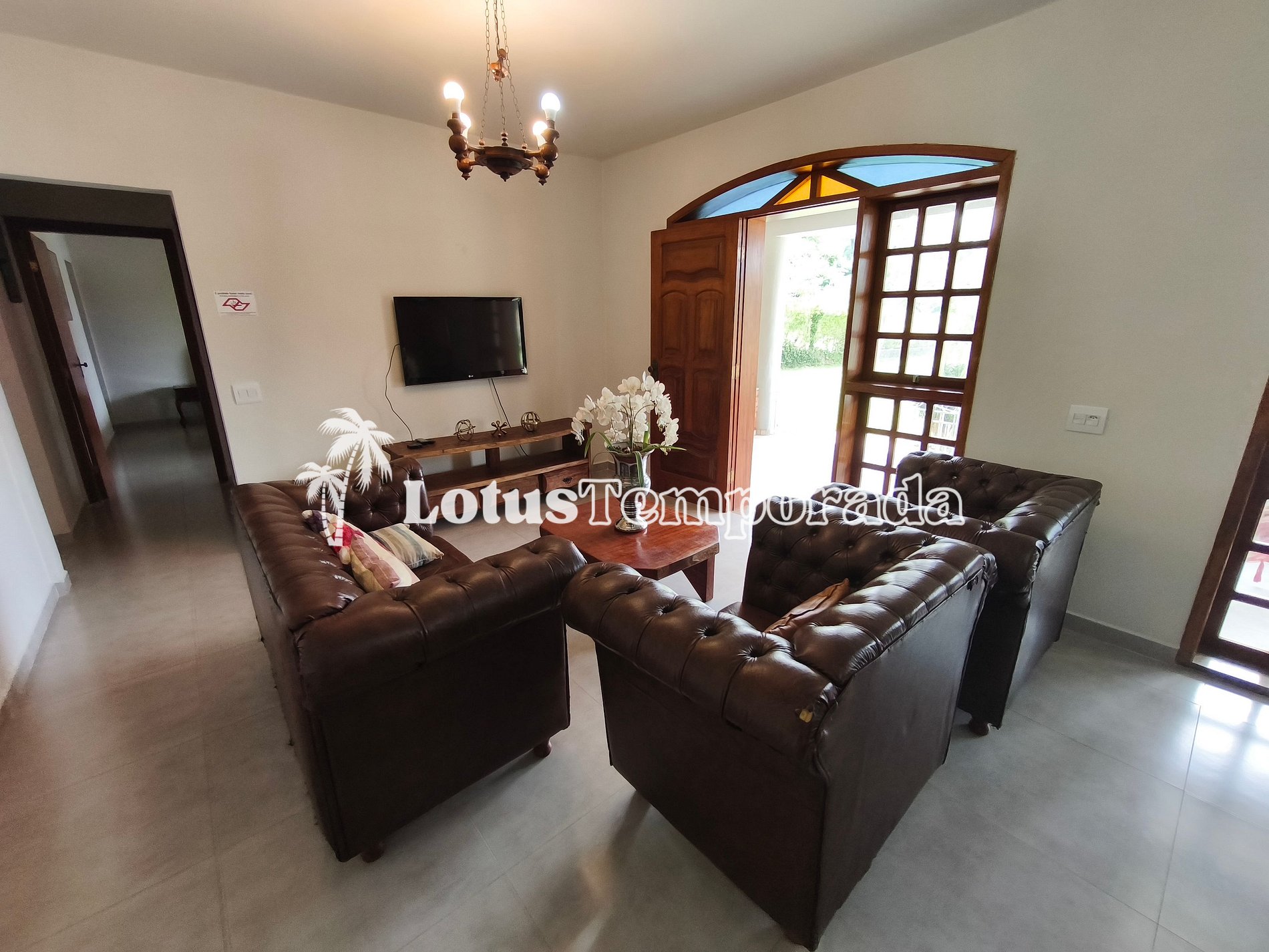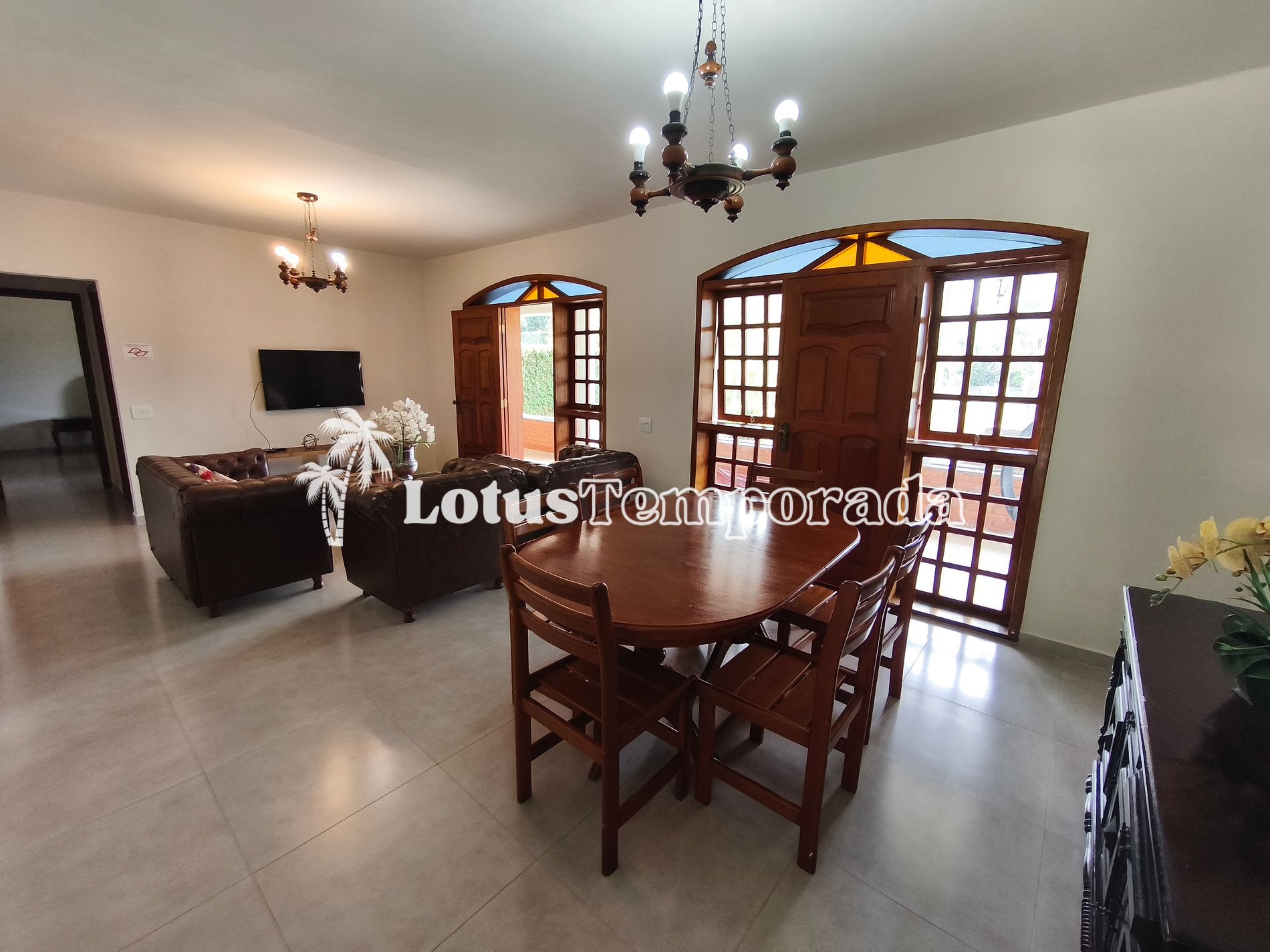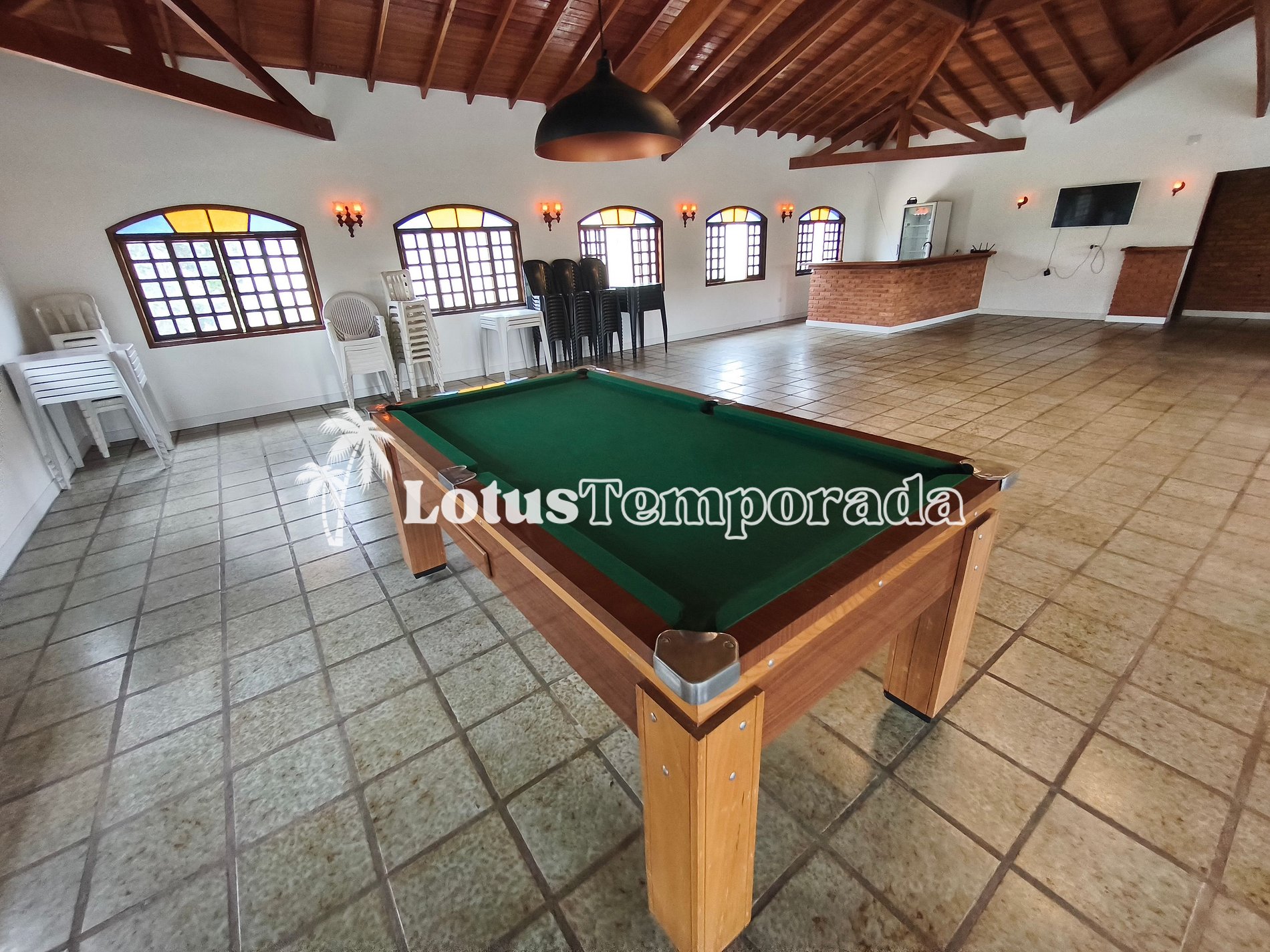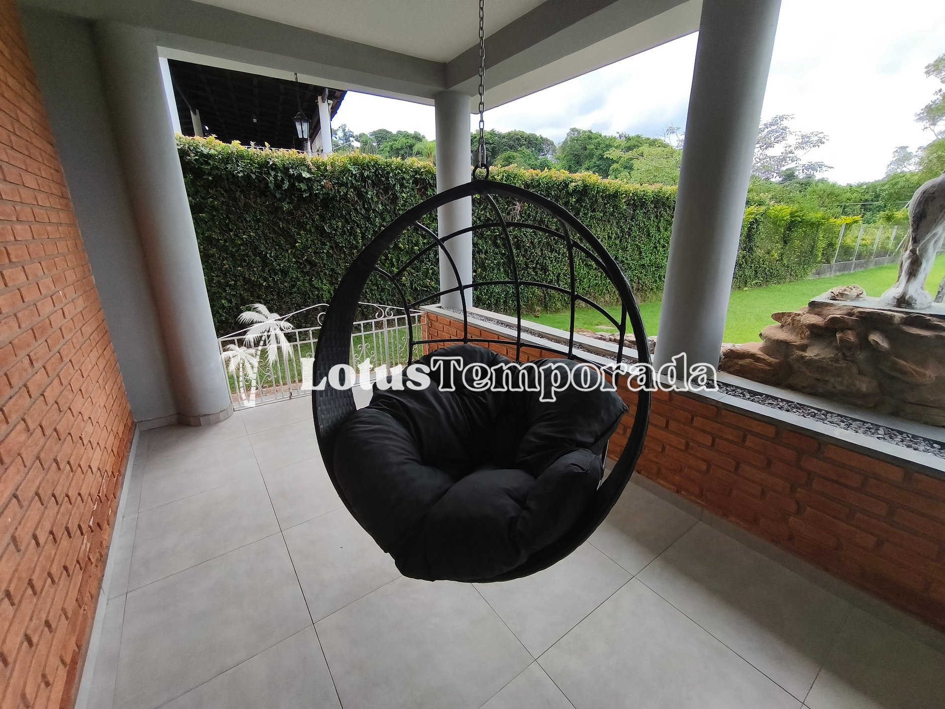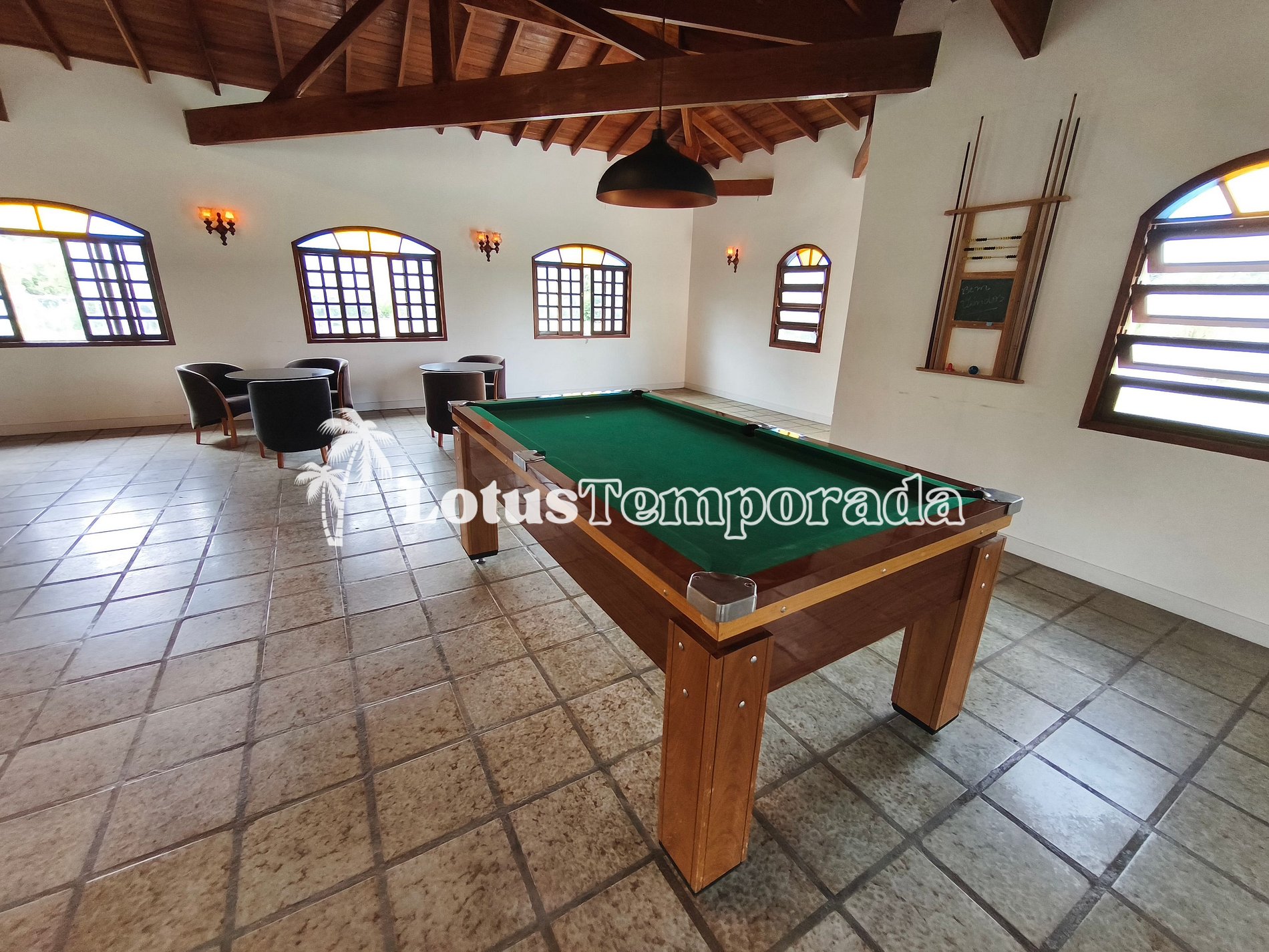 Chácara completa para locação e eventos, com salão de 180m², bar, churrasqueira, mesa de sinuca e pebolim, casa sede com suítes e lavabo, piscina com cascata, playground, área gourmet, fogueira e gramado com vista para o lago.