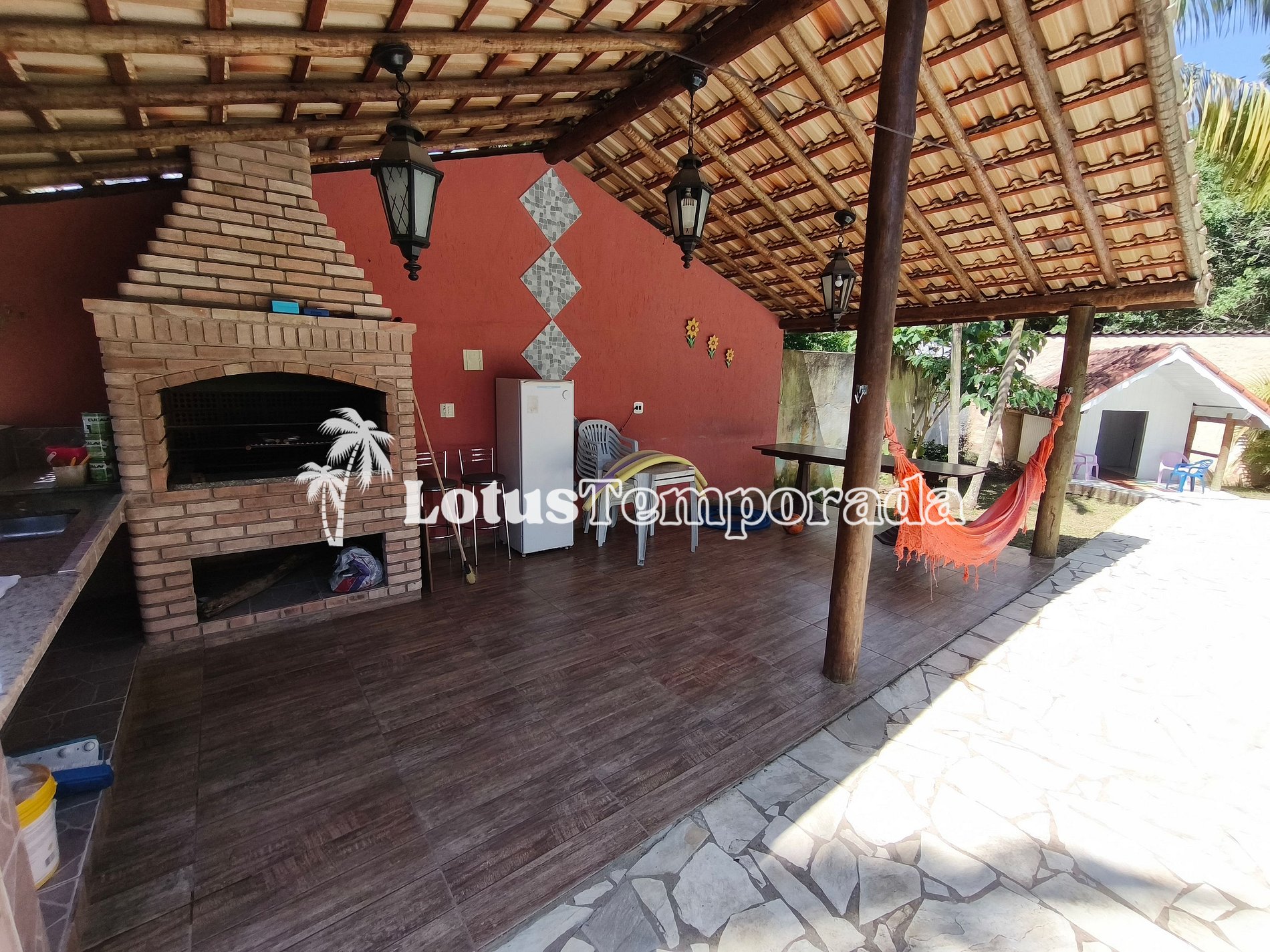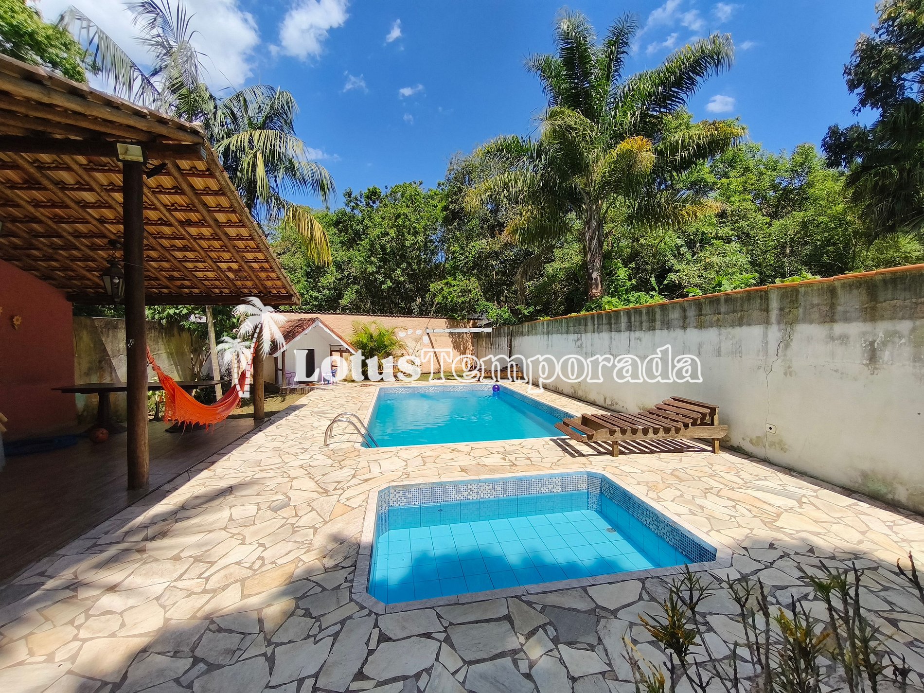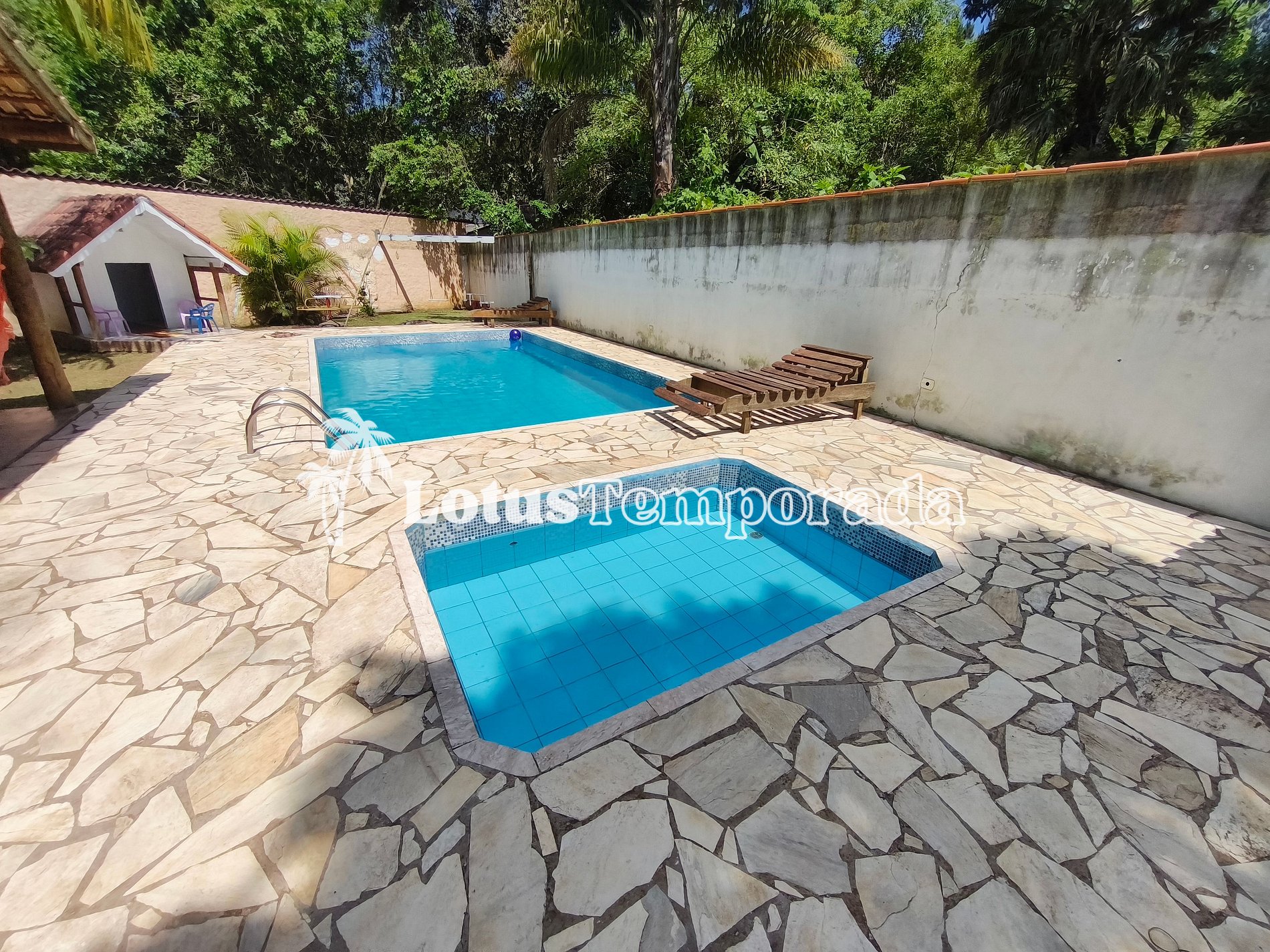A casa principal conta com 2 dormitórios, sendo 1 suíte externa, além de 1 banheiro social interno, sala de TV e cozinha completa. Para maior comodidade, há também 1 banheiro social externo, ideal para uso durante o lazer.