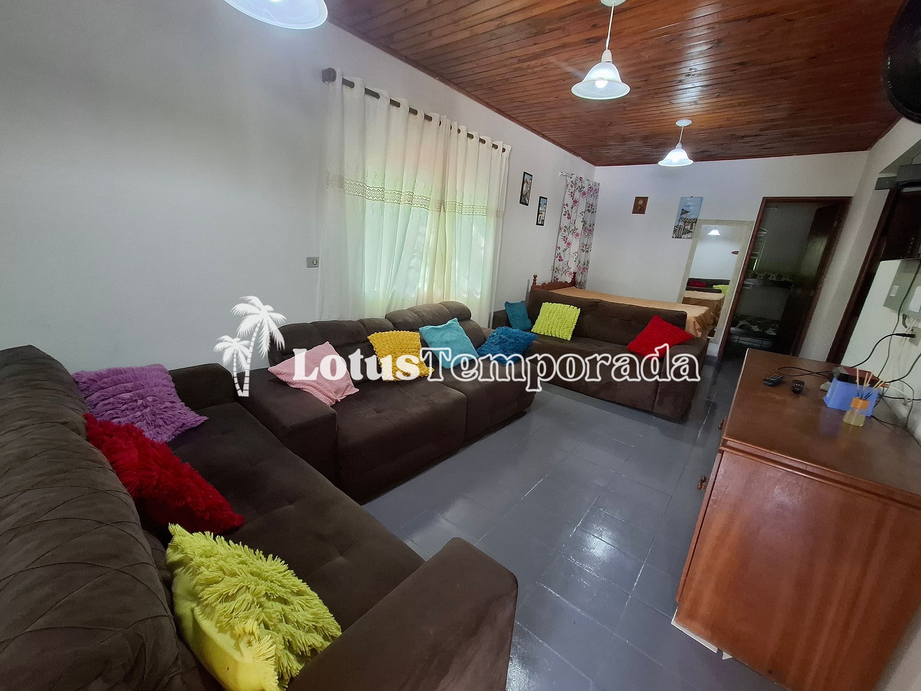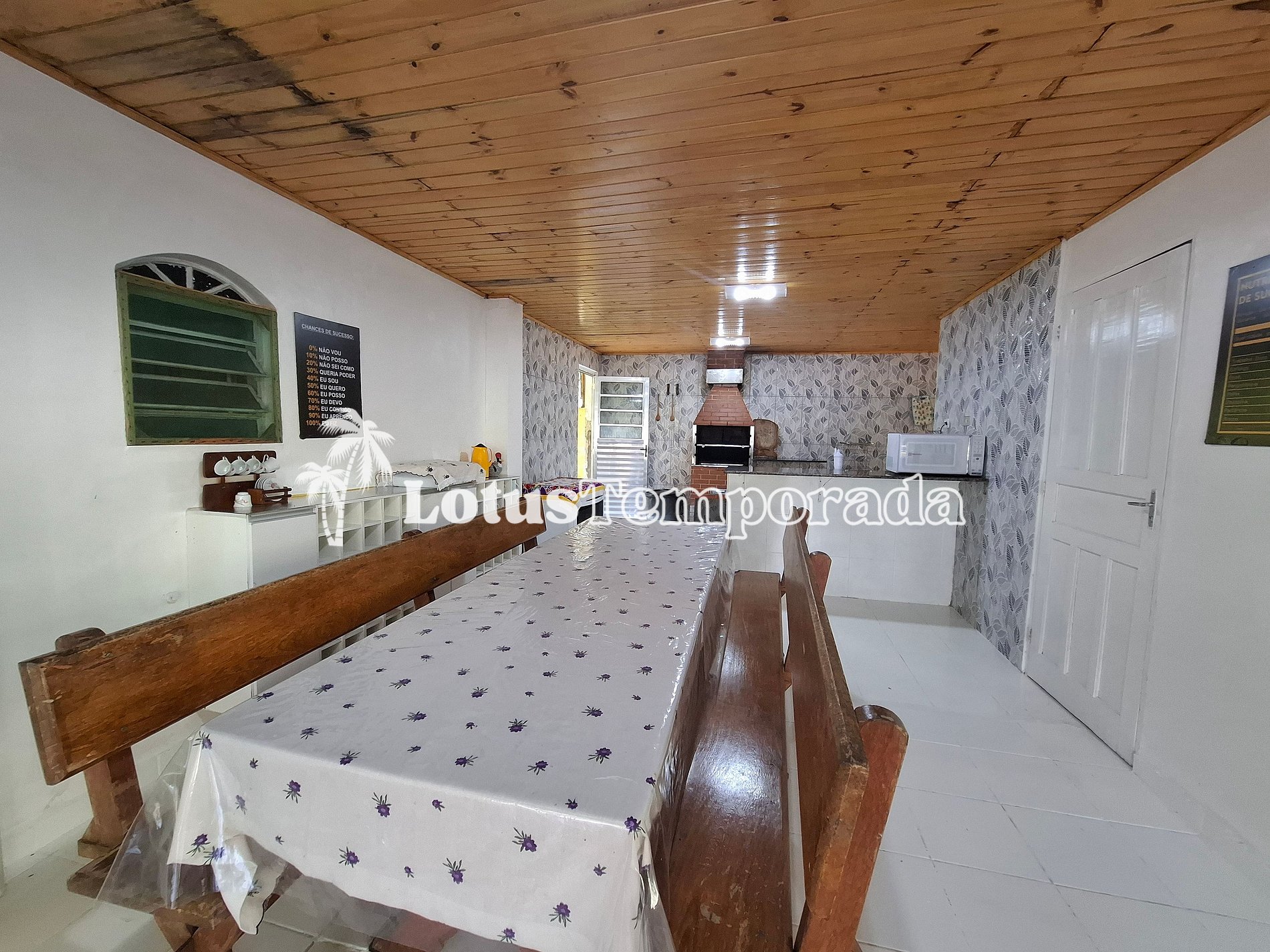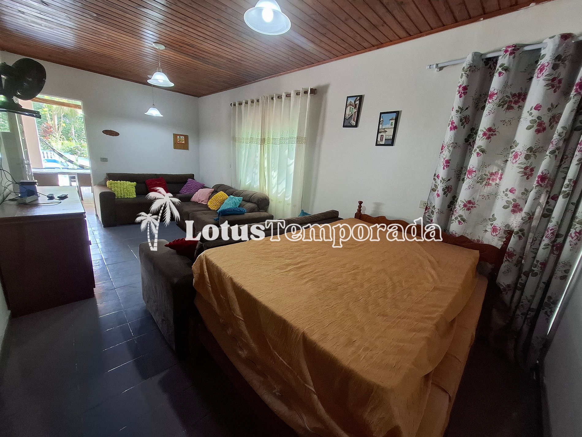 A residência conta com três dormitórios bem ventilados e um banheiro social interno, além de um banheiro externo que oferece praticidade extra durante o uso das áreas comuns. A sala ampla, equipada com TV a cabo, também abriga uma cama de casal, proporcionando um espaço adicional para descanso e relaxamento.
