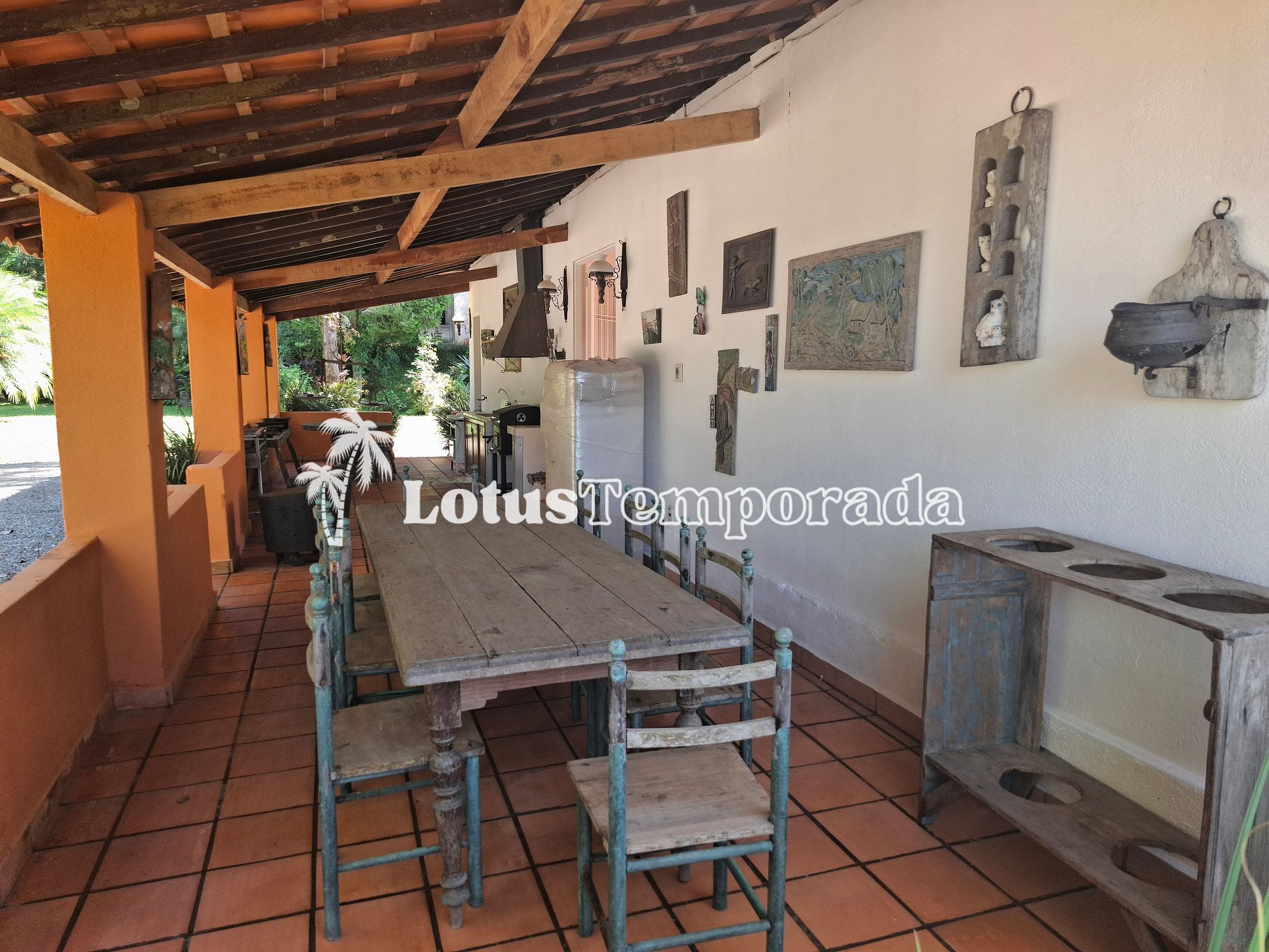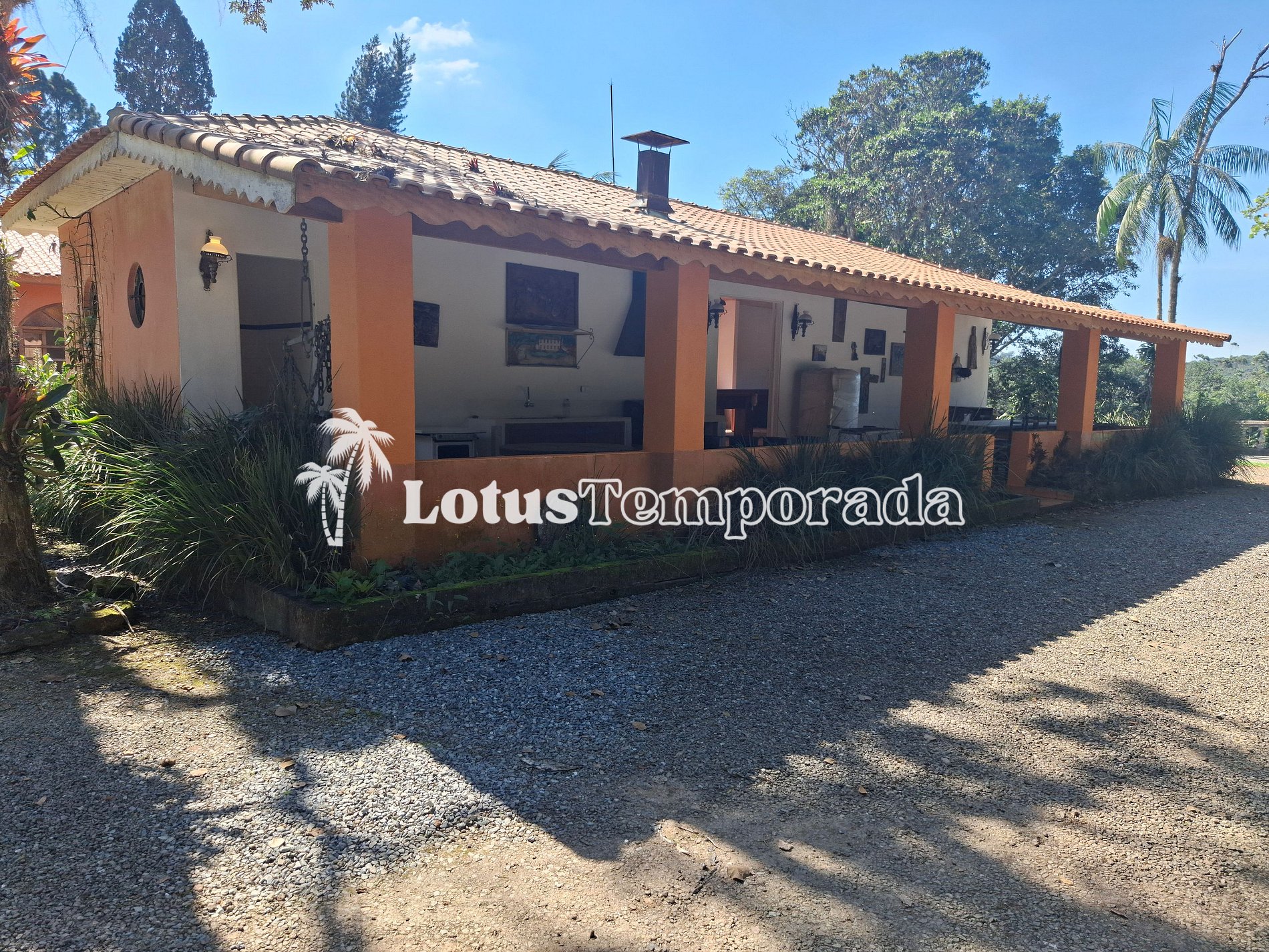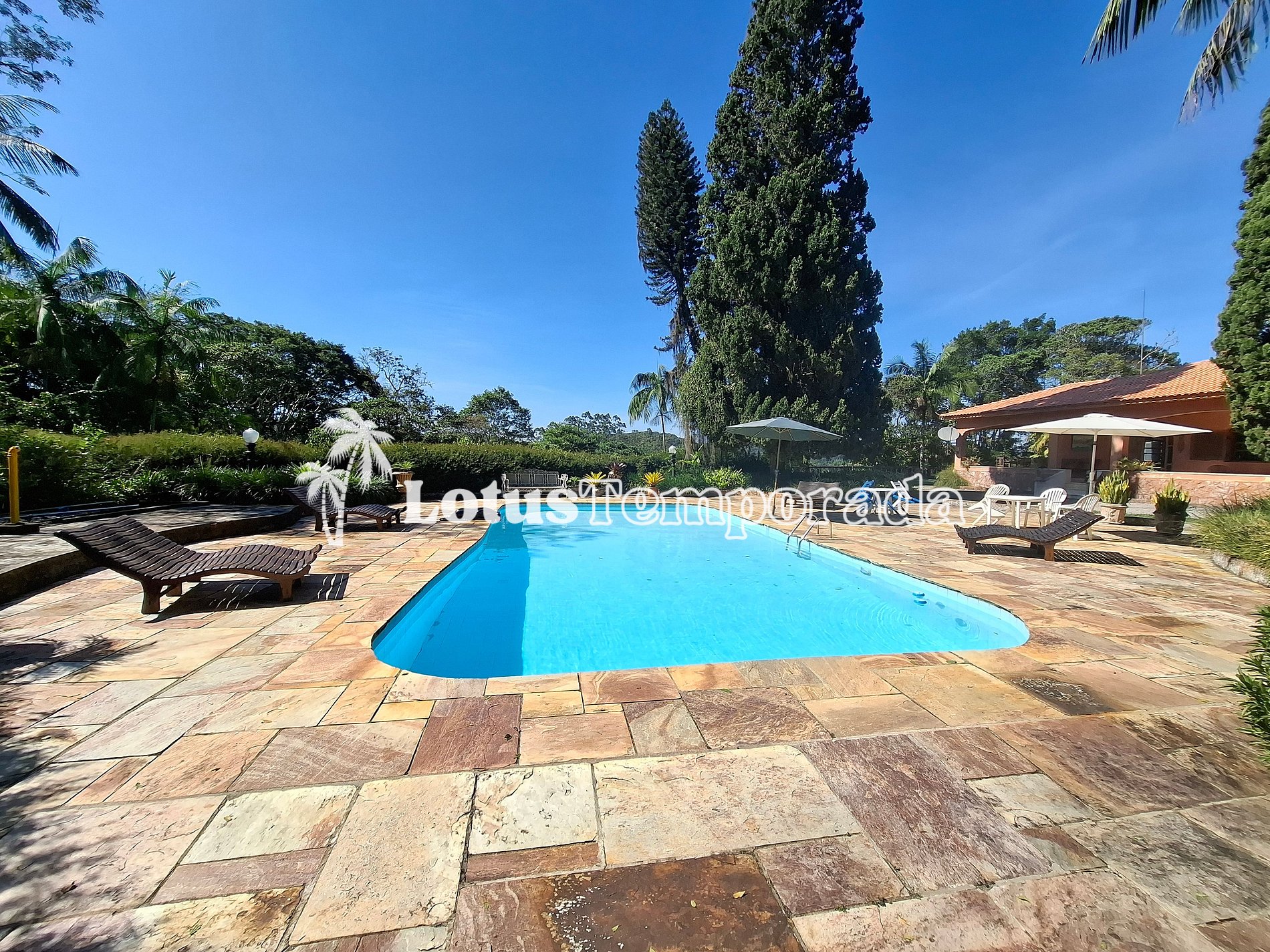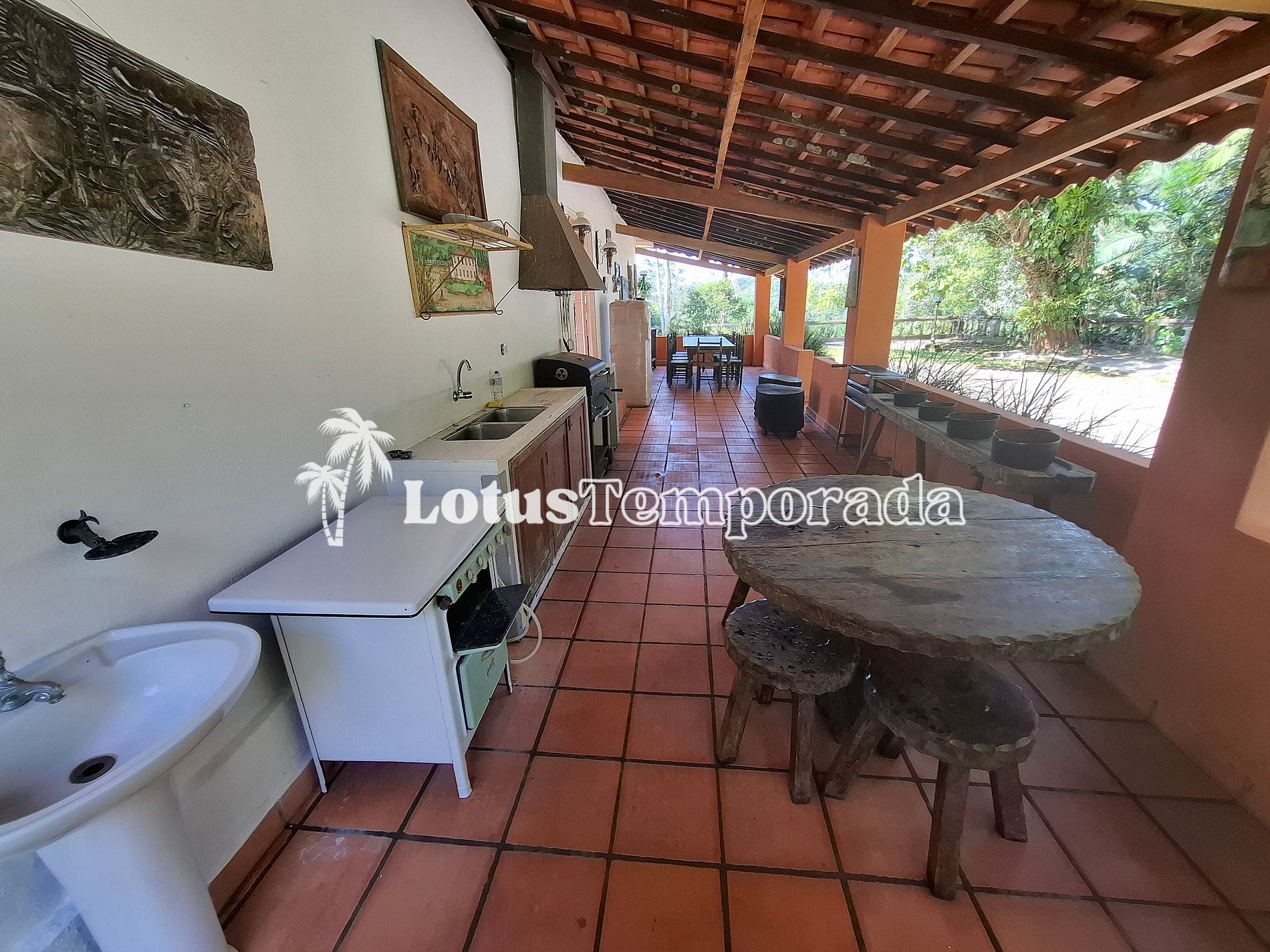 Com um toque rústico e acolhedor, o imóvel ainda conta com lavanderia ao ar livre, mais 1 geladeira, 1 freezer e uma mesa de apoio que leva a uma suíte externa. A área gourmet é completa, com 2 churrasqueiras móveis, mesas rústicas e lavabo. Tem também salão de jogos com mesa de sinuca e carteado, que dá acesso à quinta suíte.