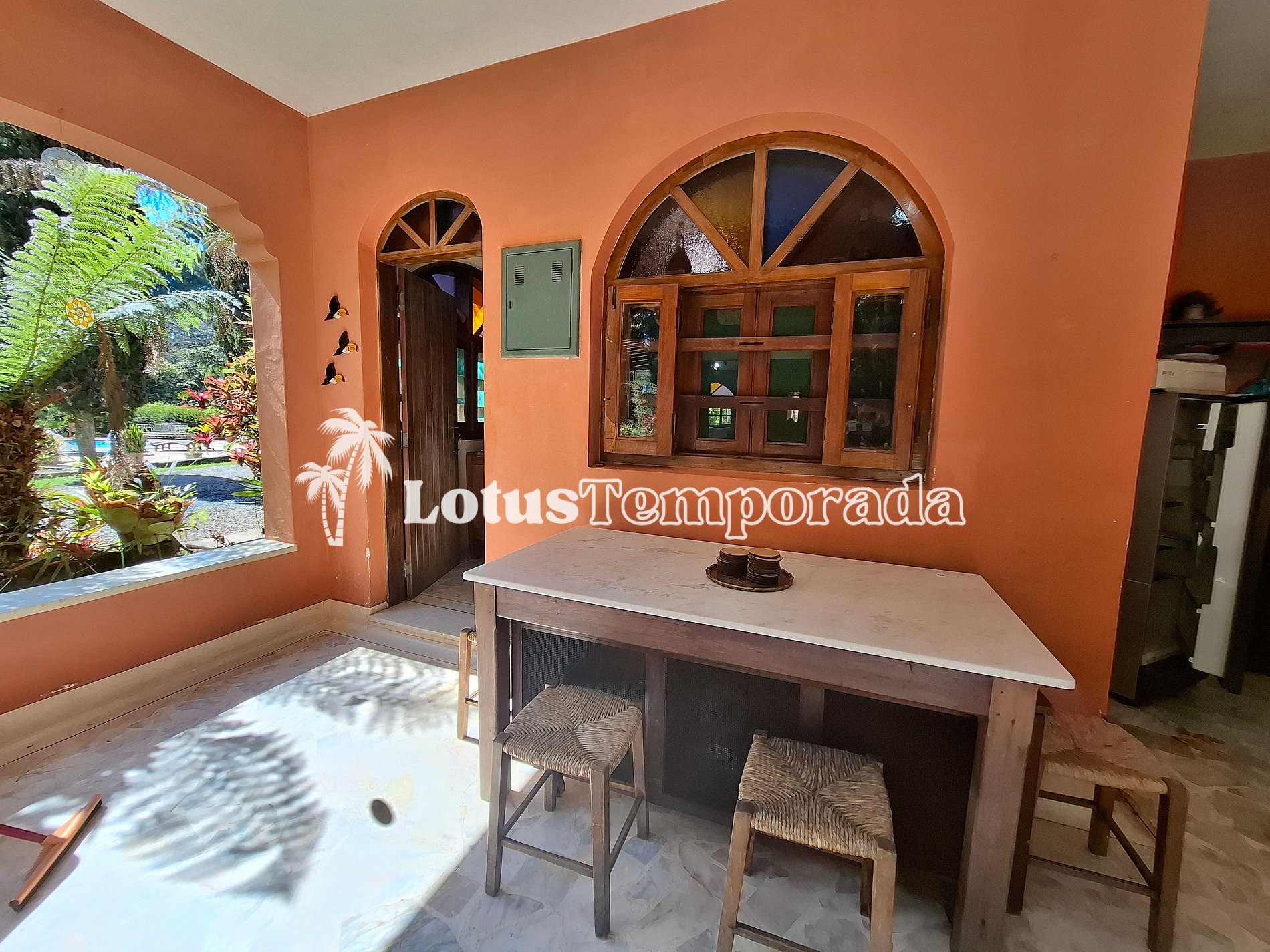 • Varanda de frente a piscina com mesas e cadeiras;