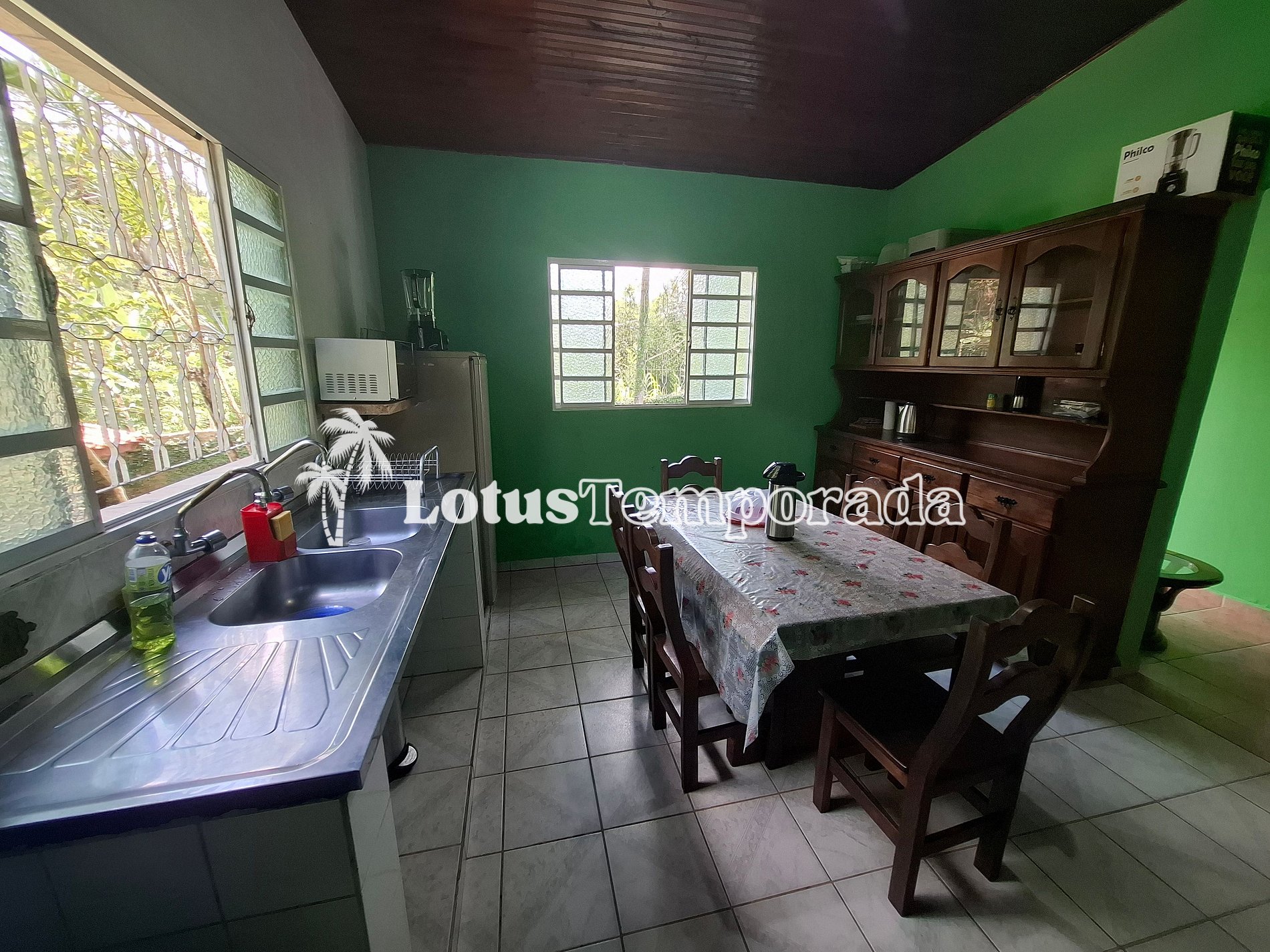 • Cozinha equipada com pia, geladeira, fogão de 5 bocas com forno, mesa de jantar e armário com utensílios básicos para preparar suas refeições com praticidade.