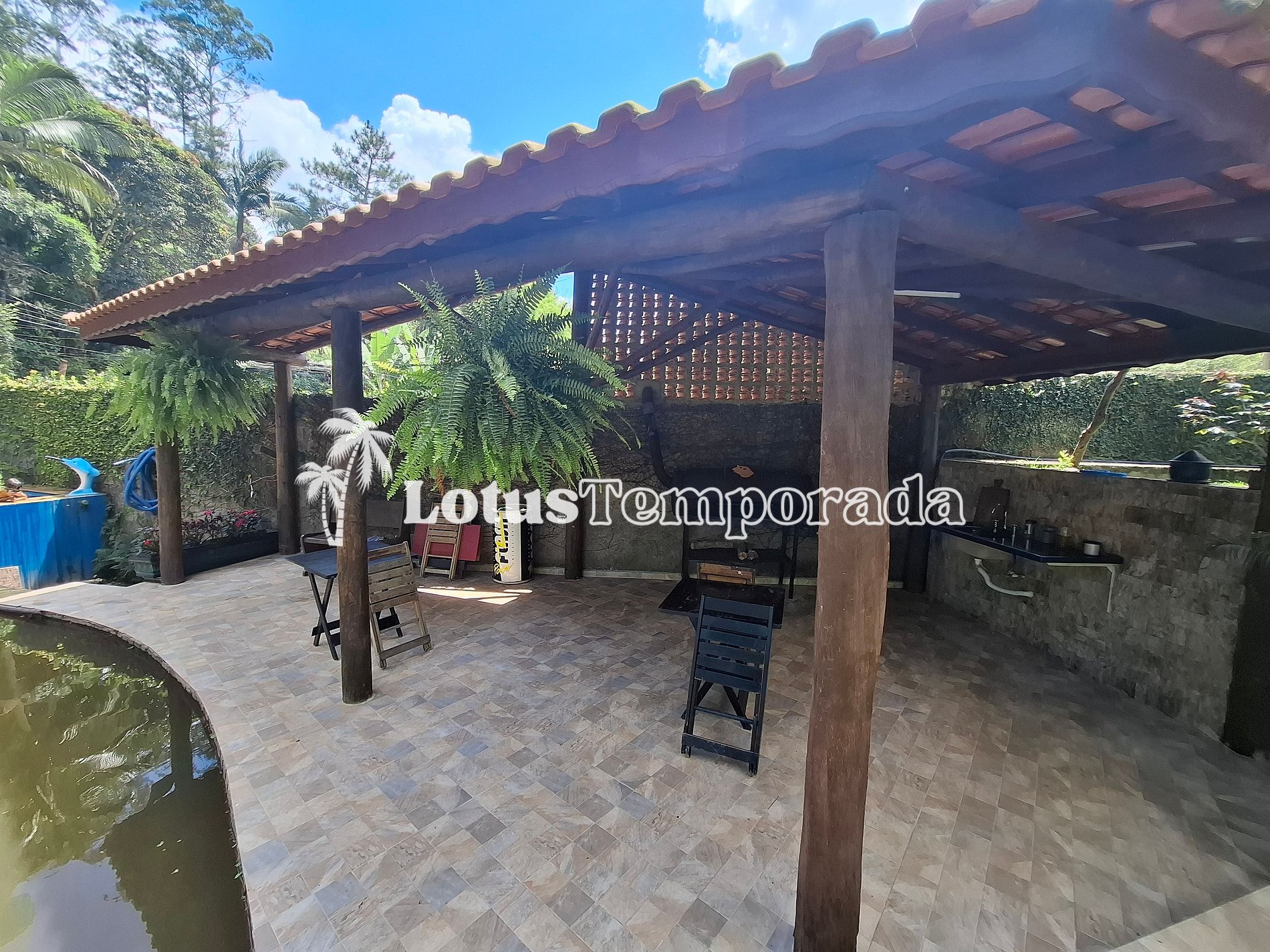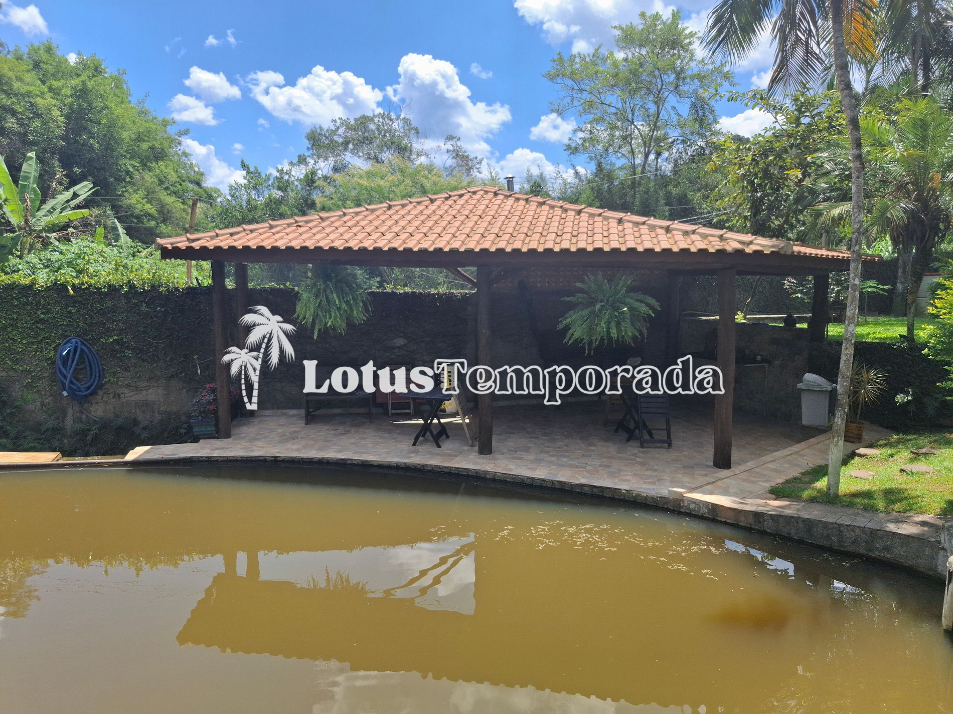 • Quiosque com churrasqueira a bafo, pia, mesas e cadeiras a beira do lago,
