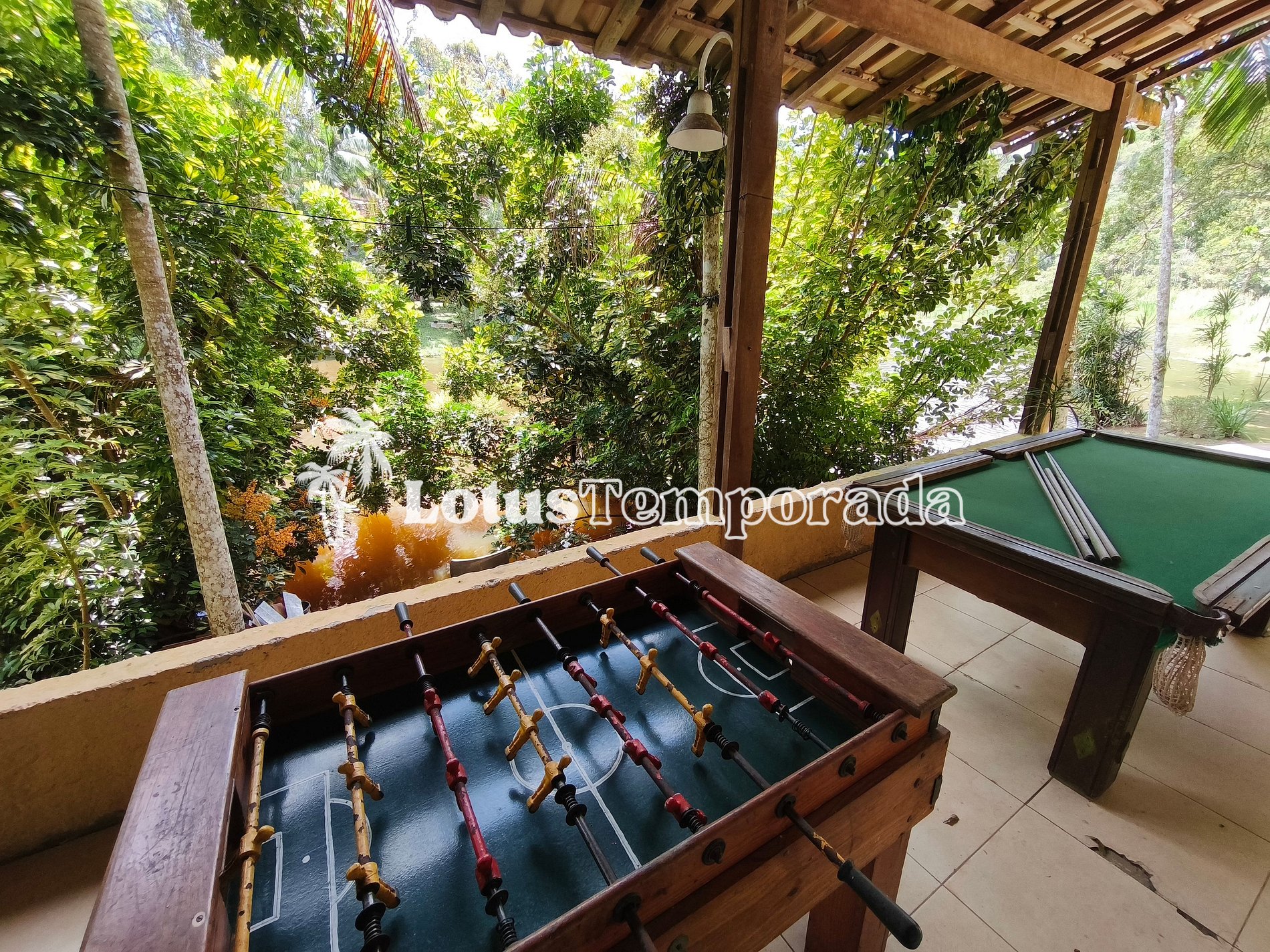 A área gourmet é integrada ao espaço de descanso e dispõe de uma churrasqueira, pia e mesas grandes para refeições. O salão de jogos, com mesa de sinuca e pebolim, é uma ótima opção de diversão, enquanto a área de convivência e o espaço de fogueira com bancos de alvenaria proporcionam momentos únicos com uma vista privilegiada do lago. Para os amantes de esportes, a chácara oferece um campo de vôlei gramado.