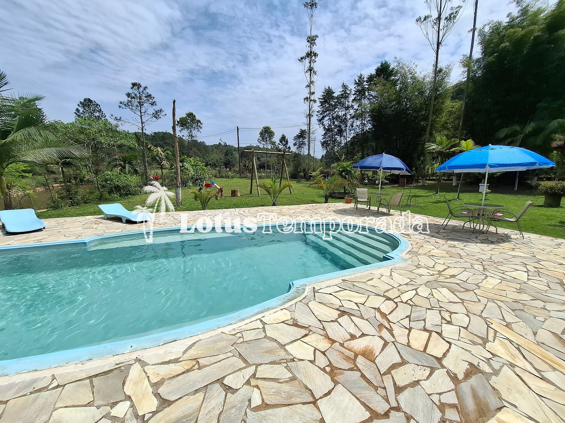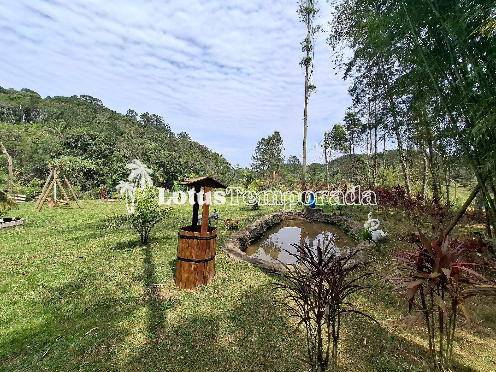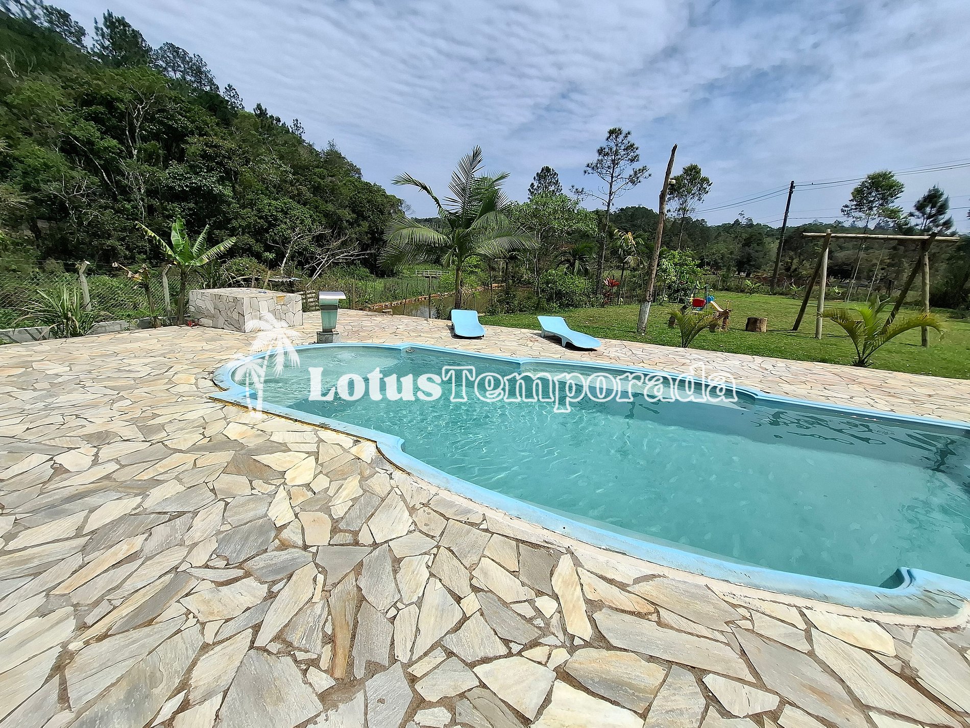 Chácara completa com 4 suítes, sala de TV, cozinha equipada, área gourmet com churrasqueira, forno e fogão a lenha. Piscina com cascata e prainha, playground, lagos ornamentais e área gramada. Acomoda até 20 pessoas com conforto.