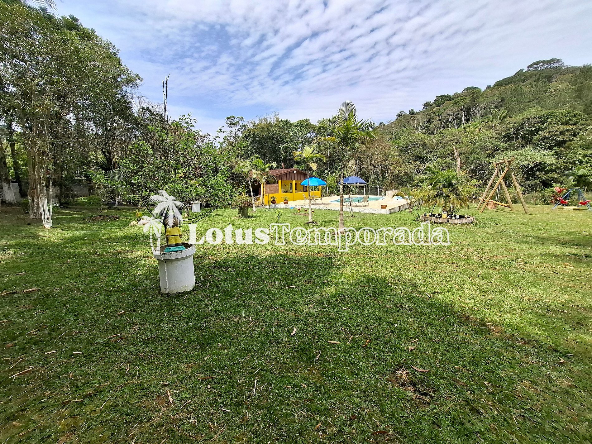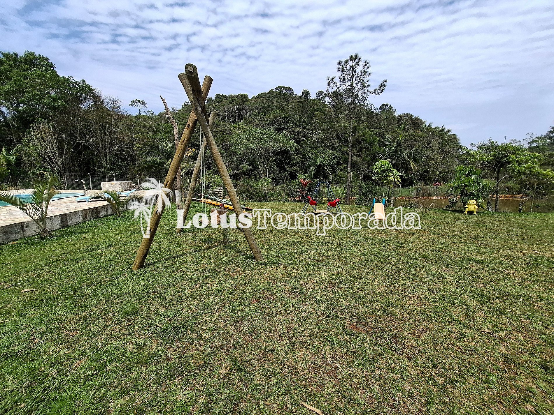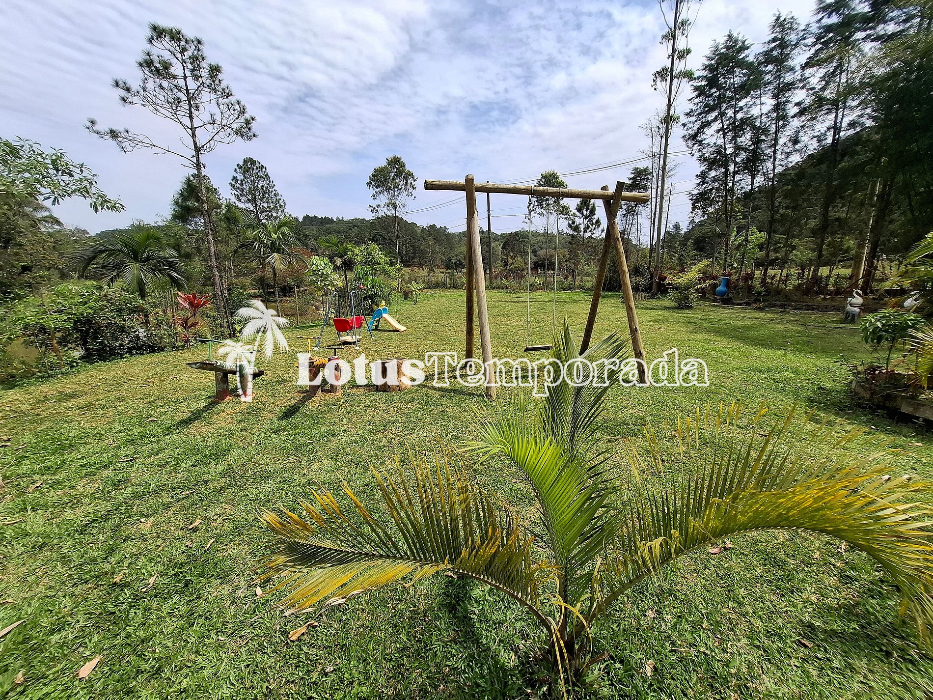 Chácara completa com 4 suítes, sala de TV, cozinha equipada, área gourmet com churrasqueira, forno e fogão a lenha. Piscina com cascata e prainha, playground, lagos ornamentais e área gramada. Acomoda até 20 pessoas com conforto.
